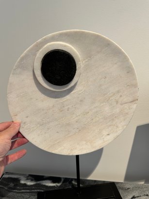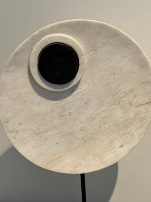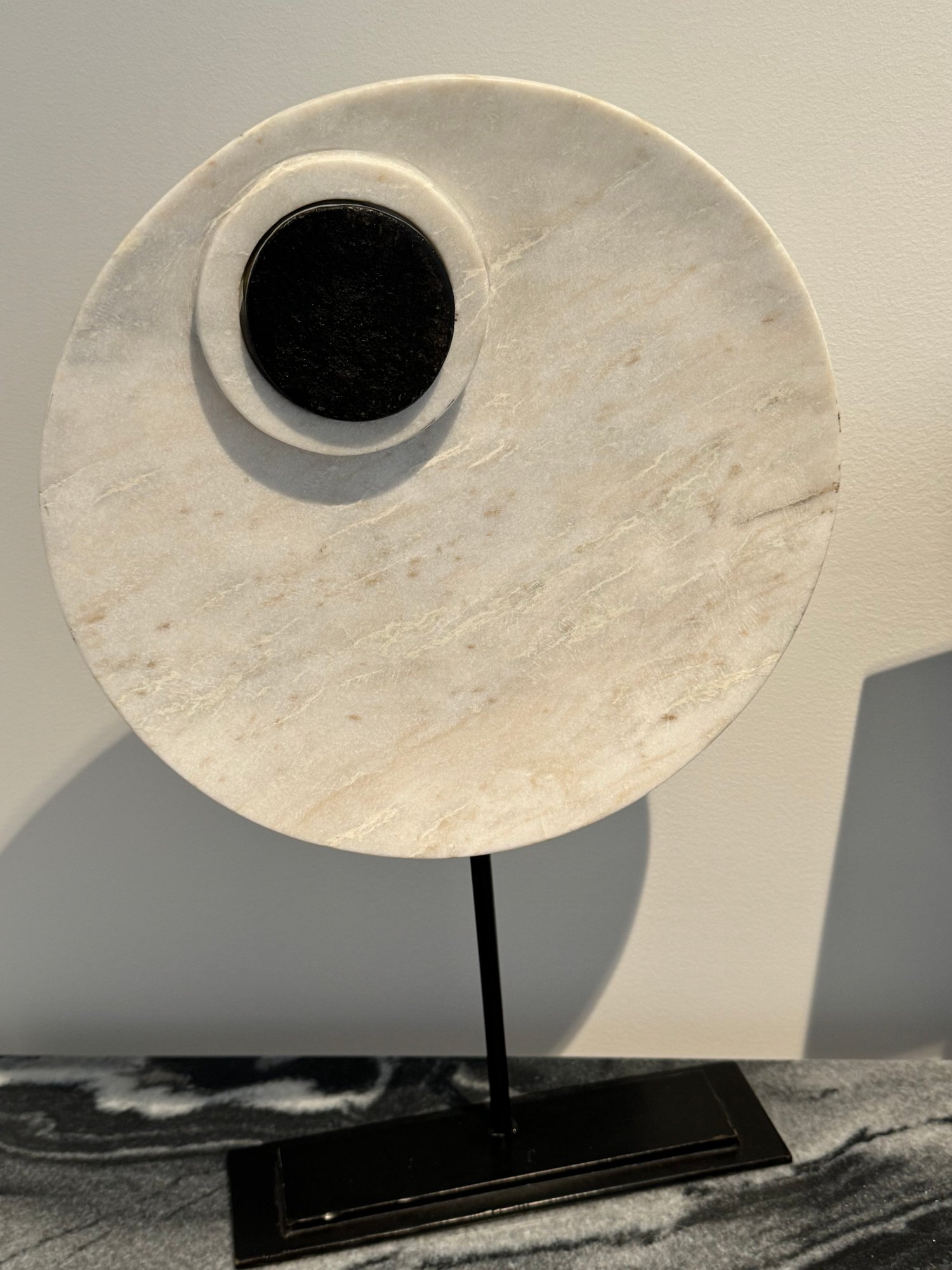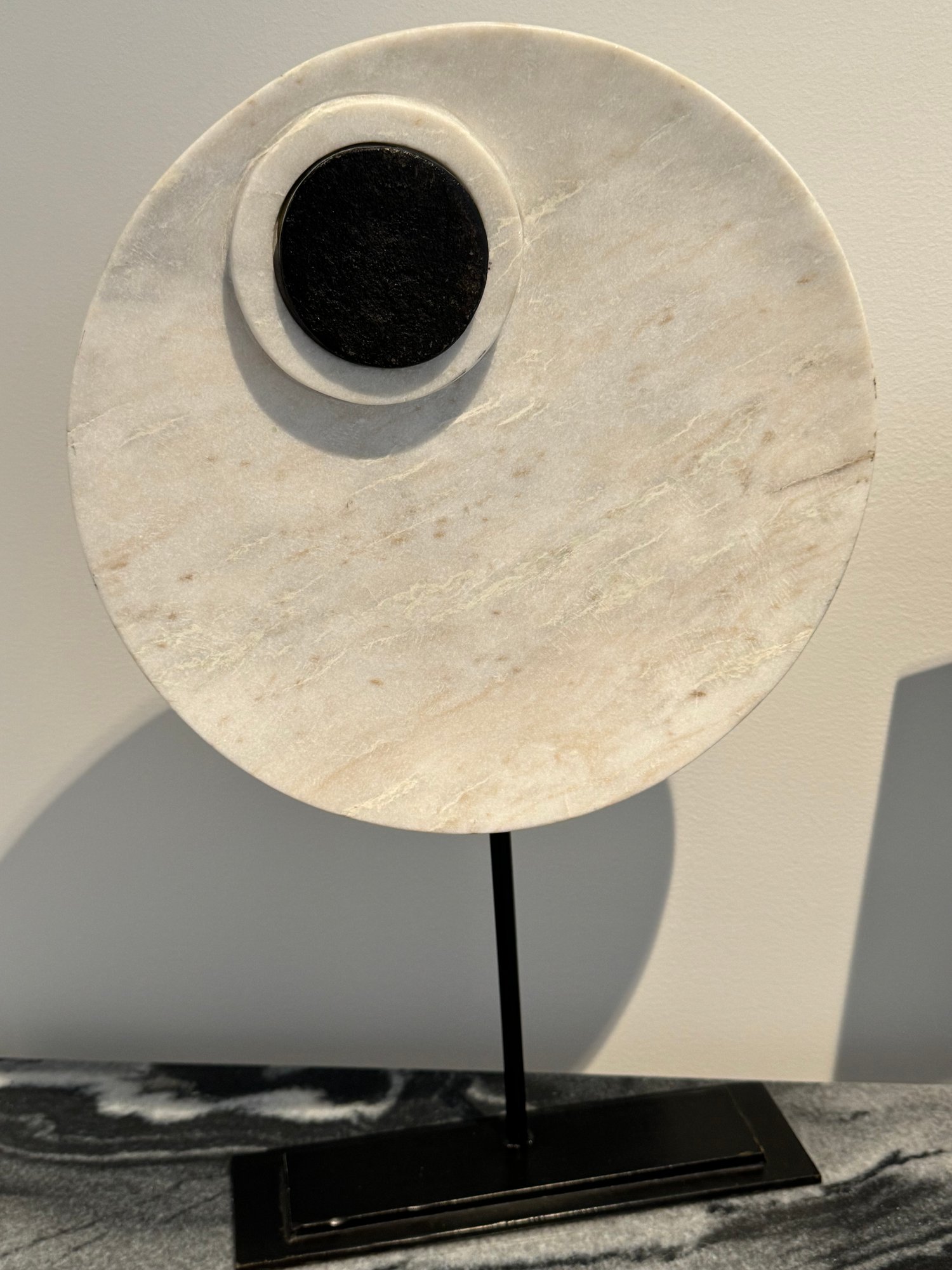 - Stone circles on a metal base that measures 11”W x 20”H