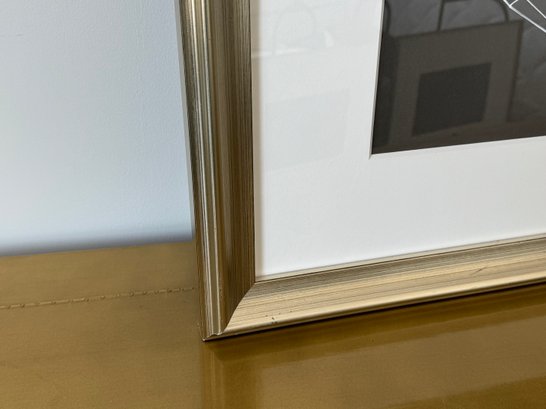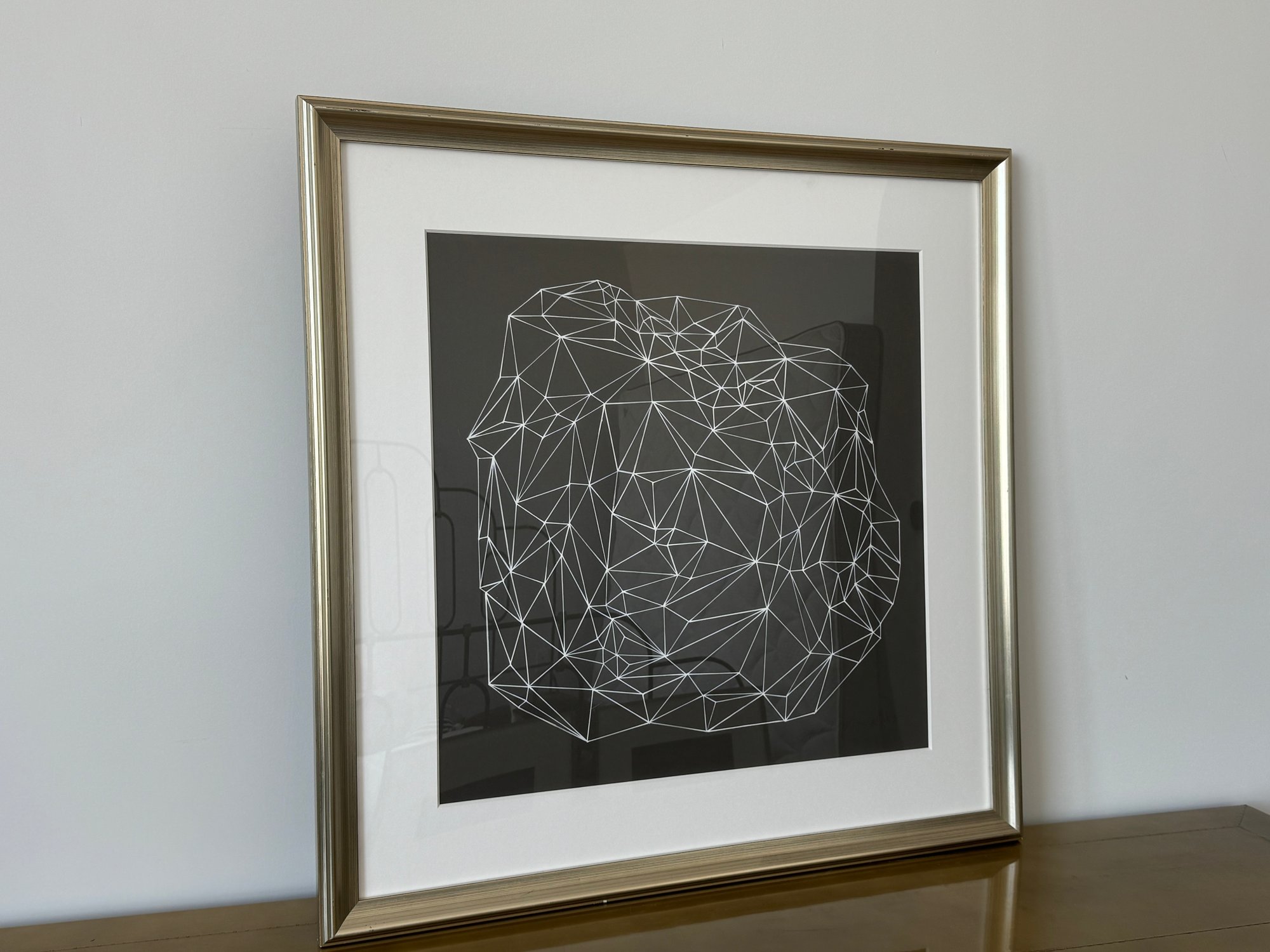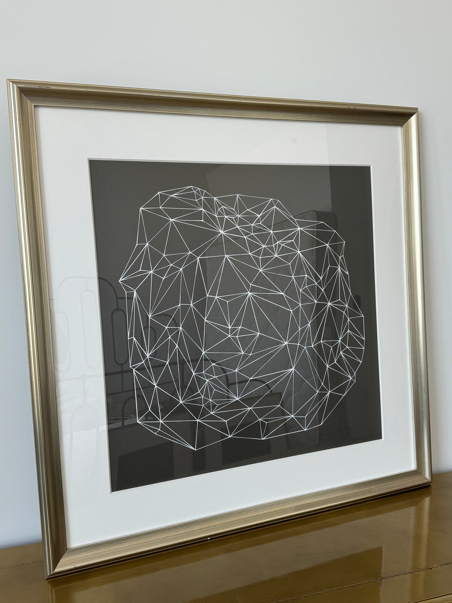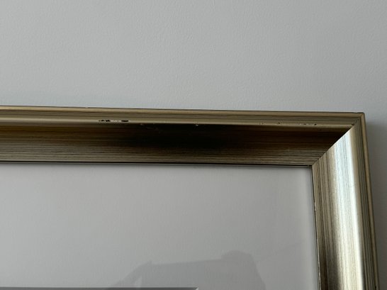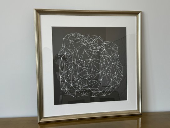 This beautiful piece is framed in silver-painted wood and measures 37.5” square.