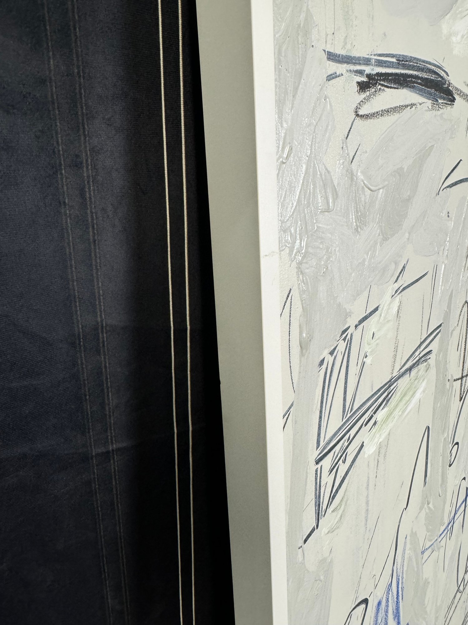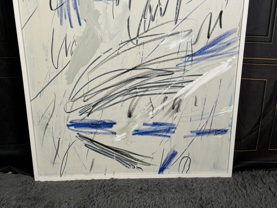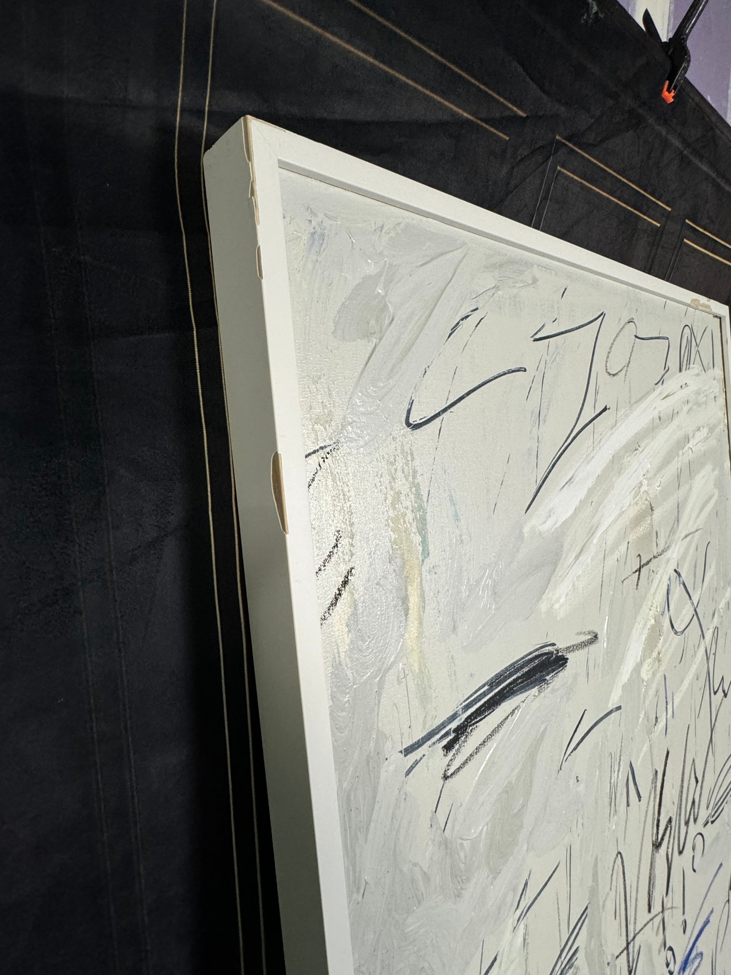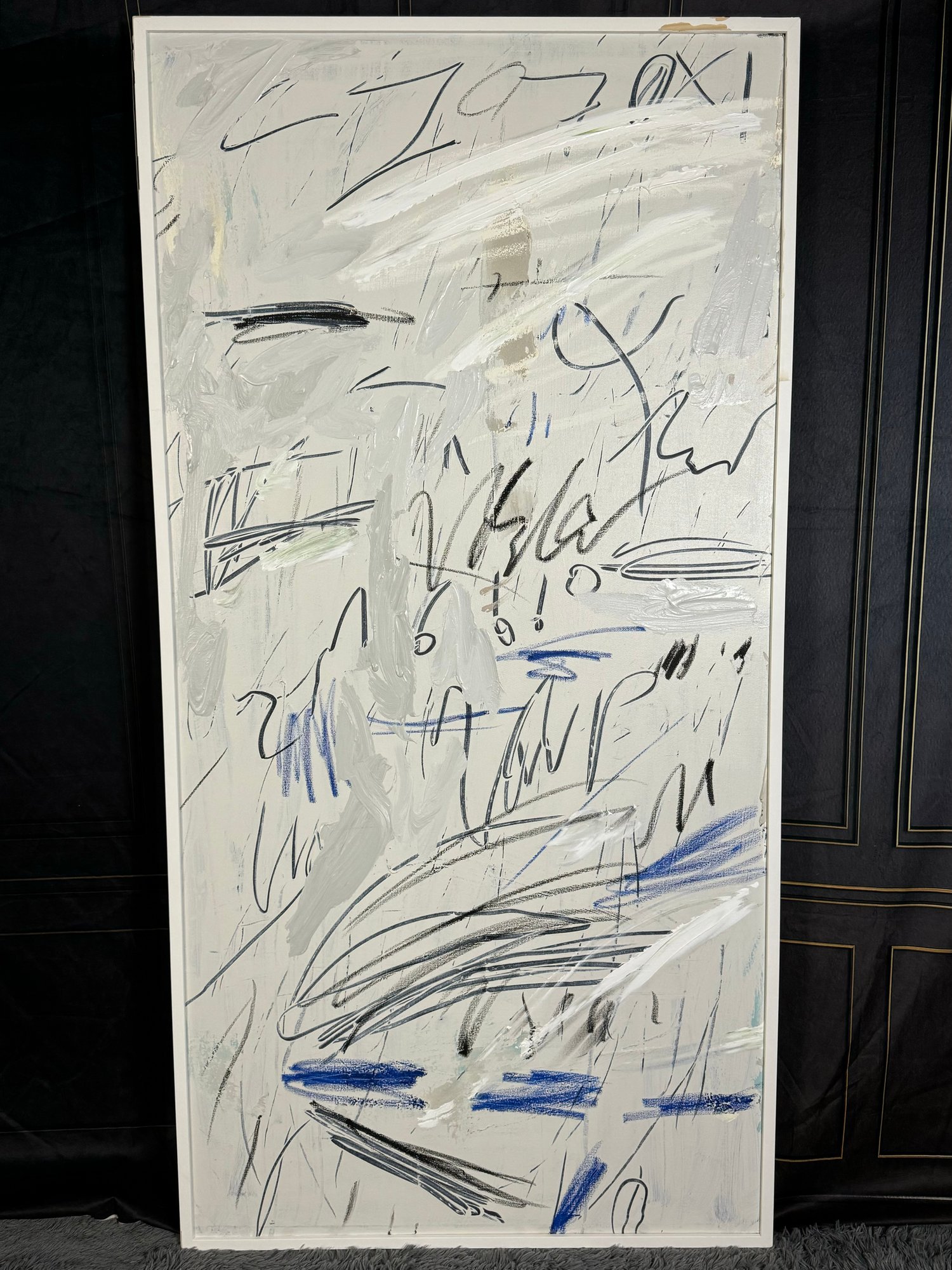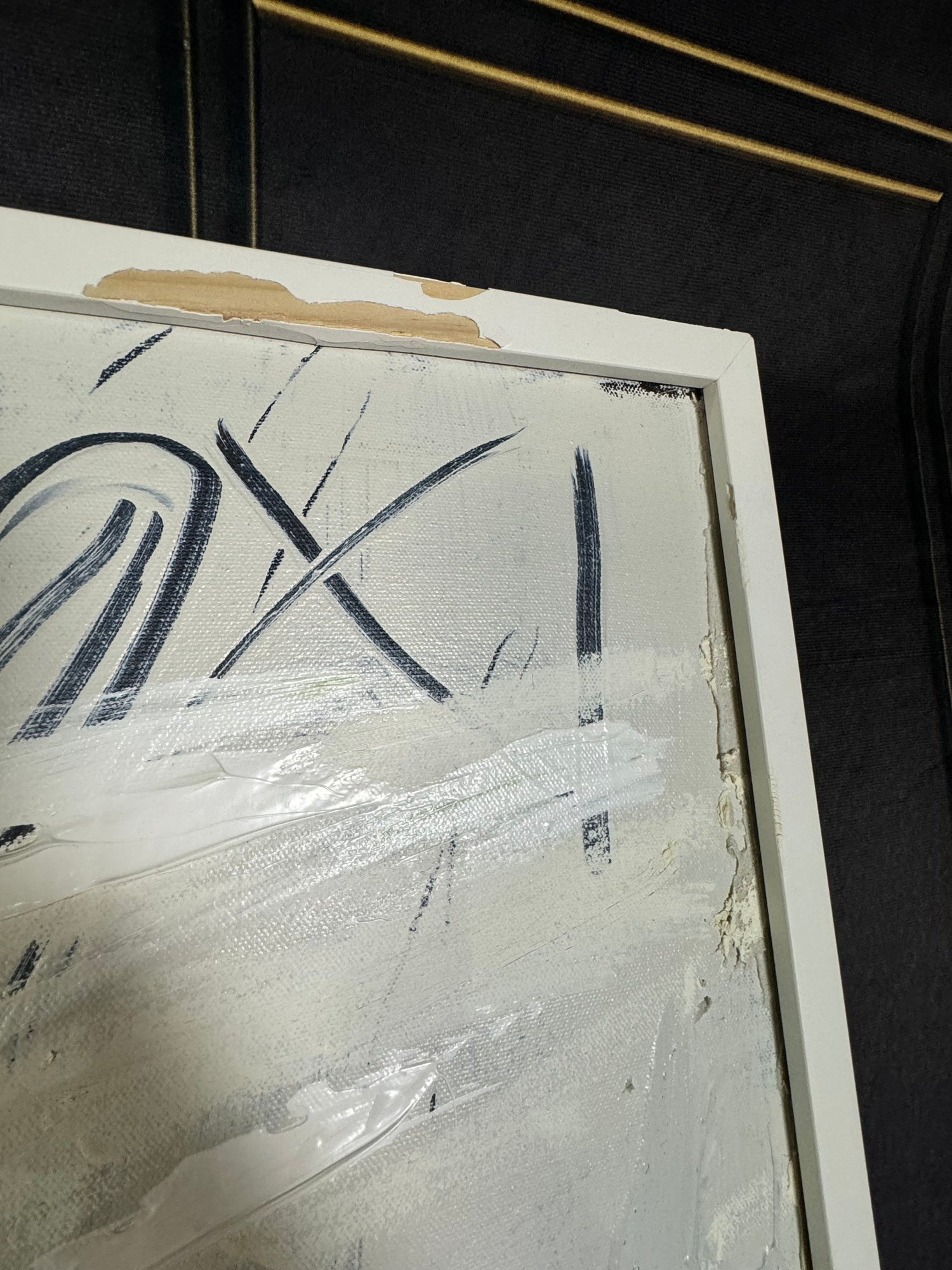 There is some damage to the painted white wood frame that is photo-documented. This piece measures 37”W by 73.5”H.