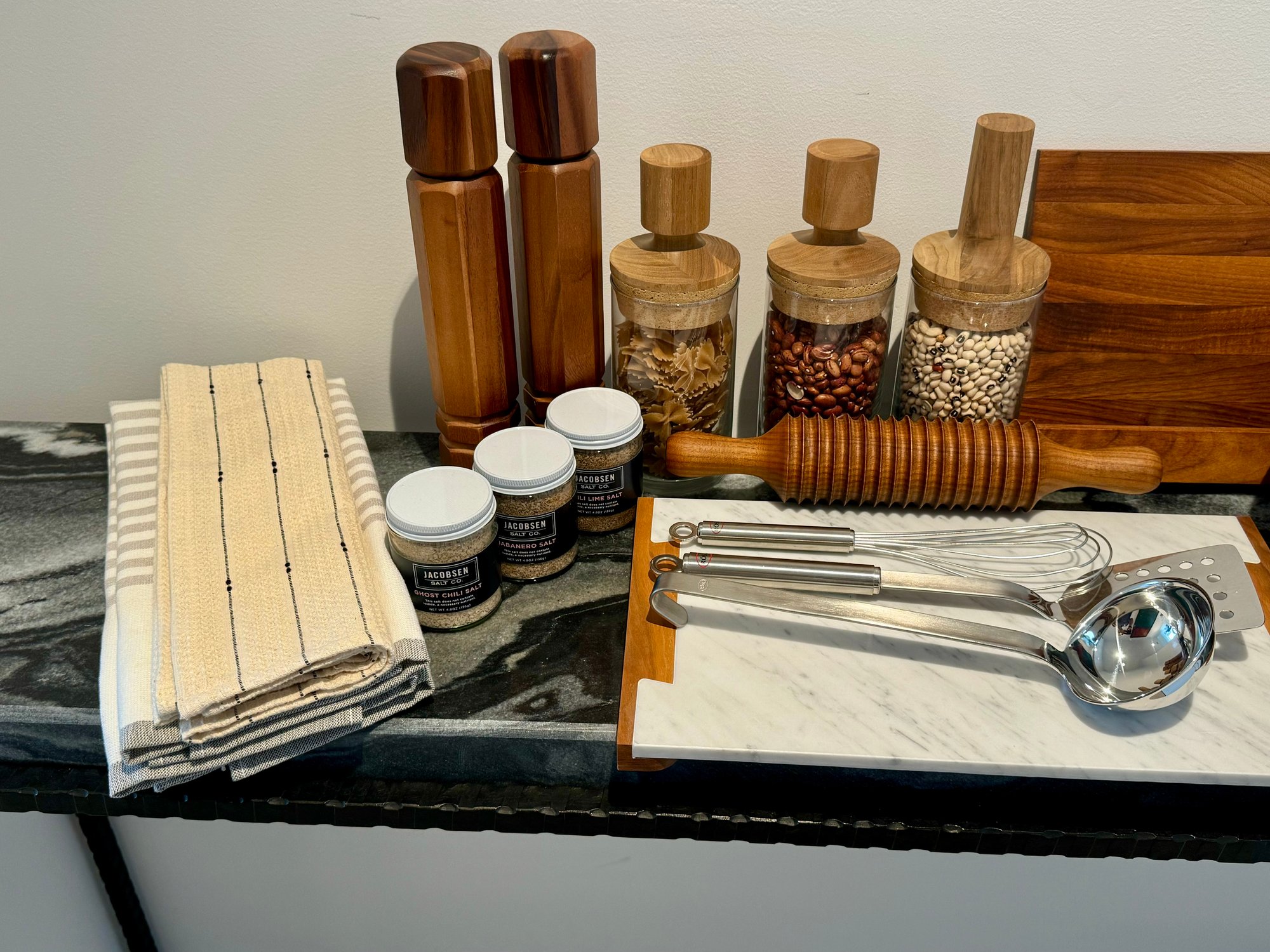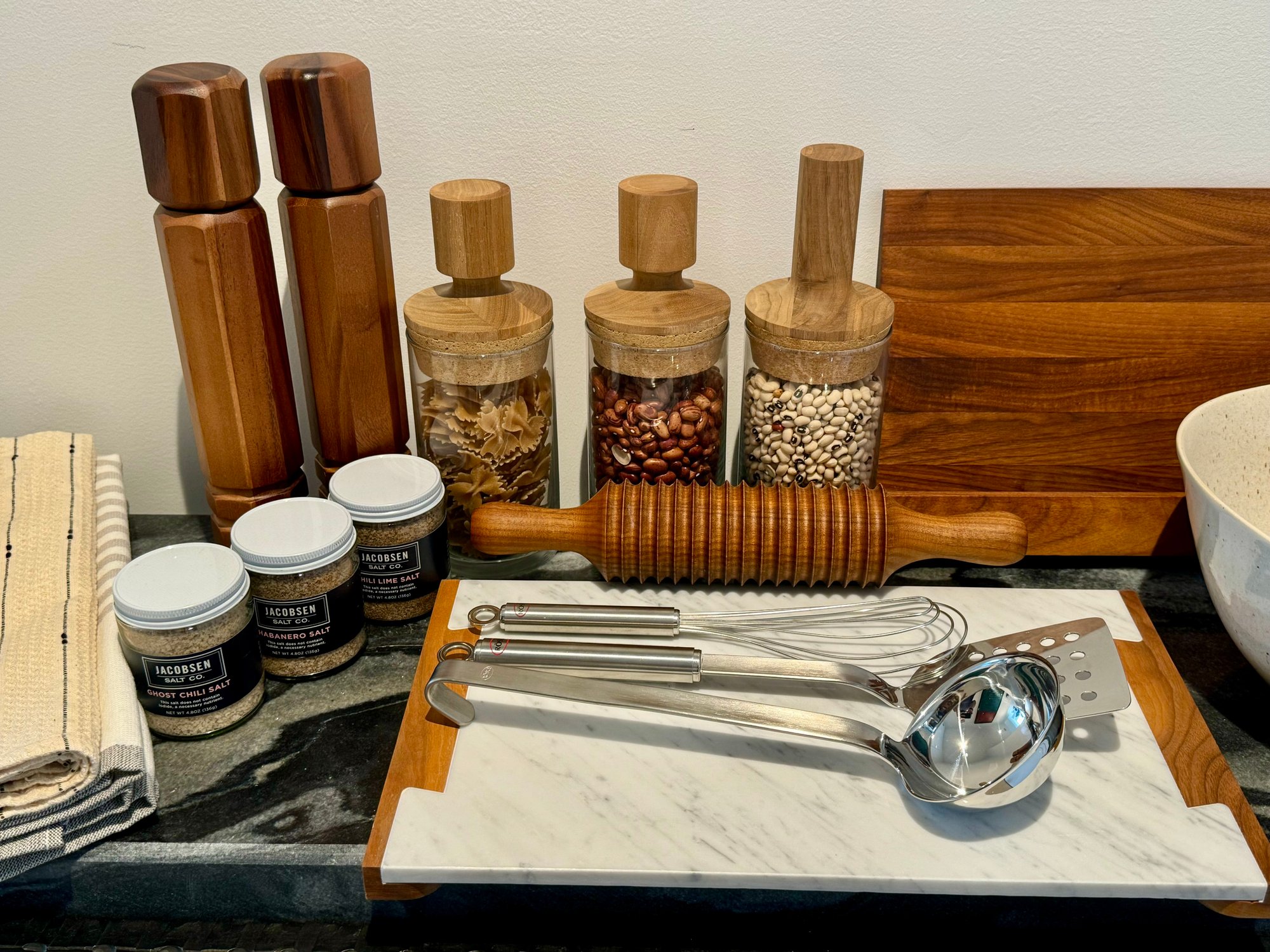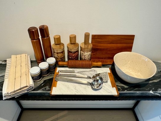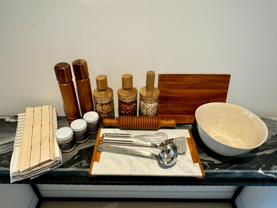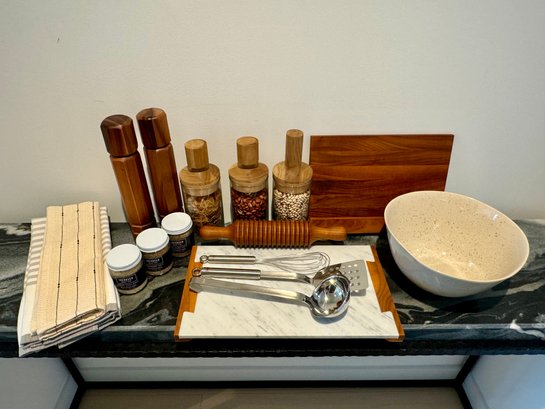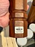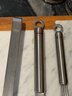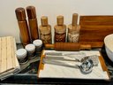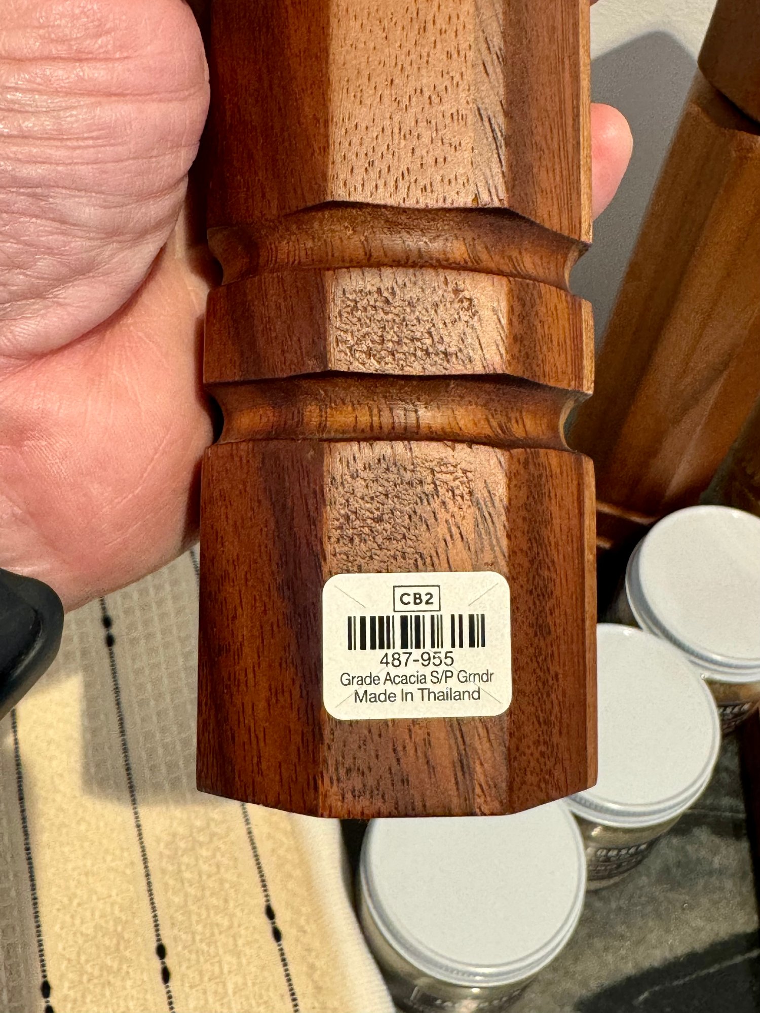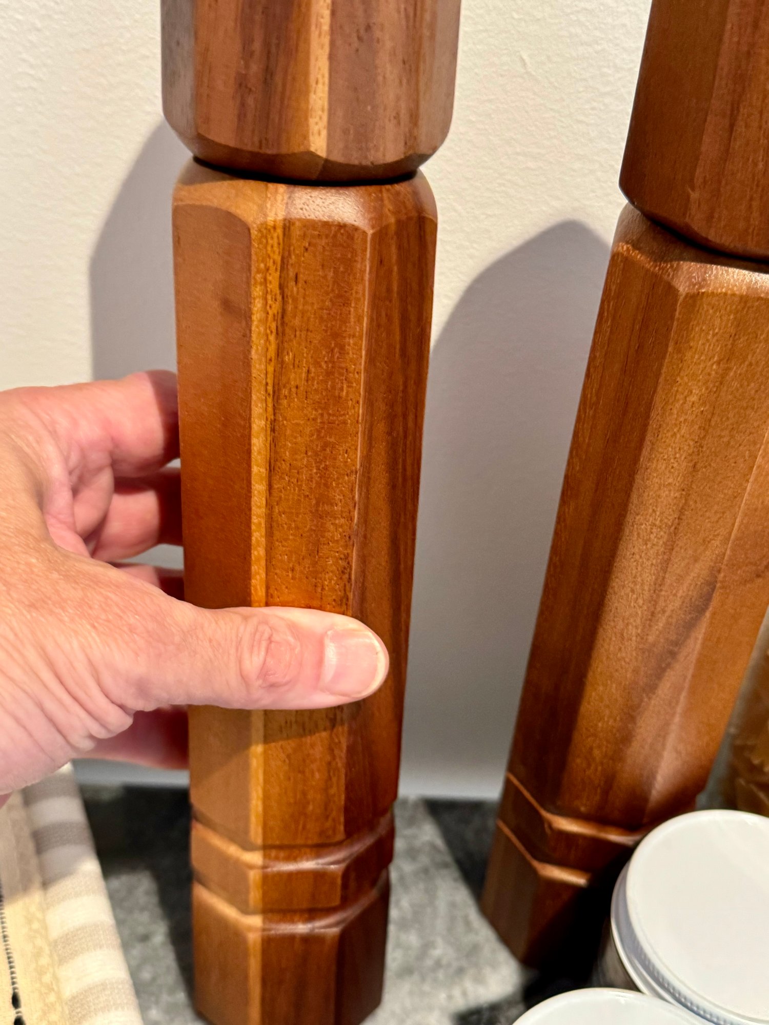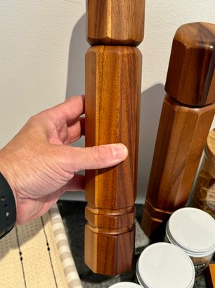 - Pair of CB2 Grade Acacia salt & pepper grinders that measure 12” tall