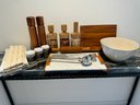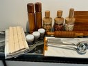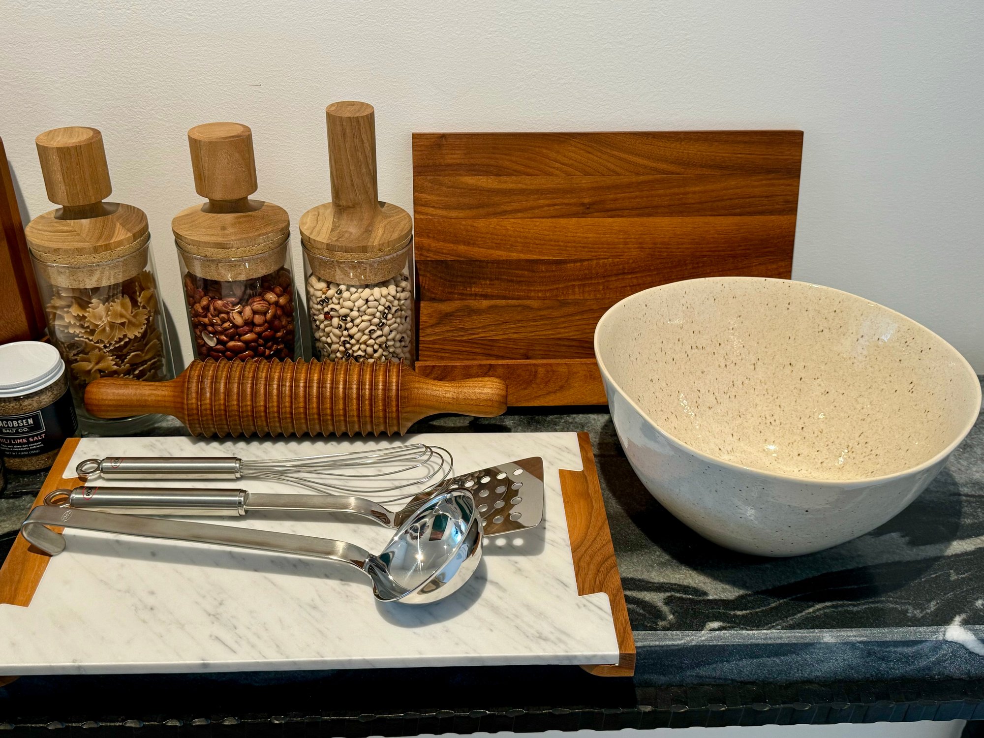 - Three wood & glass dry storage containers that measure 9.5”H x 4.5”D