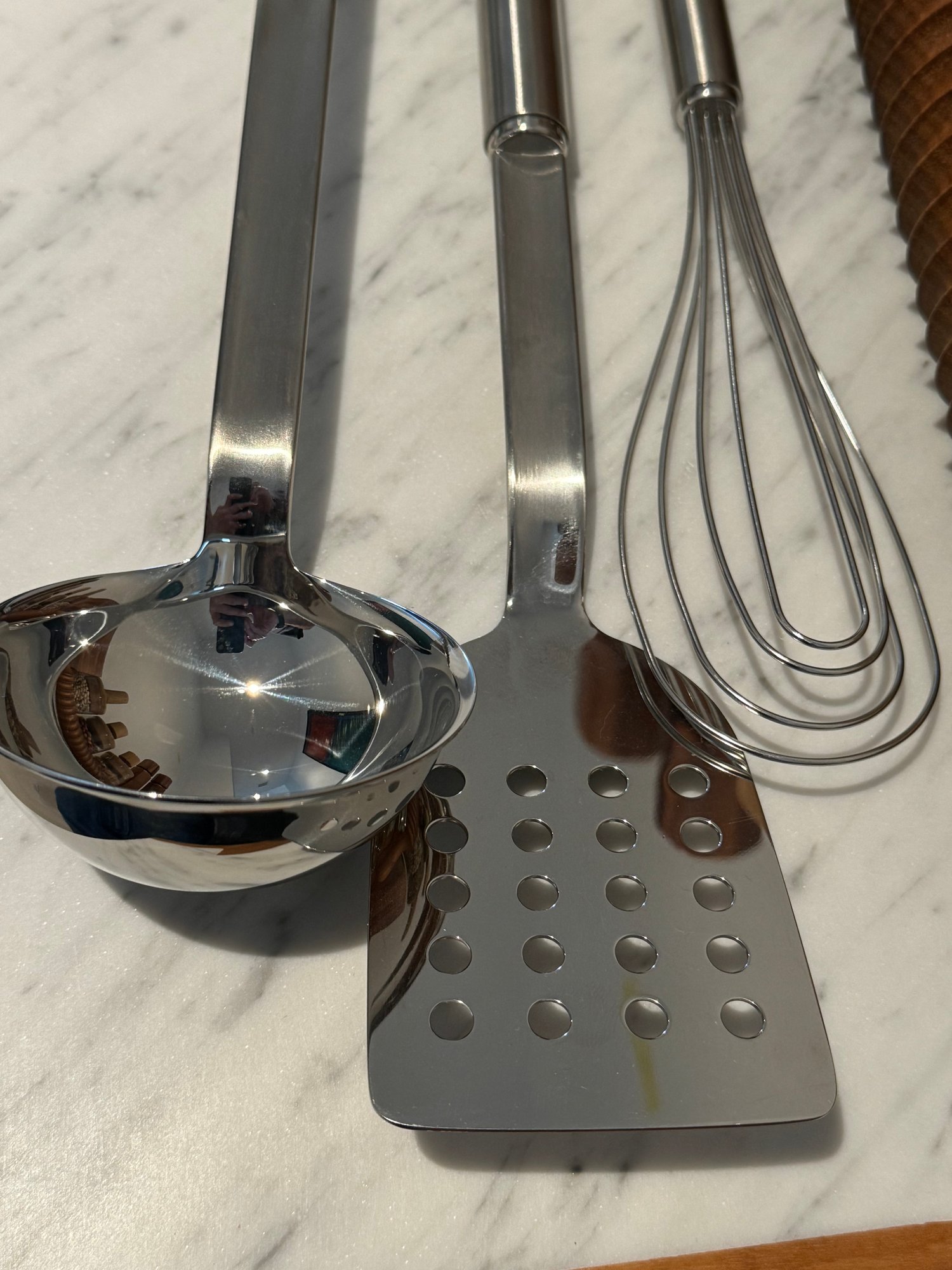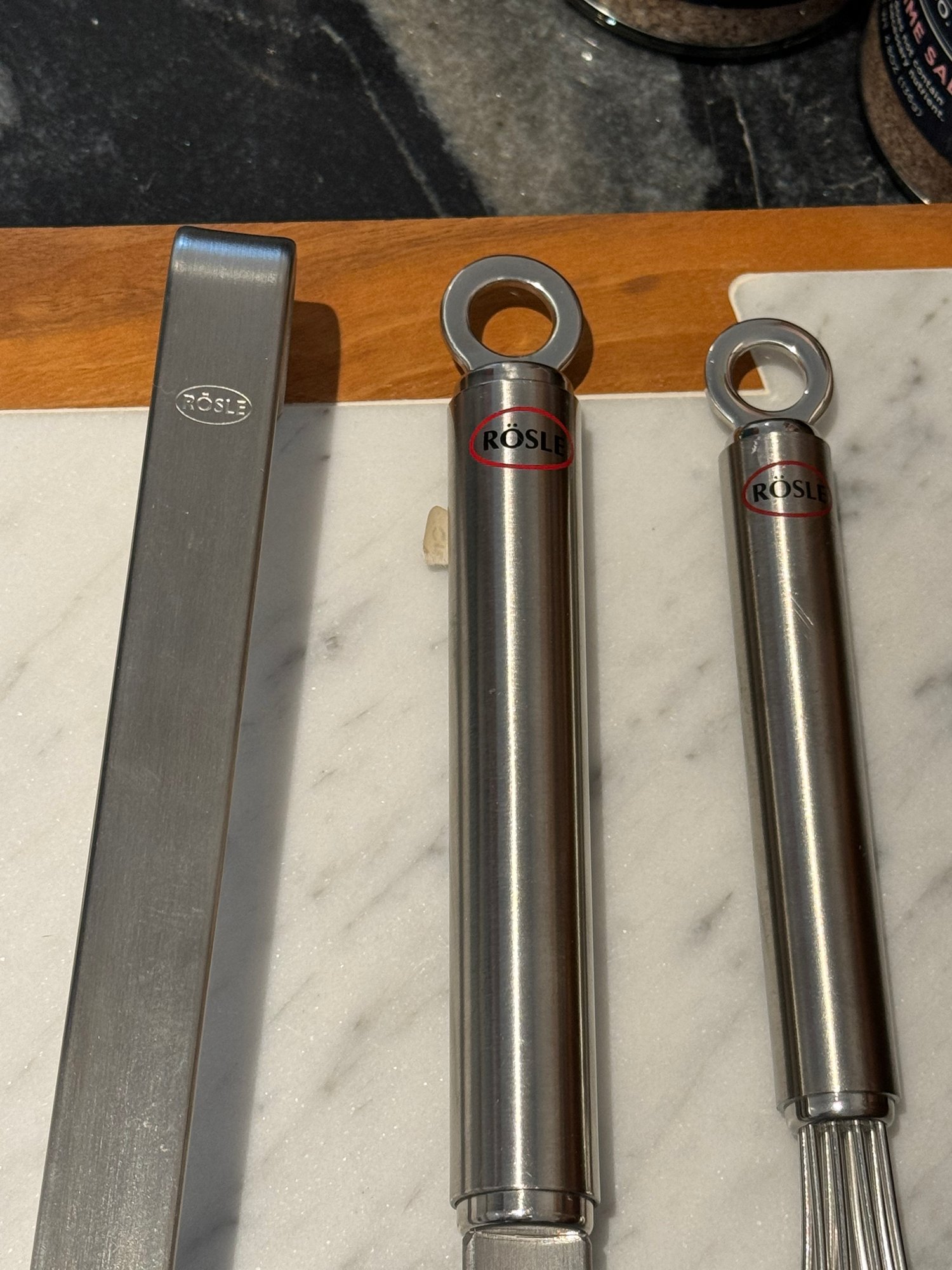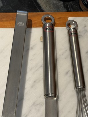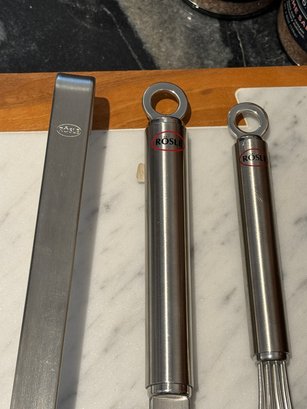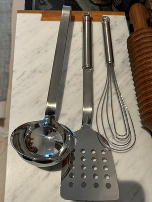 - Three metal Rosle kitchen tools - ladle, spatula & whisk