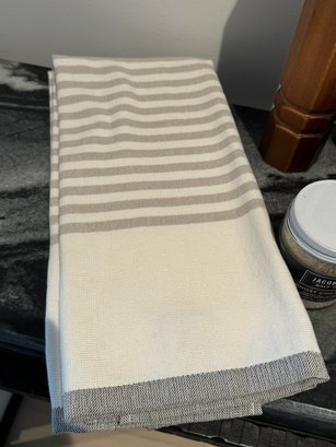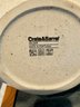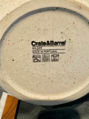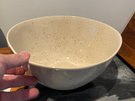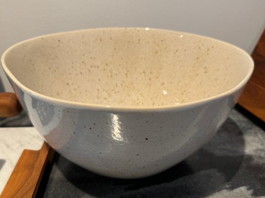 - A Crate & Barrel cream & tan ceramic bowl that measures 10”D x 5”