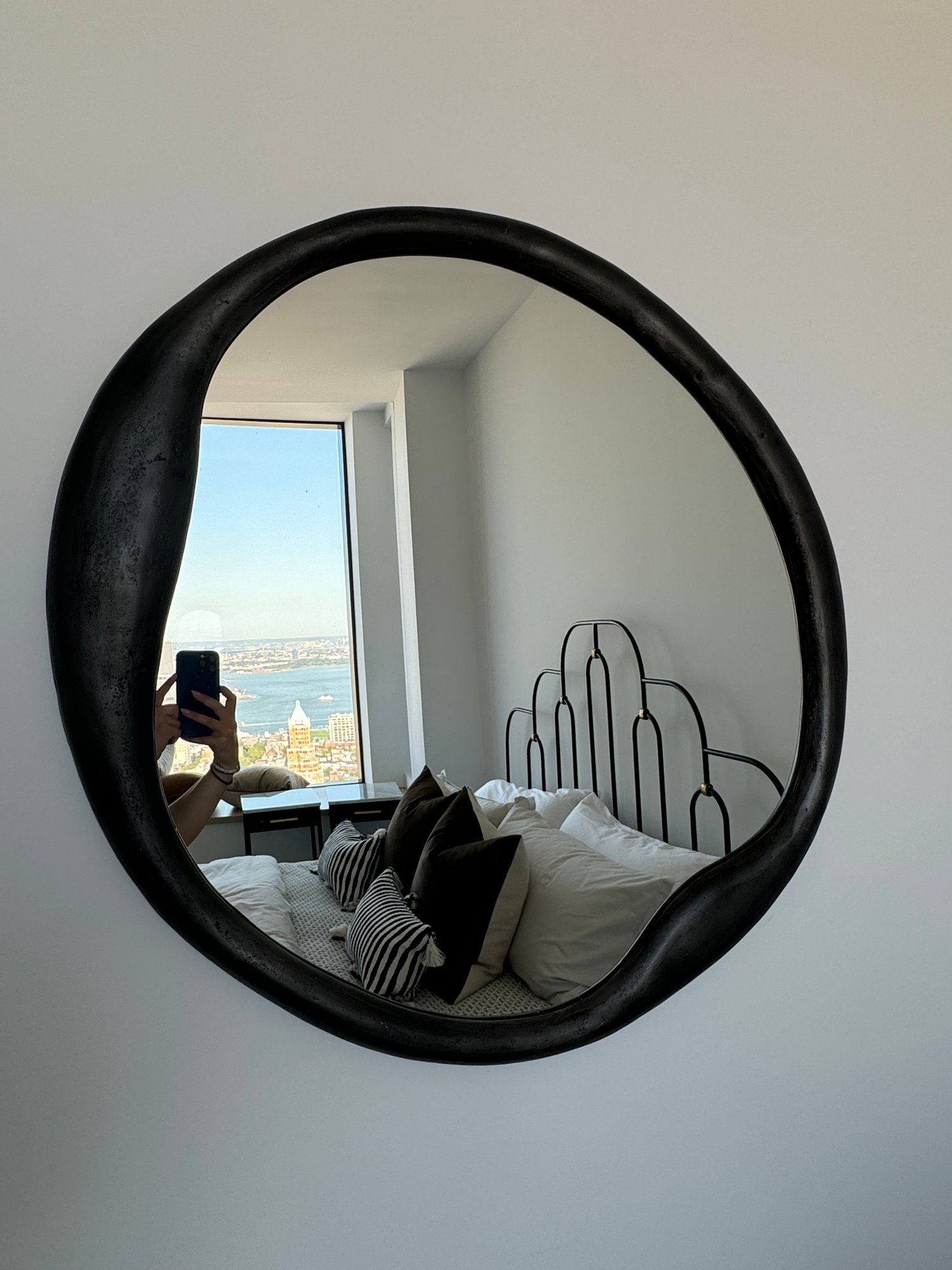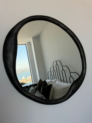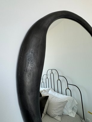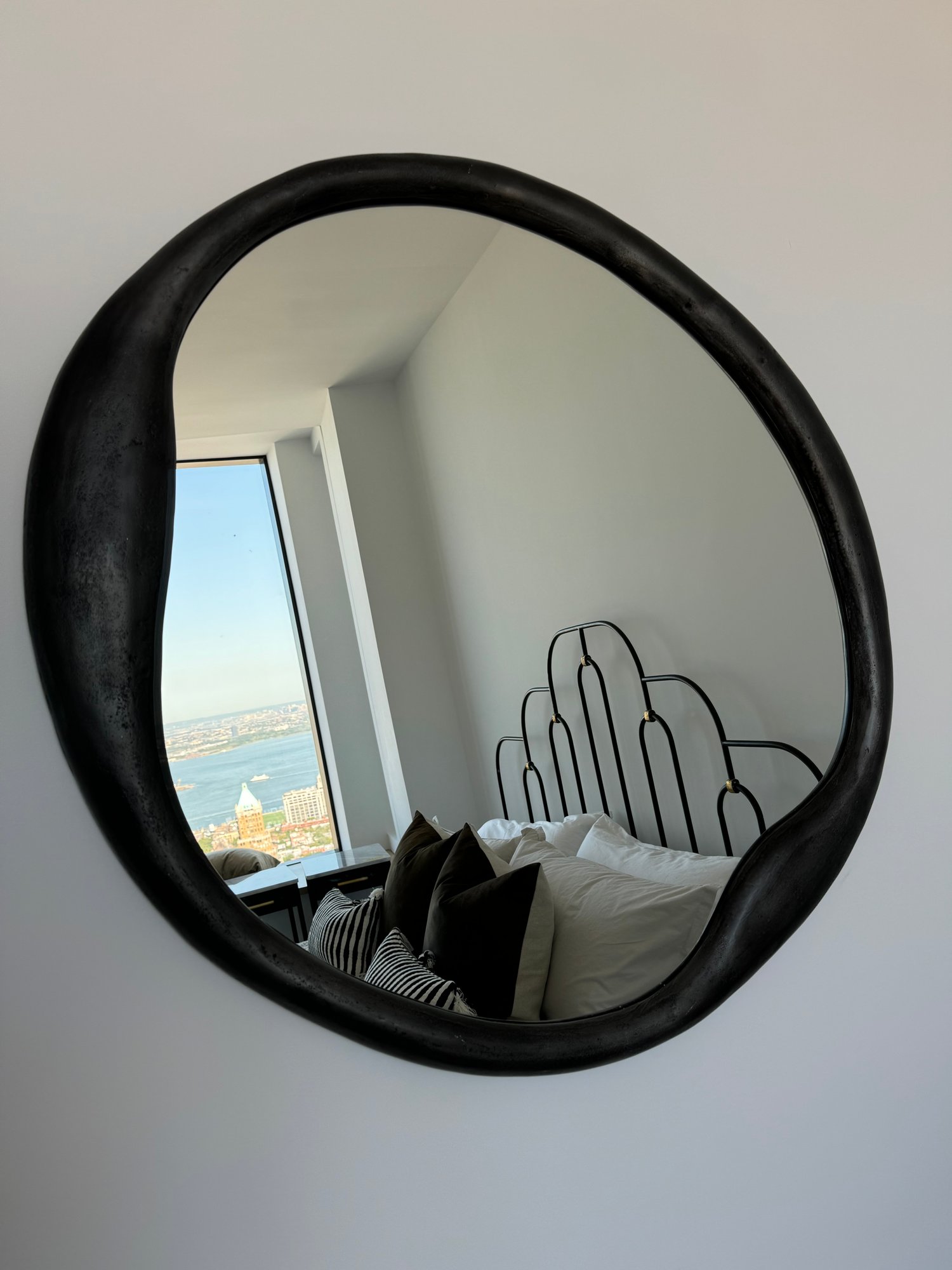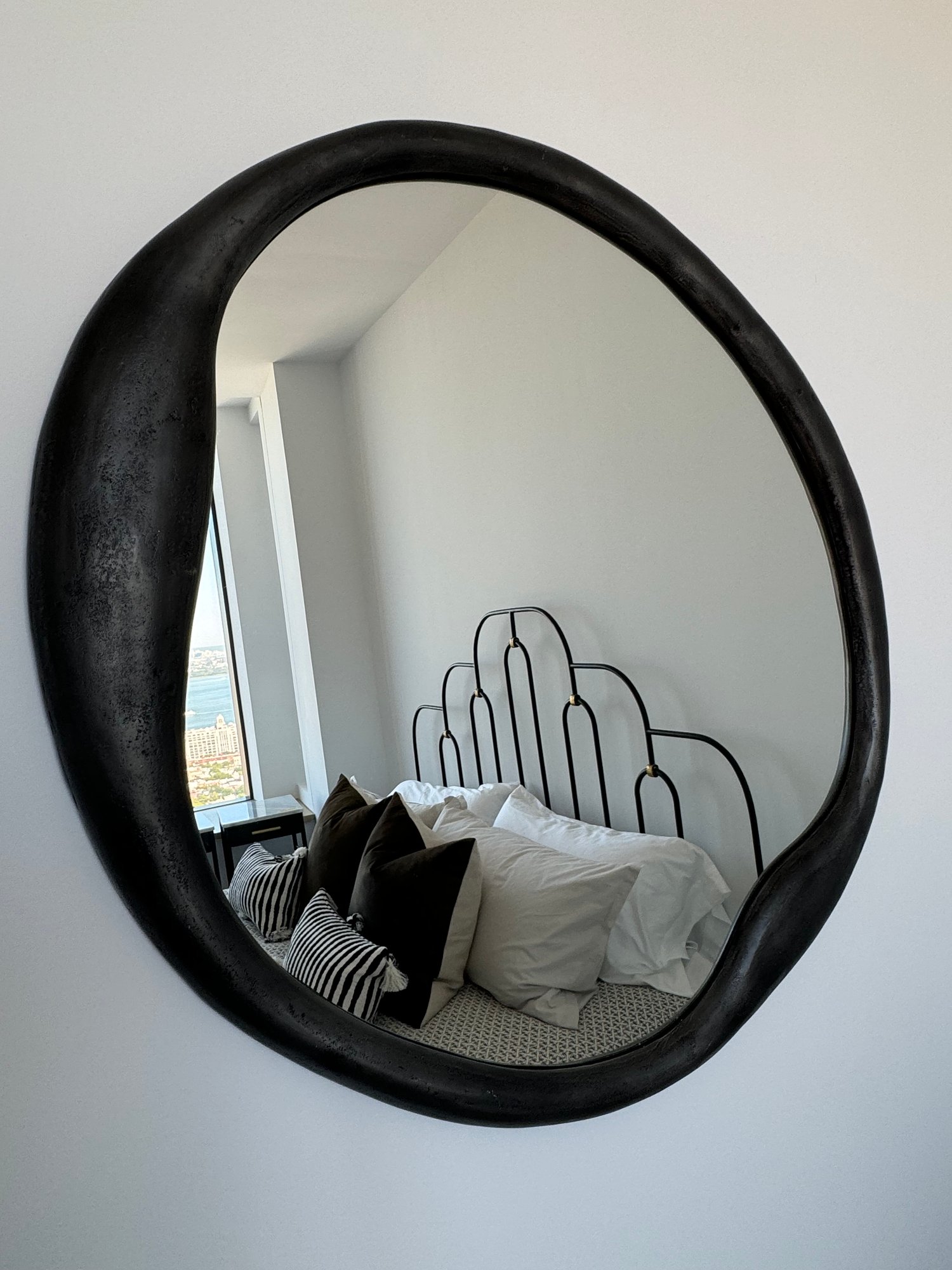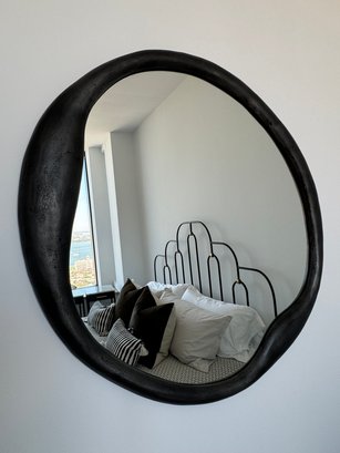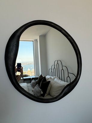 This unique shaped mirror measures 34.5” by 34” and has a neat distressed finish to the metal.