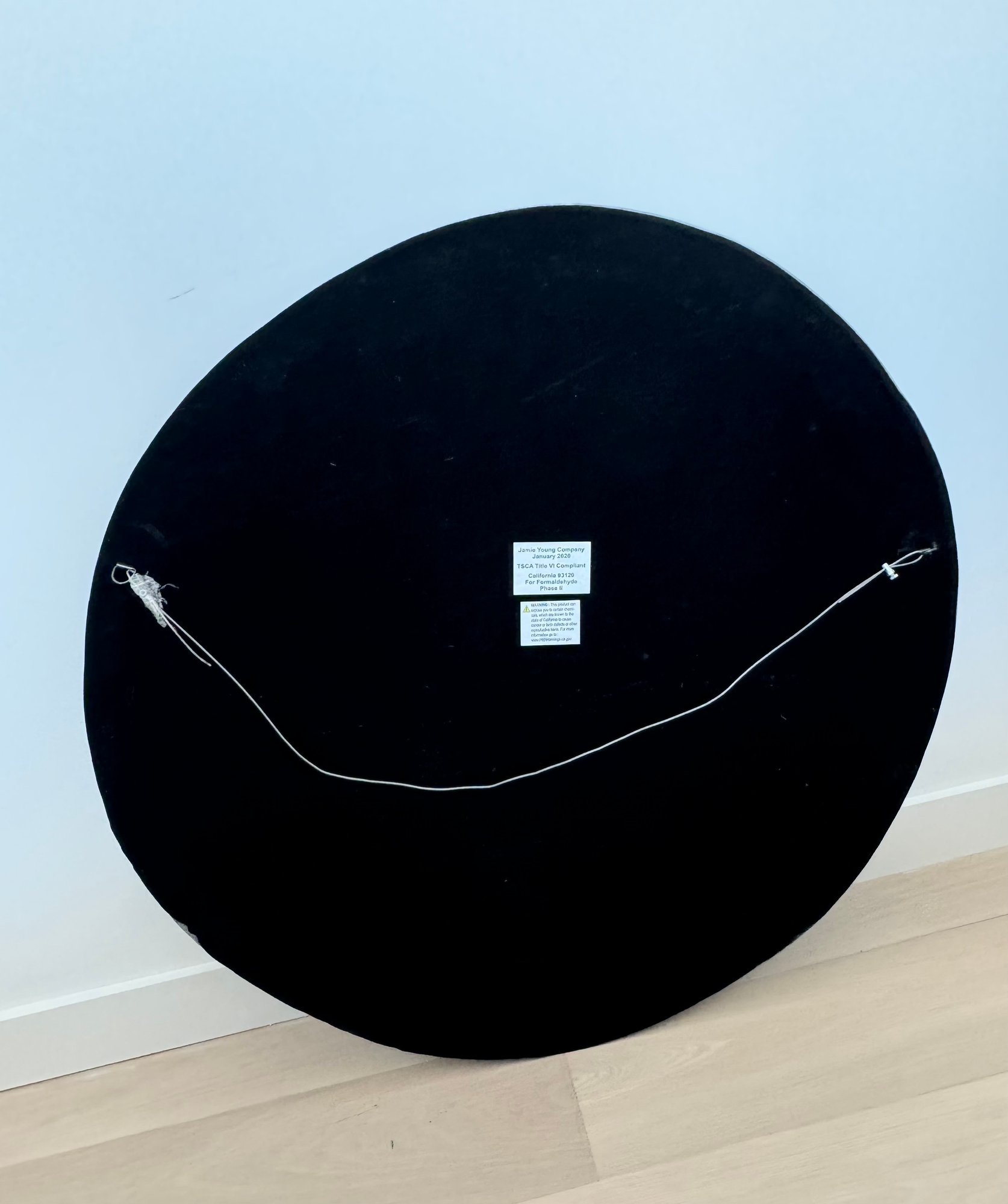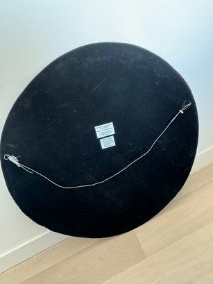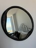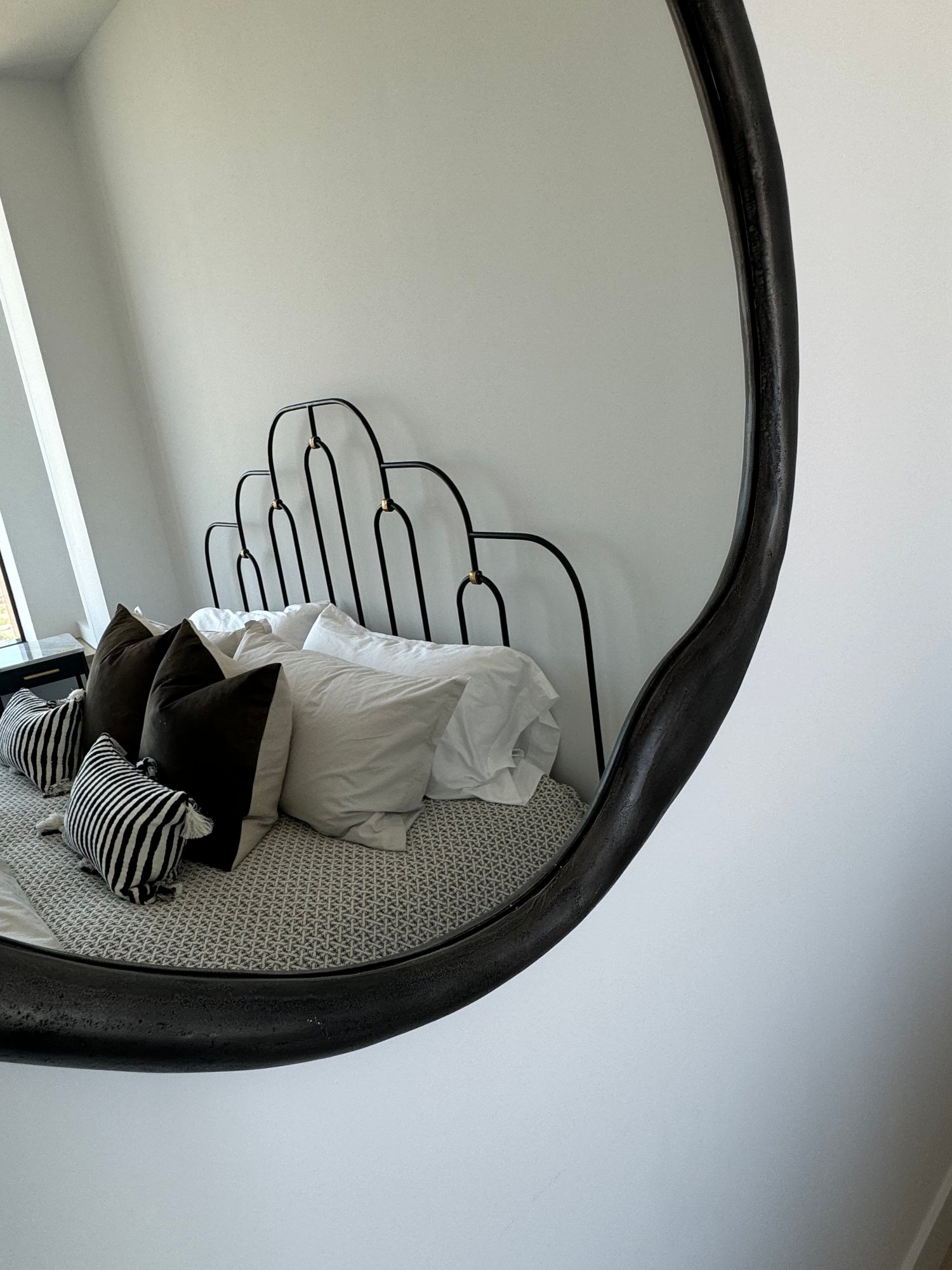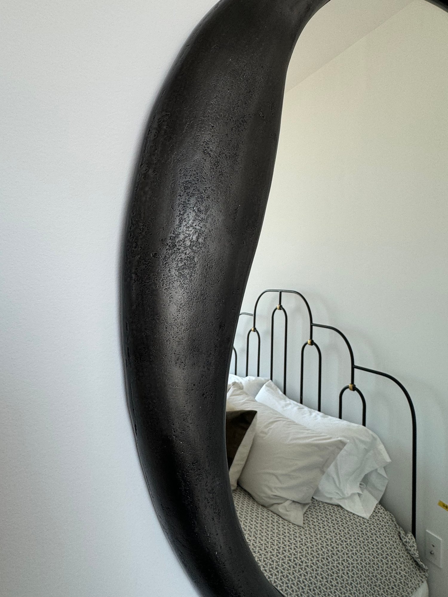 This unique shaped mirror measures 34.5” by 34” and has a neat distressed finish to the metal.