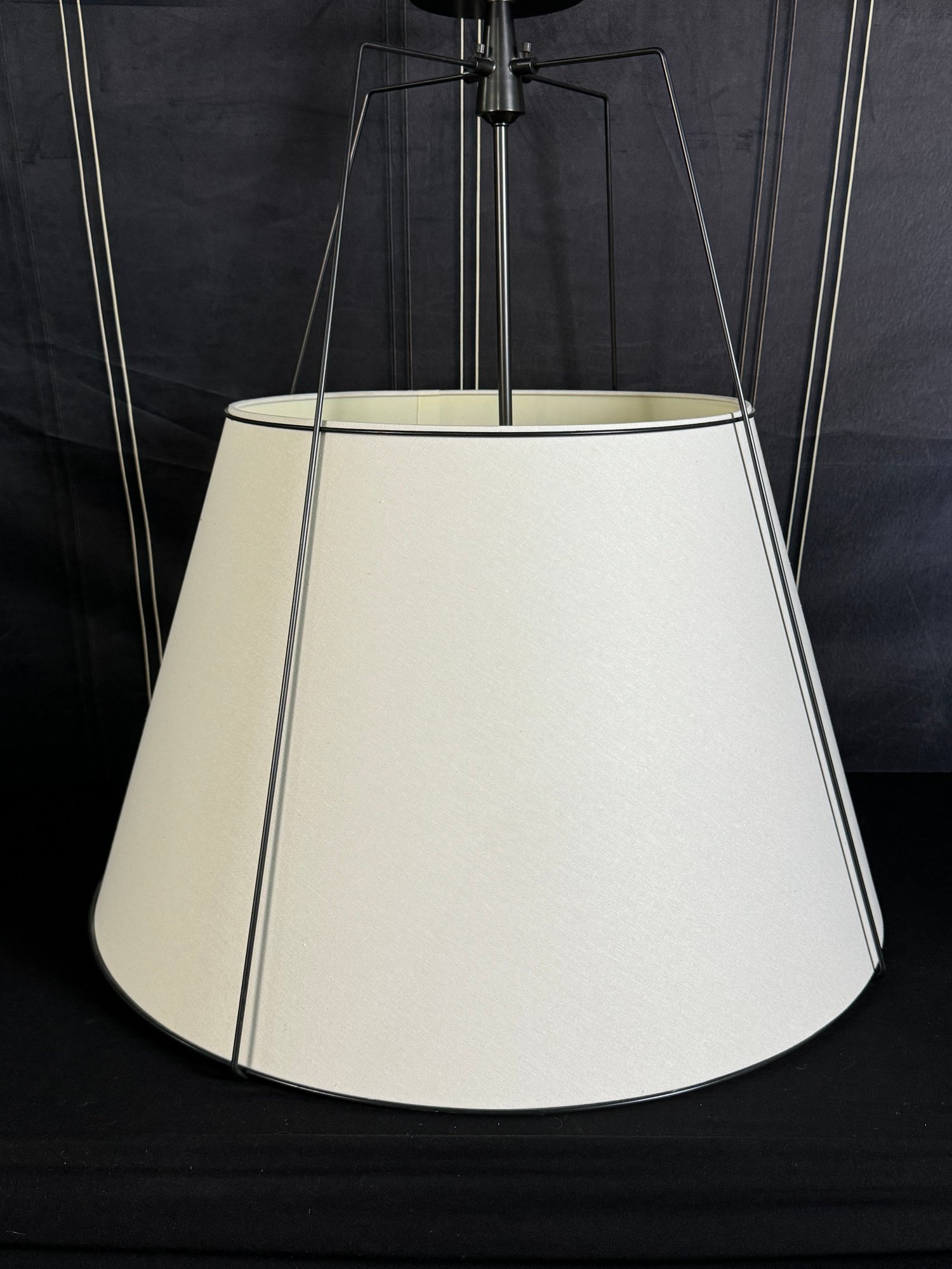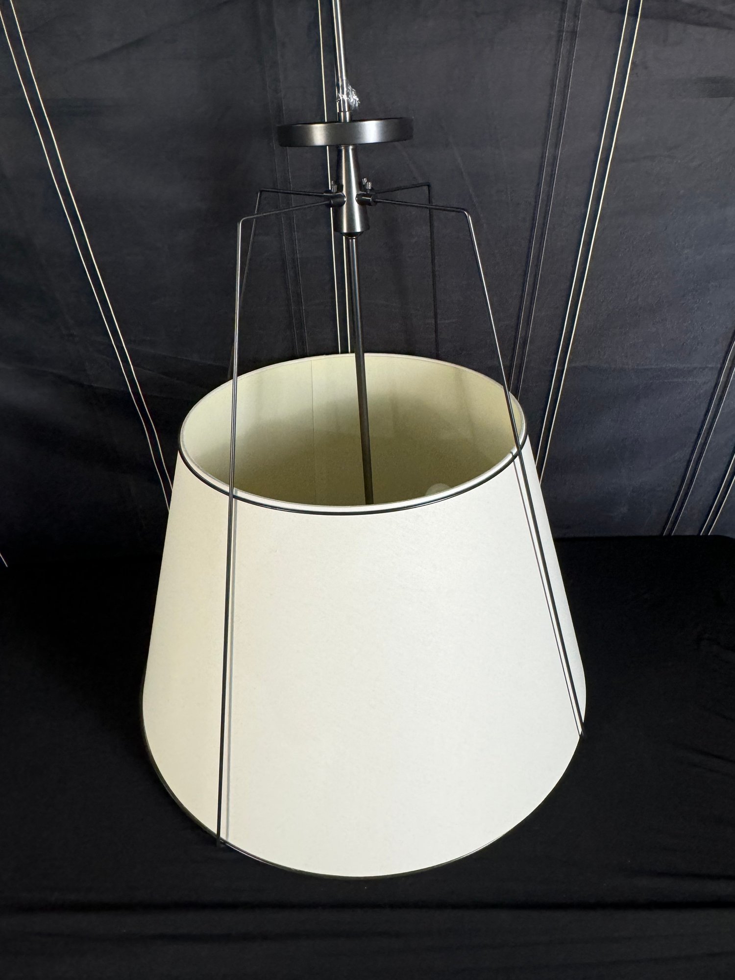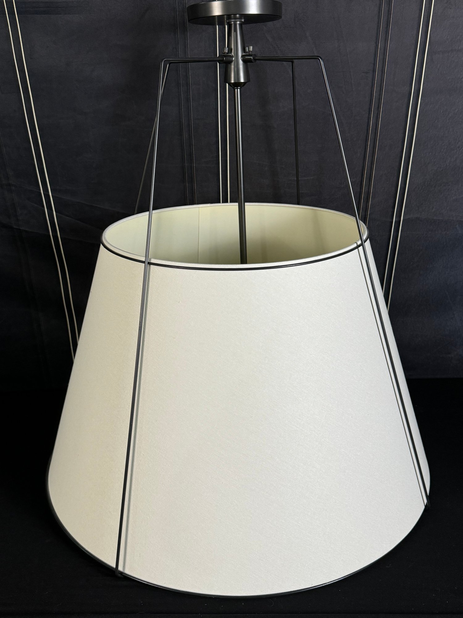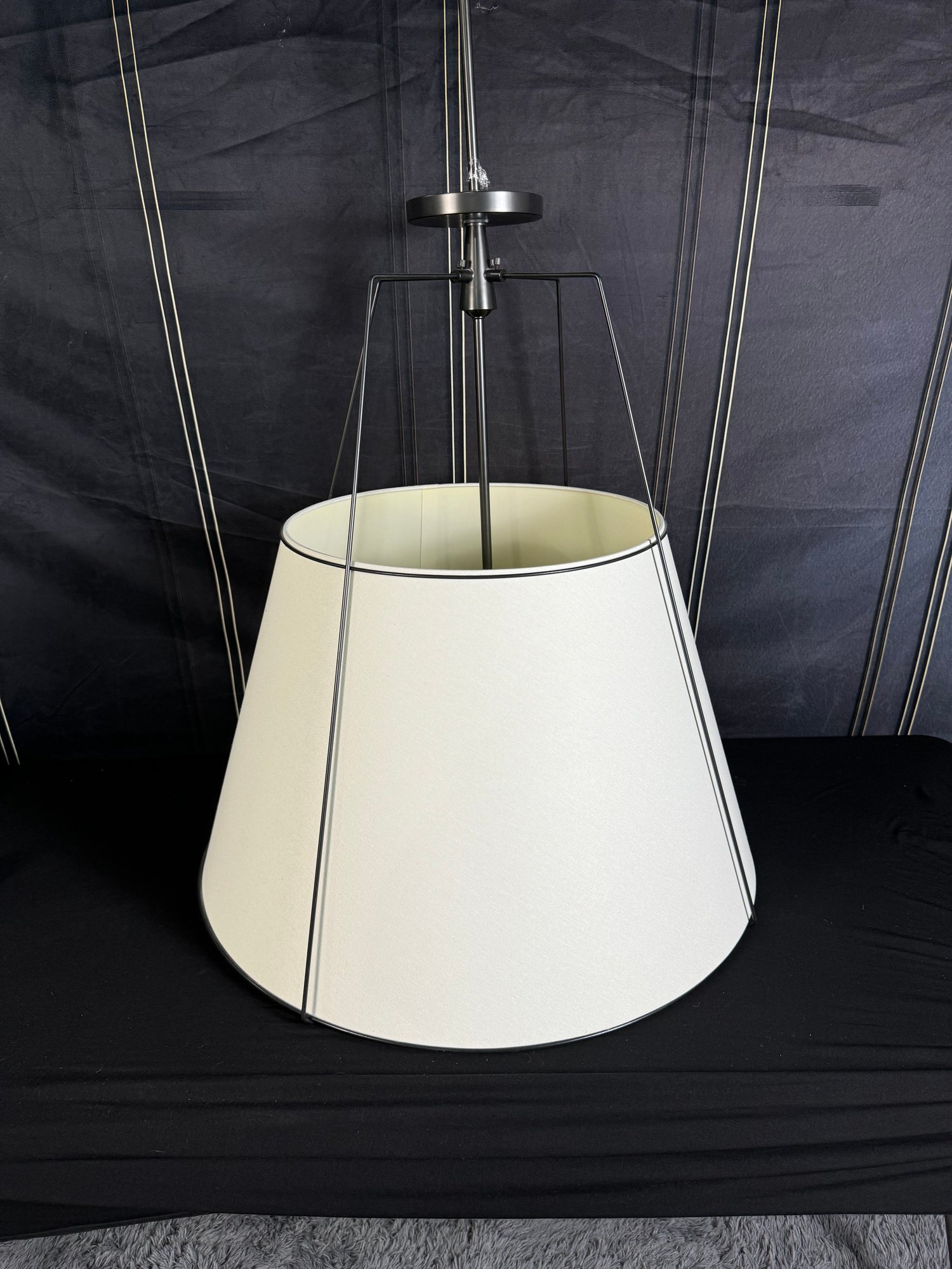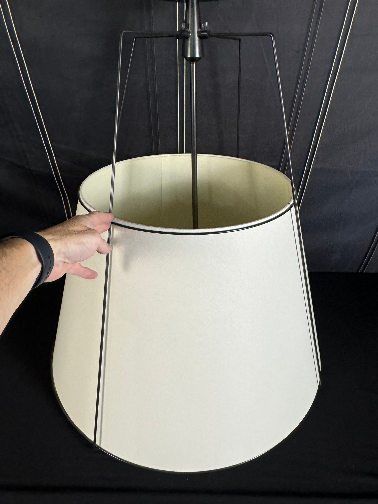 This sizable light was working when removed and measures 28” in diameter at the shade by 60” from the shroud to the bottom.