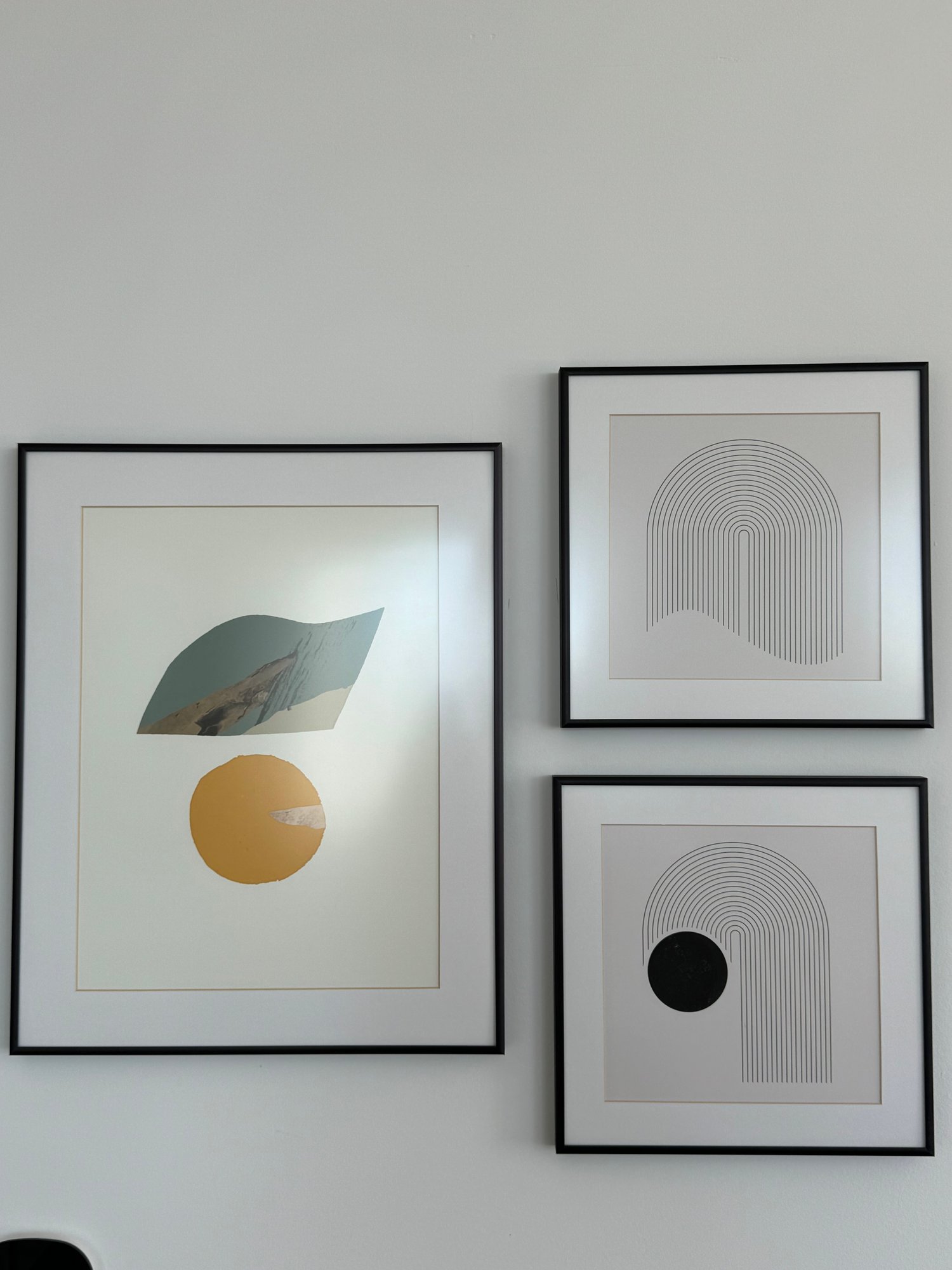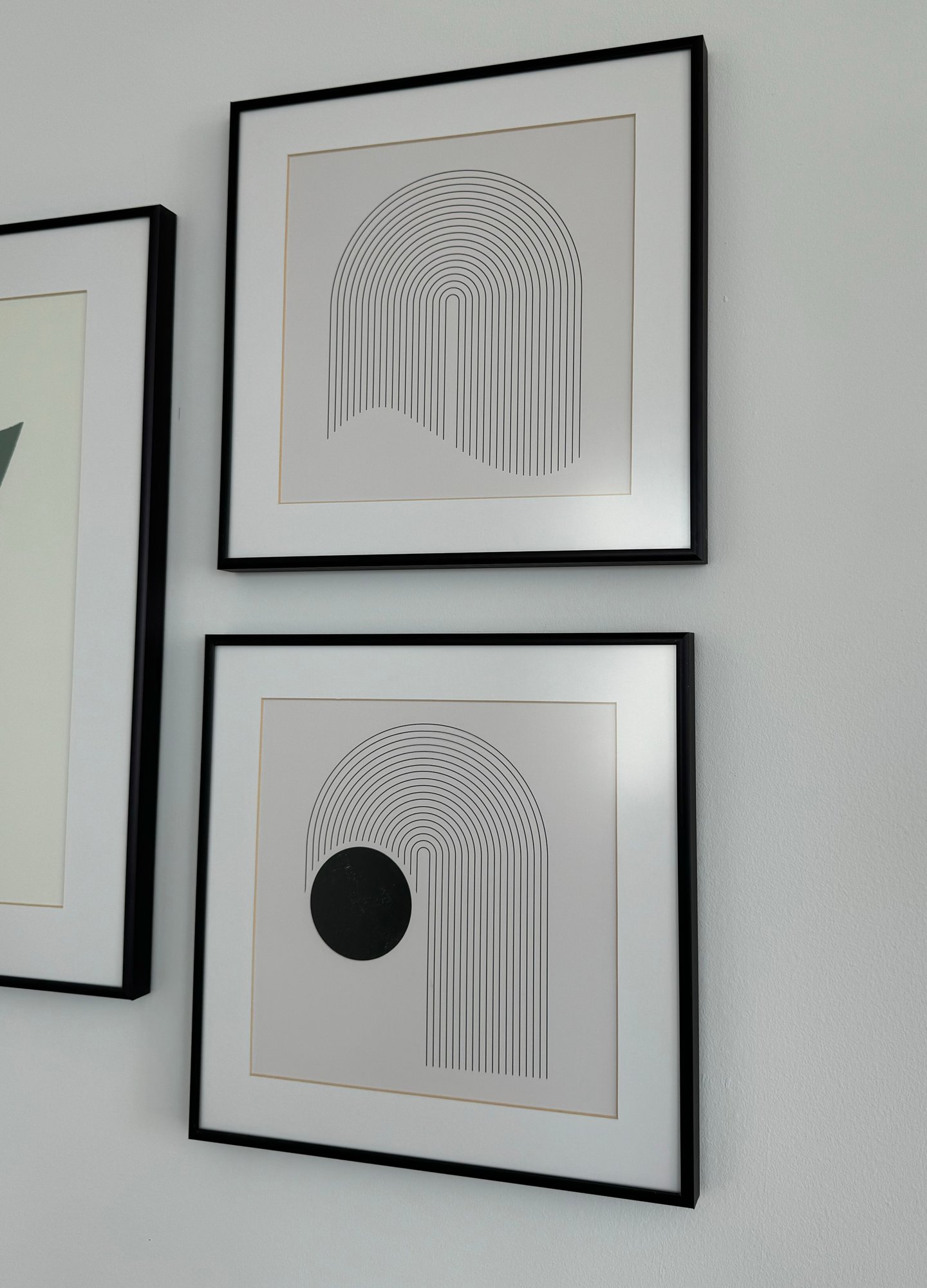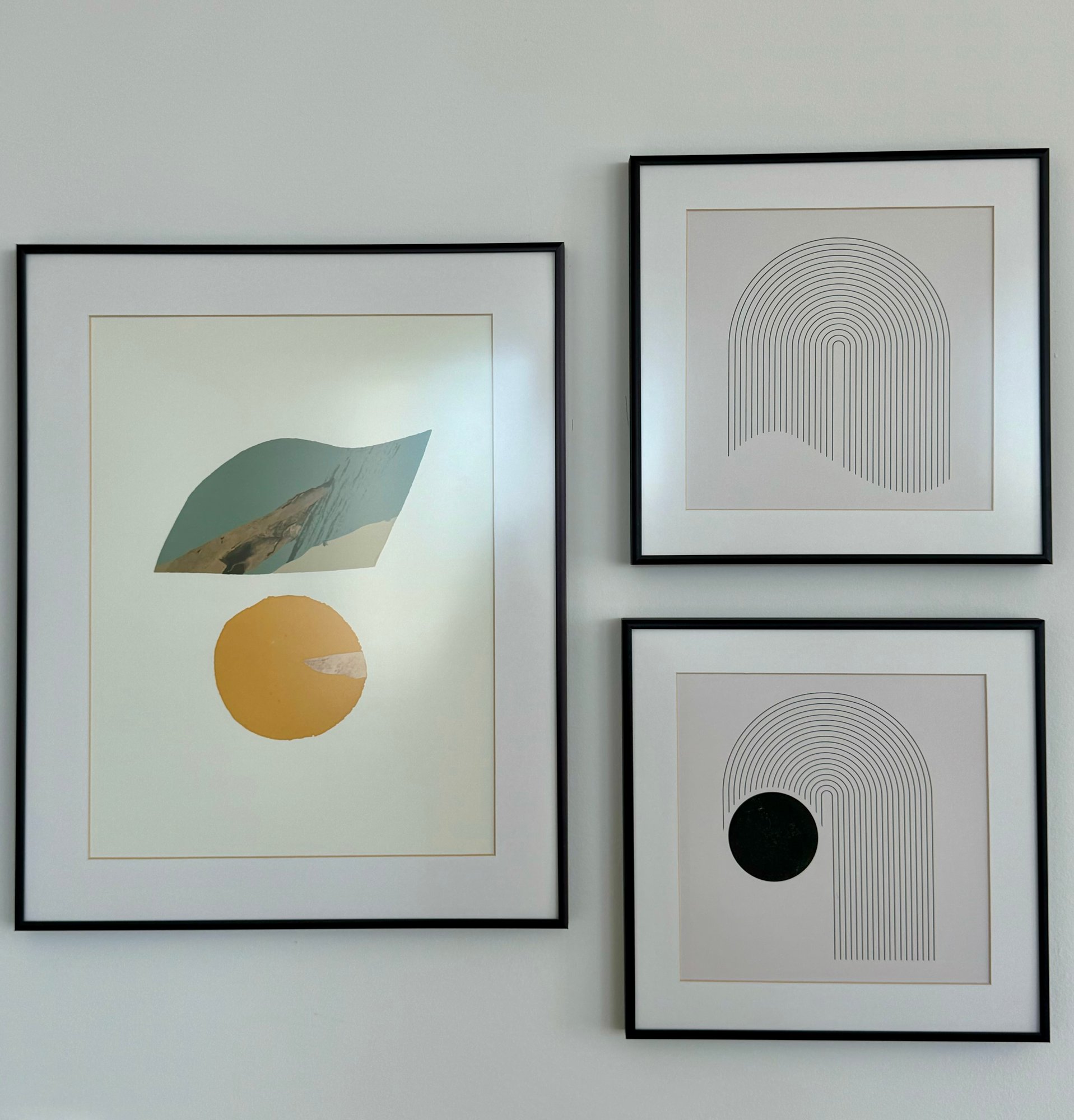 These pieces measure 12” square and 16” x 20” respectively. They are framed in black metal and have anti-reflective polycarbonate fronts.