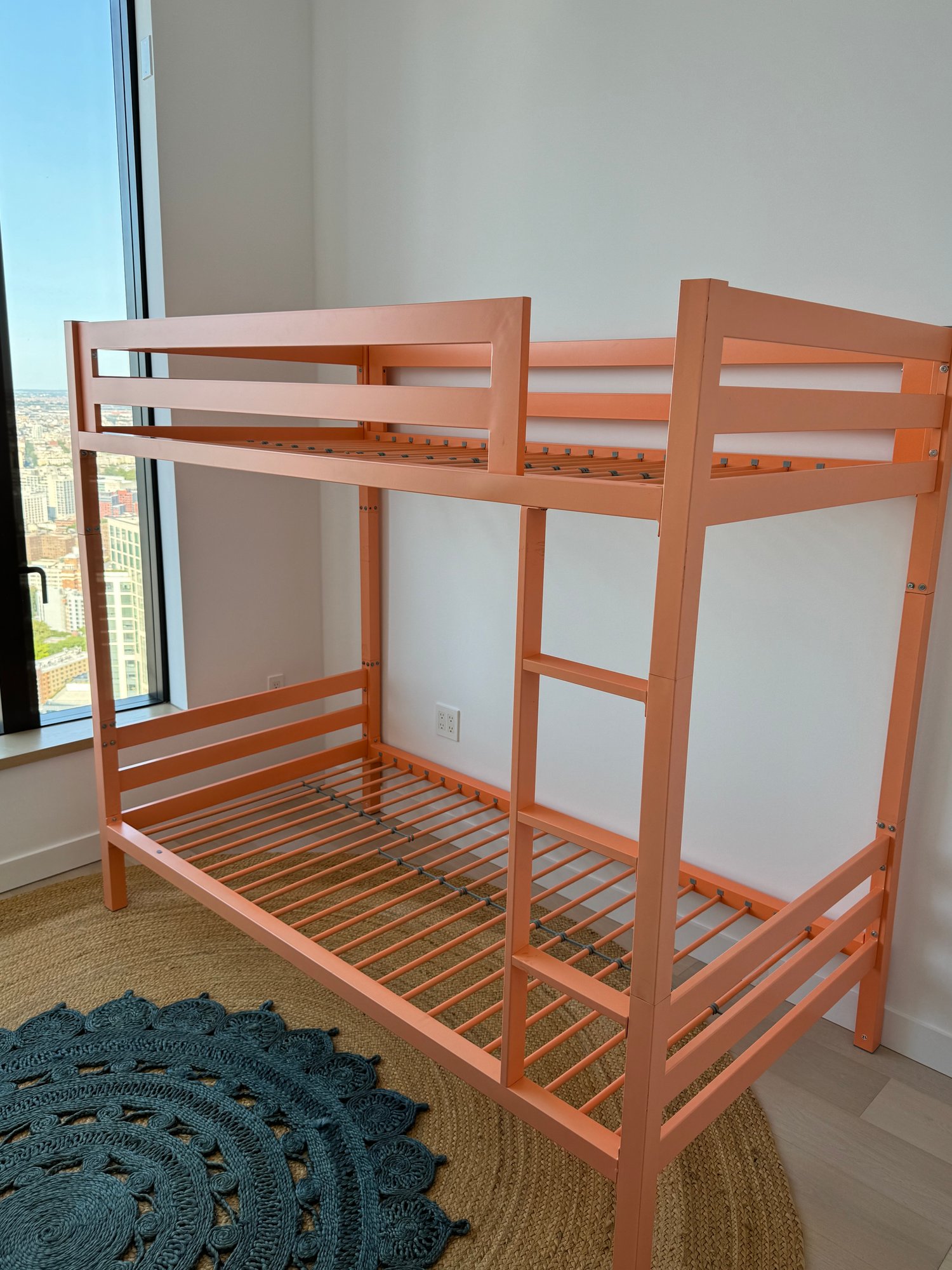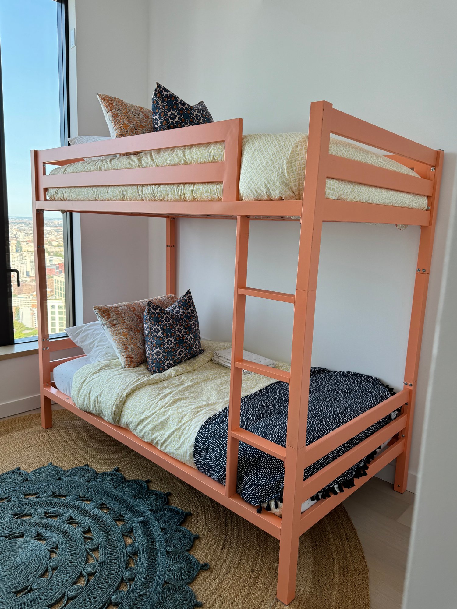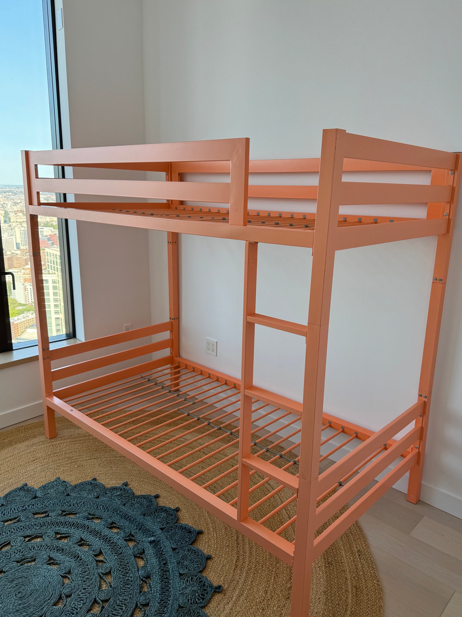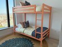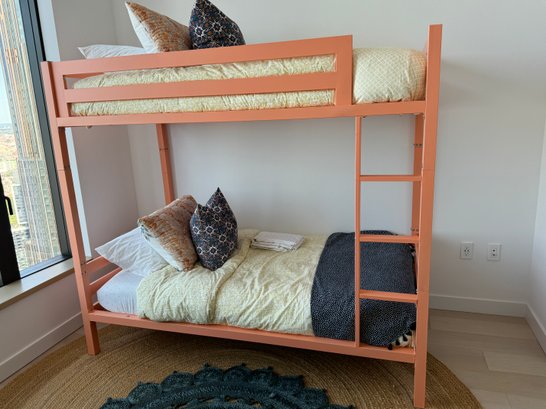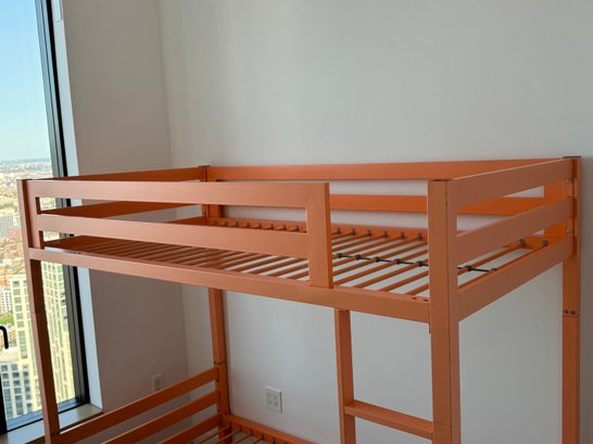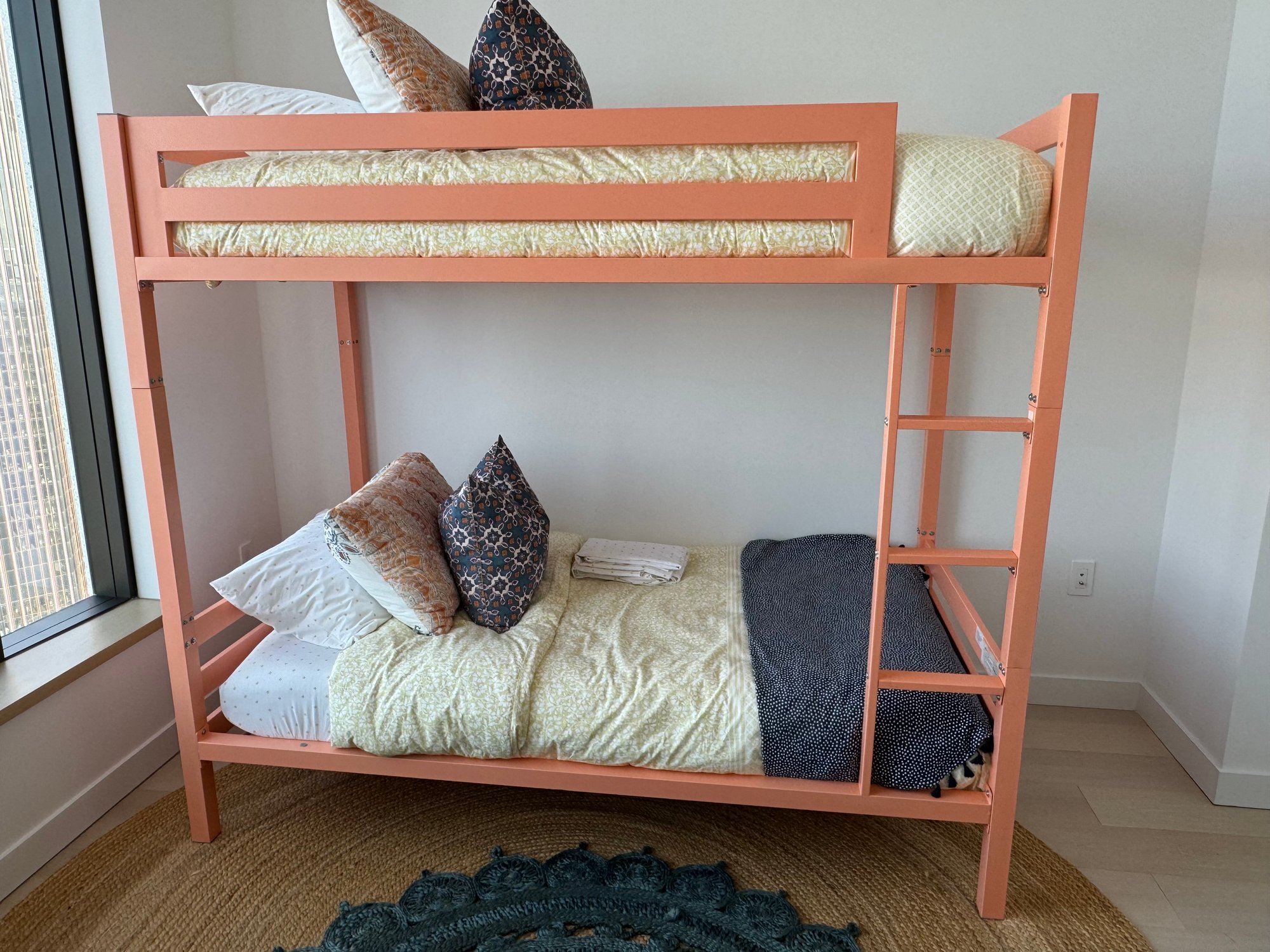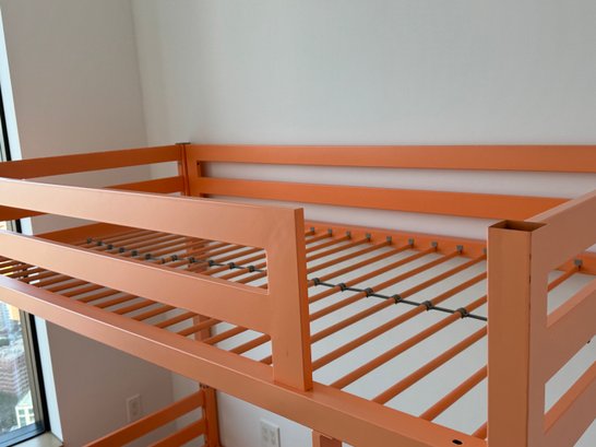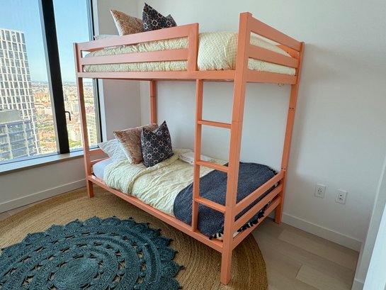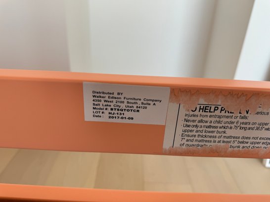 This industrial-chic piece adds a warm pop of color while measuring 79”L x 43” by 70”h. The bottom bunk mattress top is 19” from the ground. The bedding is included with this bed.