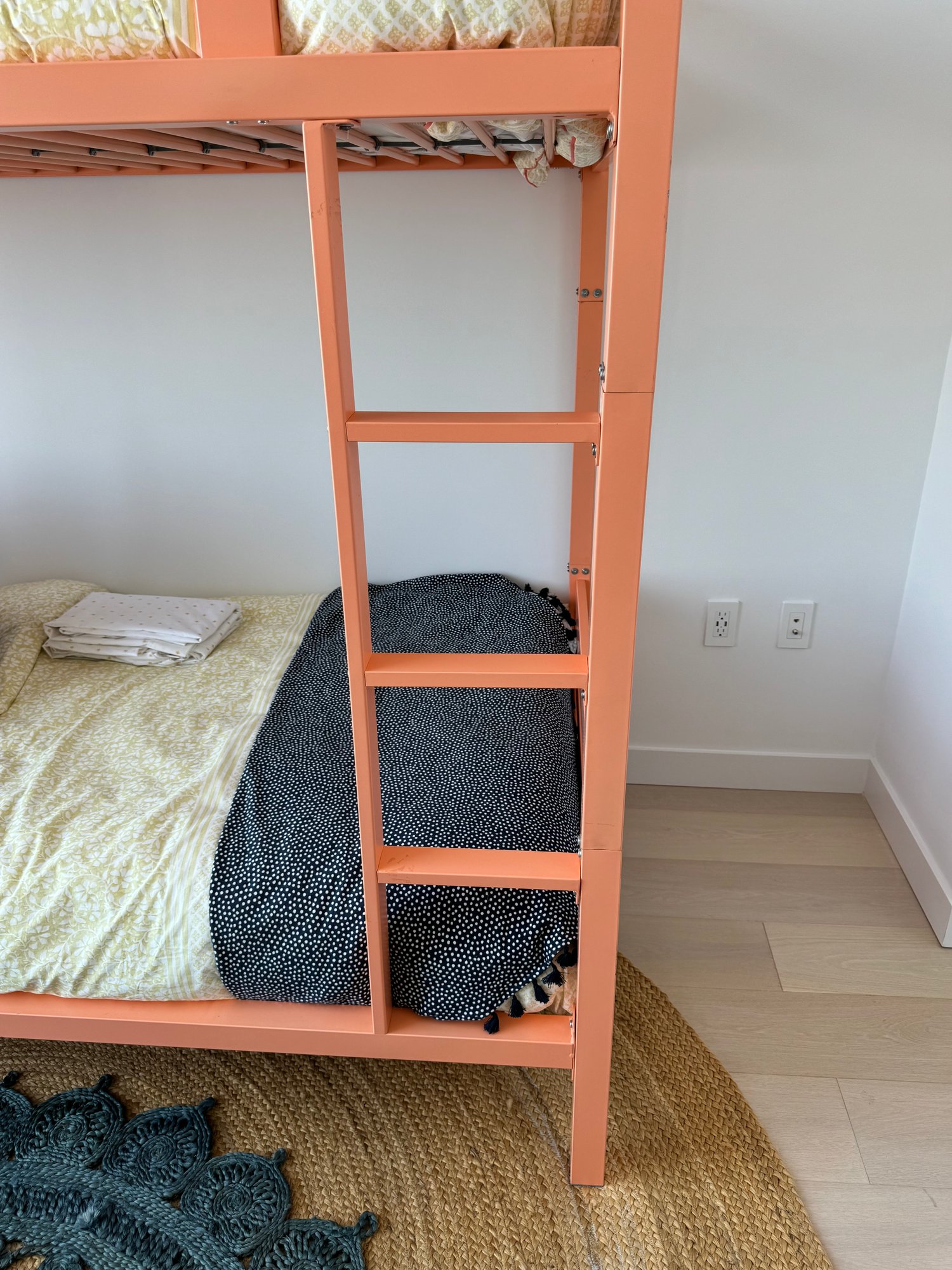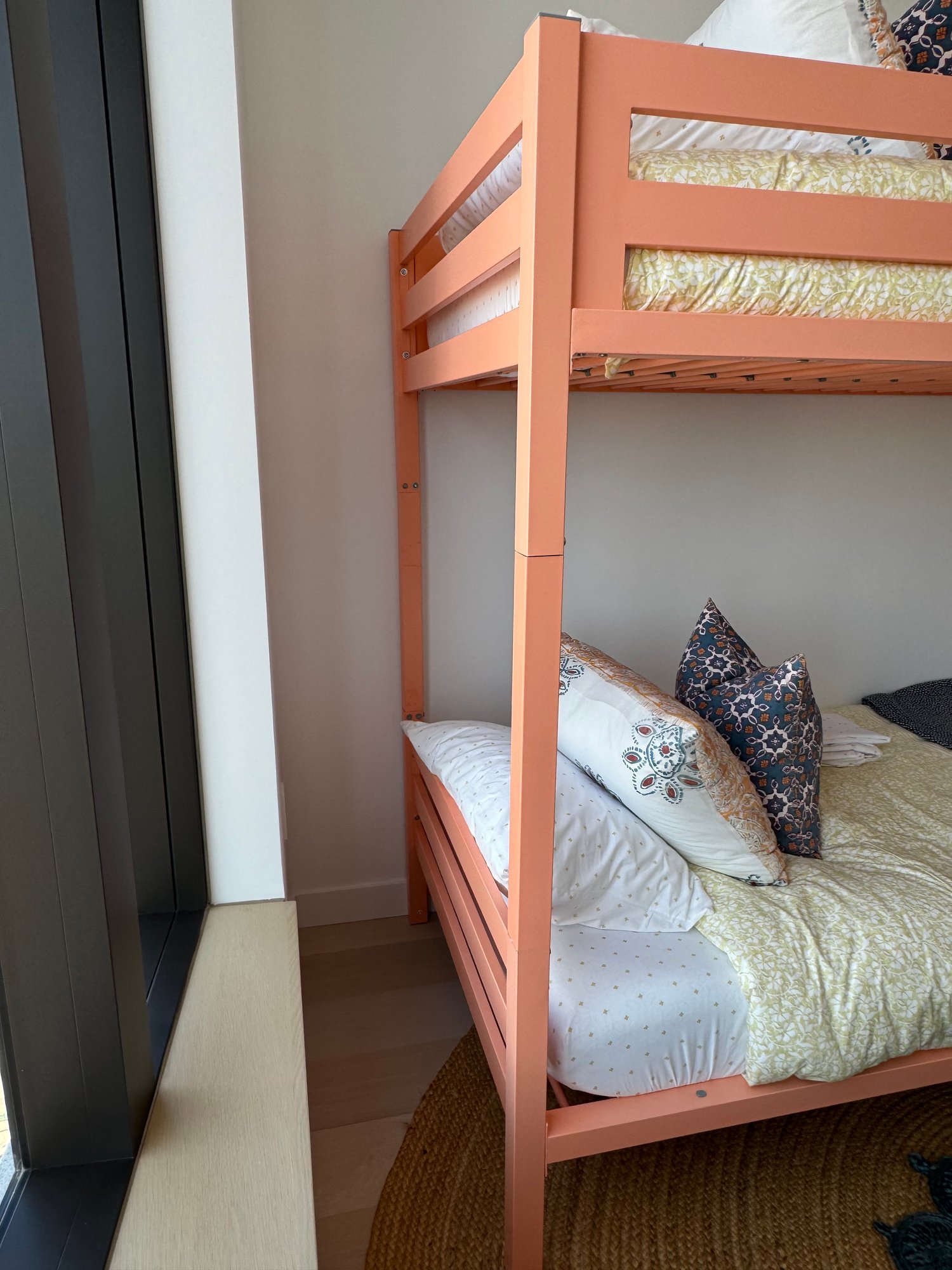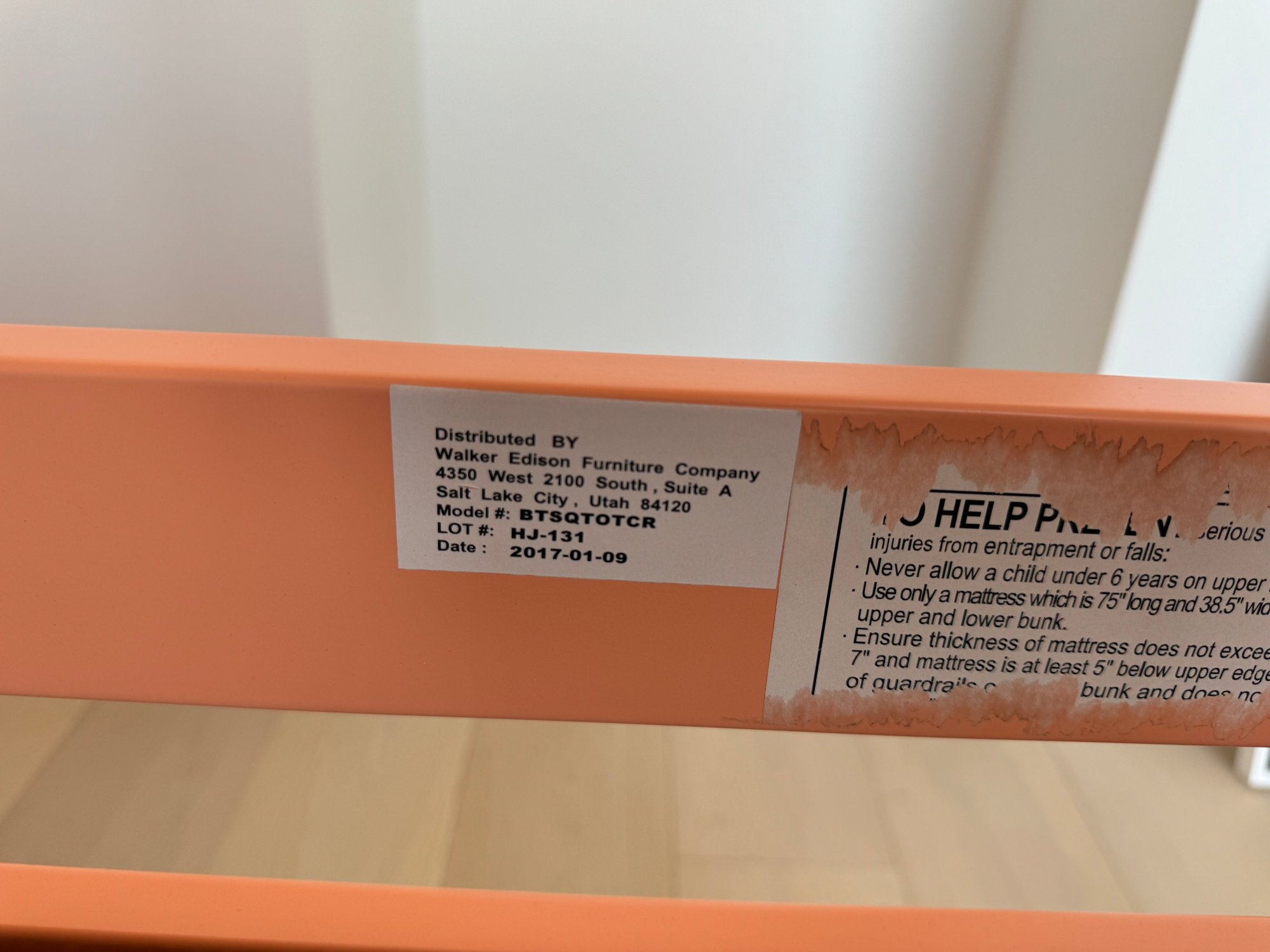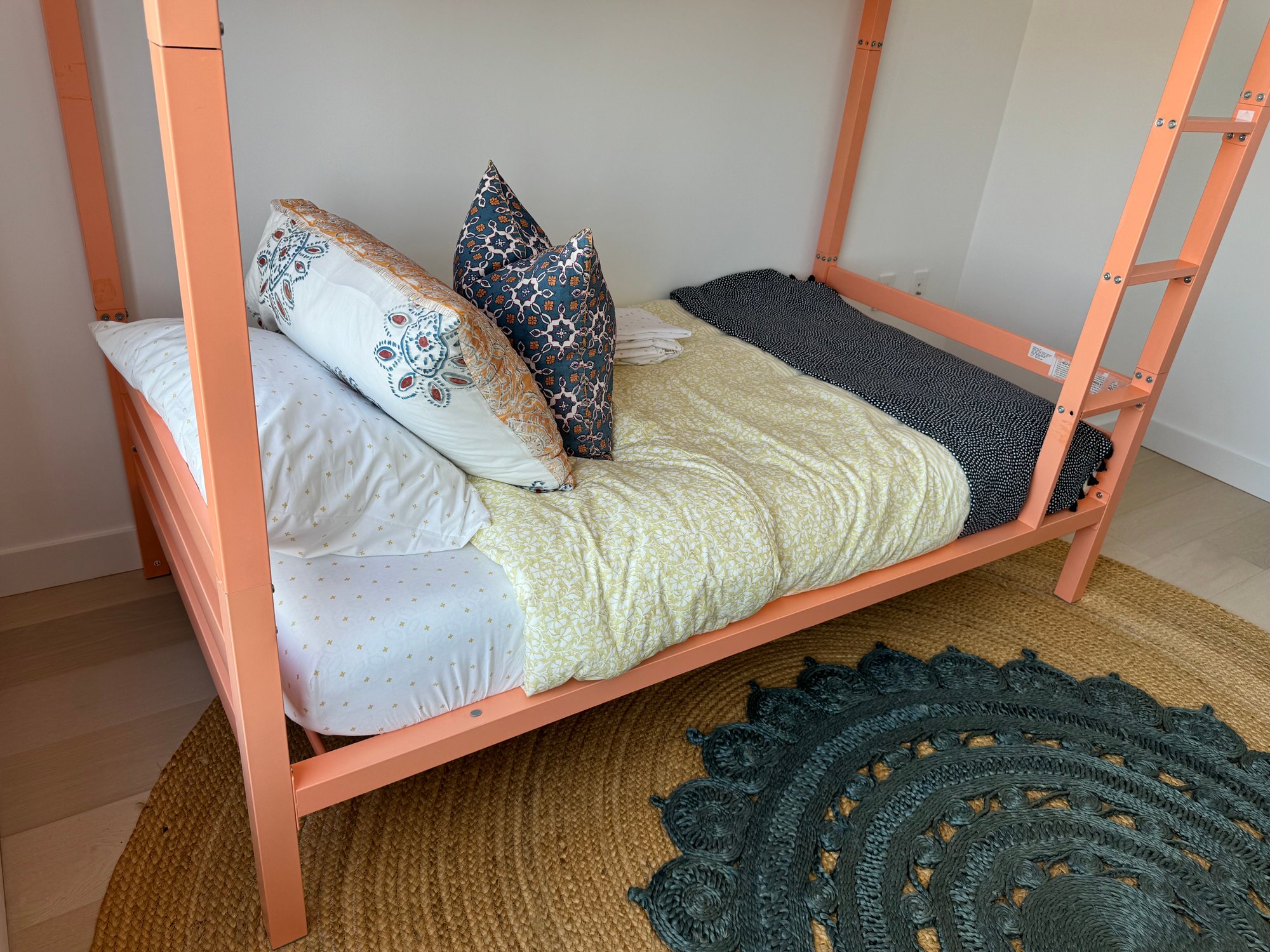 This industrial-chic piece adds a warm pop of color while measuring 79”L x 43” by 70”h. The bottom bunk mattress top is 19” from the ground. The bedding is included with this bed.