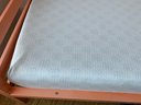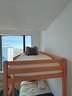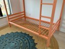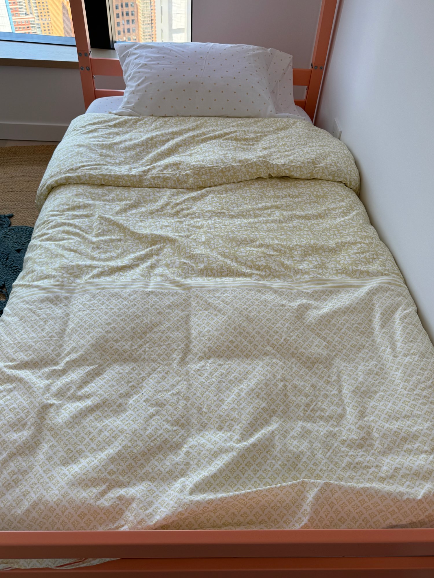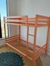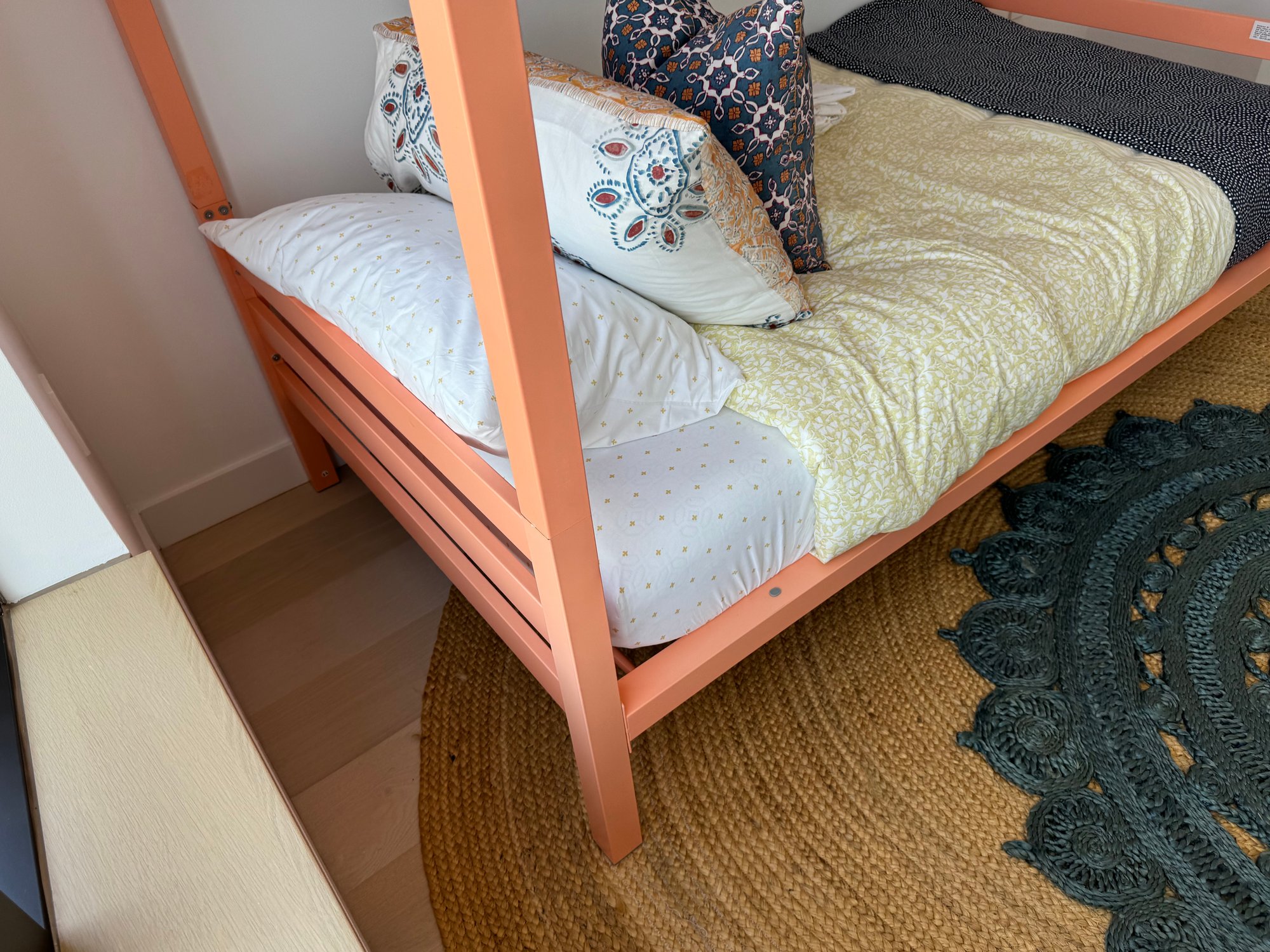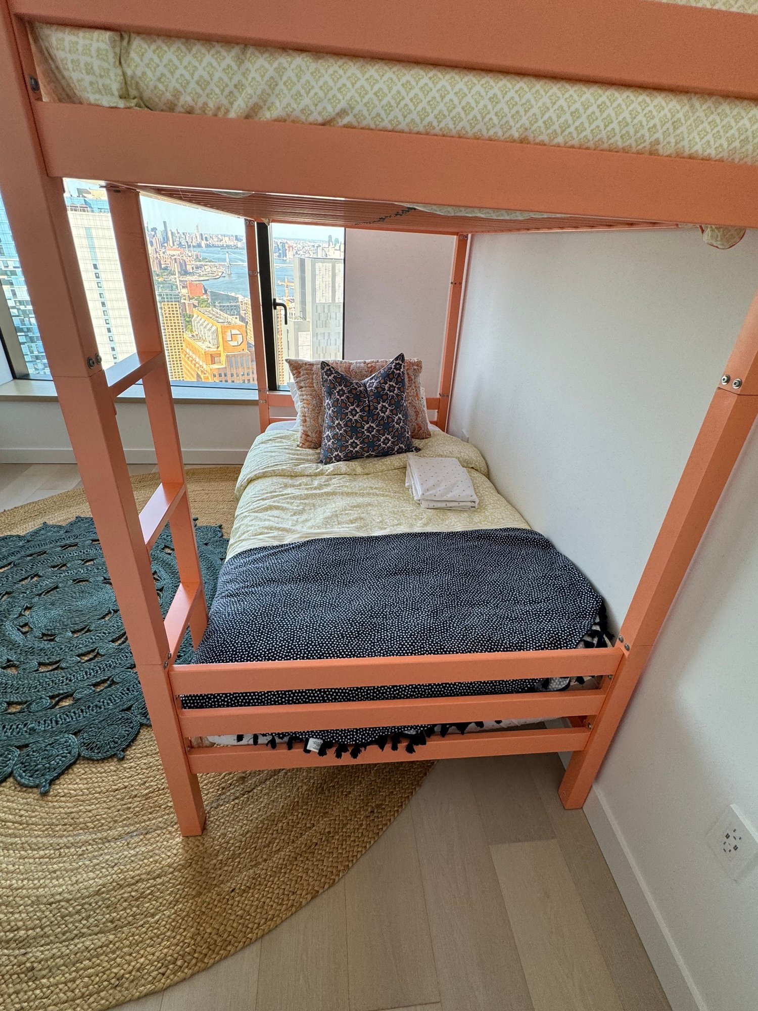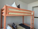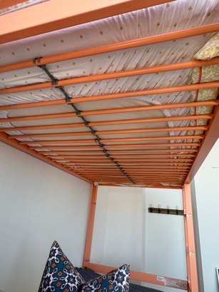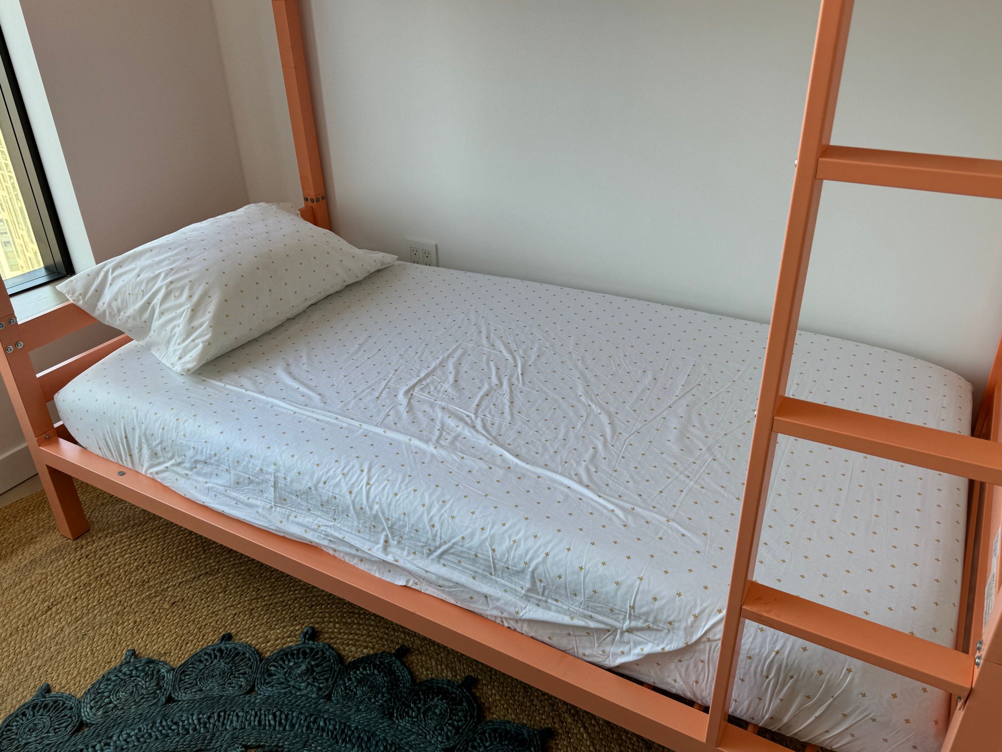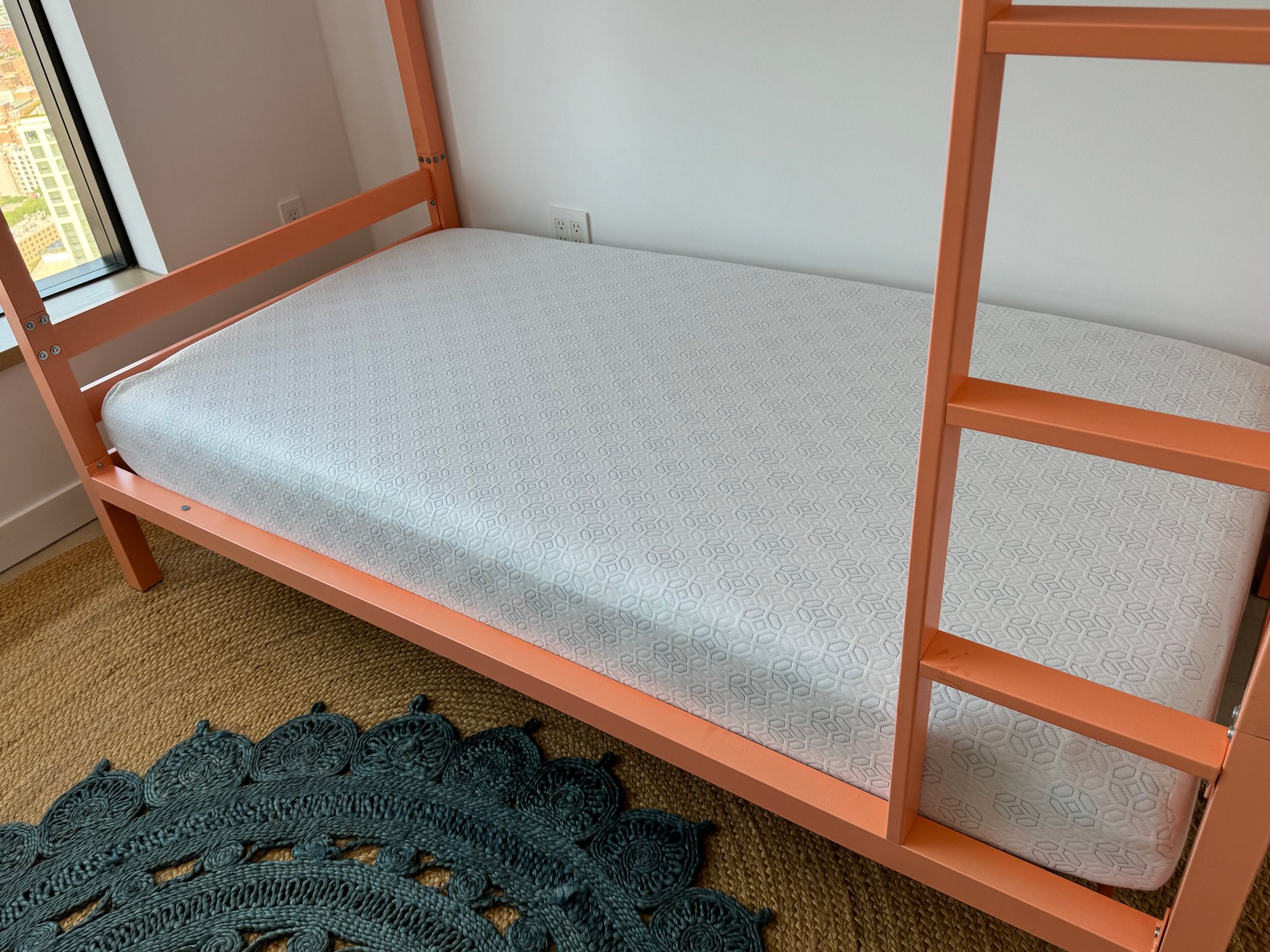 This industrial-chic piece adds a warm pop of color while measuring 79”L x 43” by 70”h. The bottom bunk mattress top is 19” from the ground. The bedding is included with this bed.