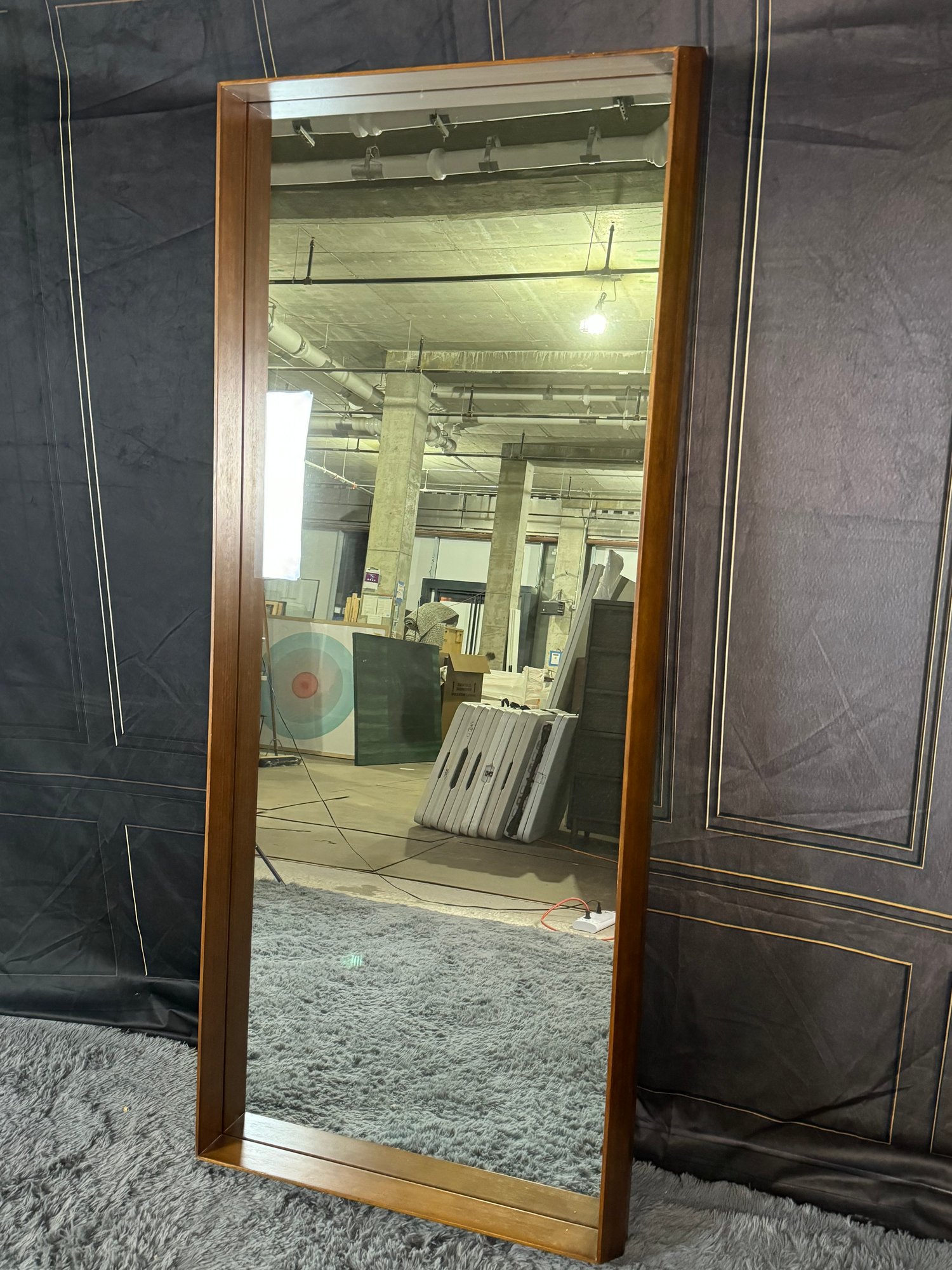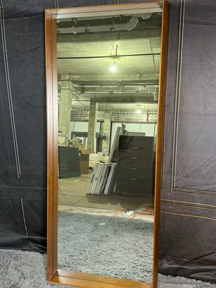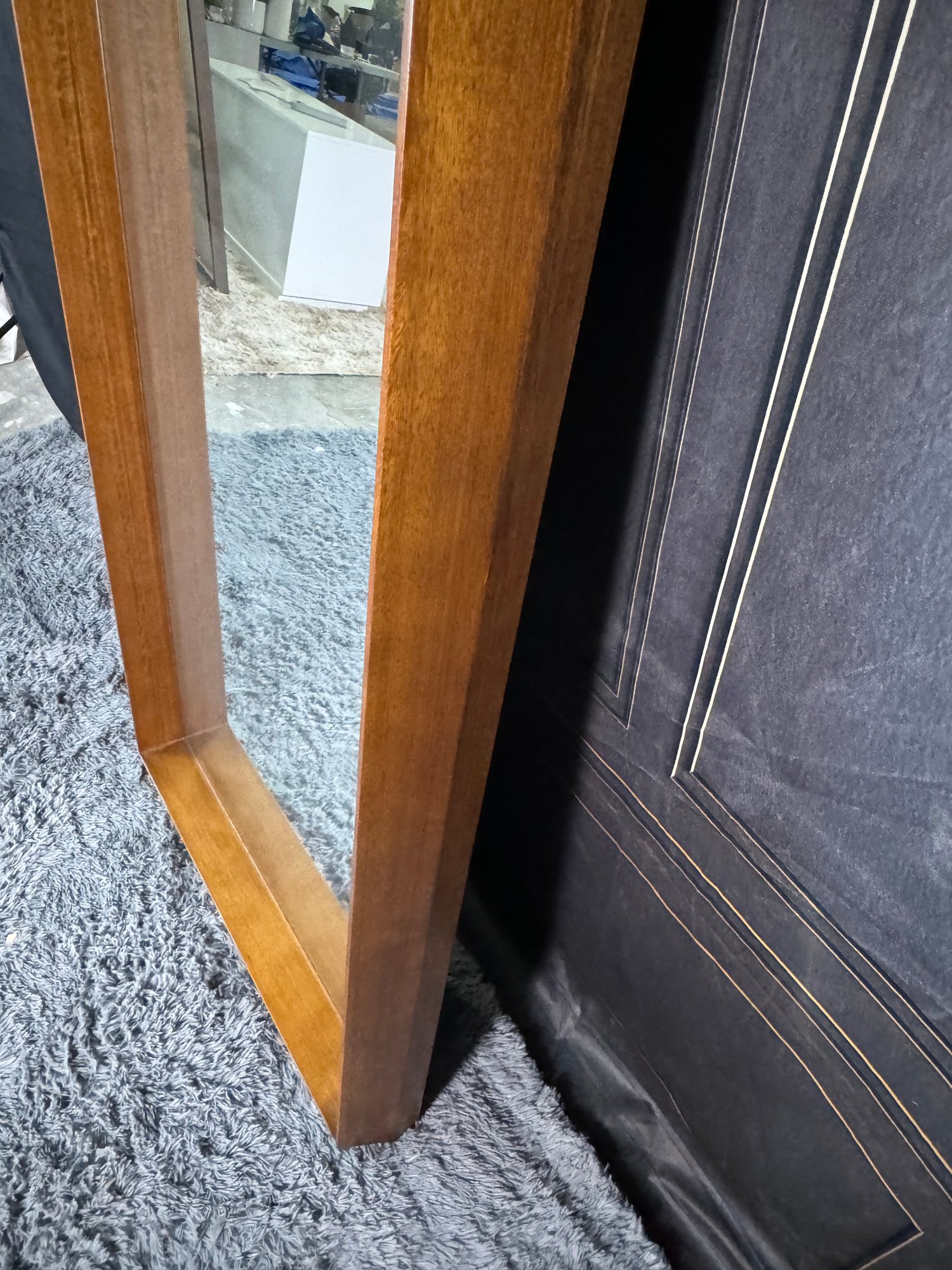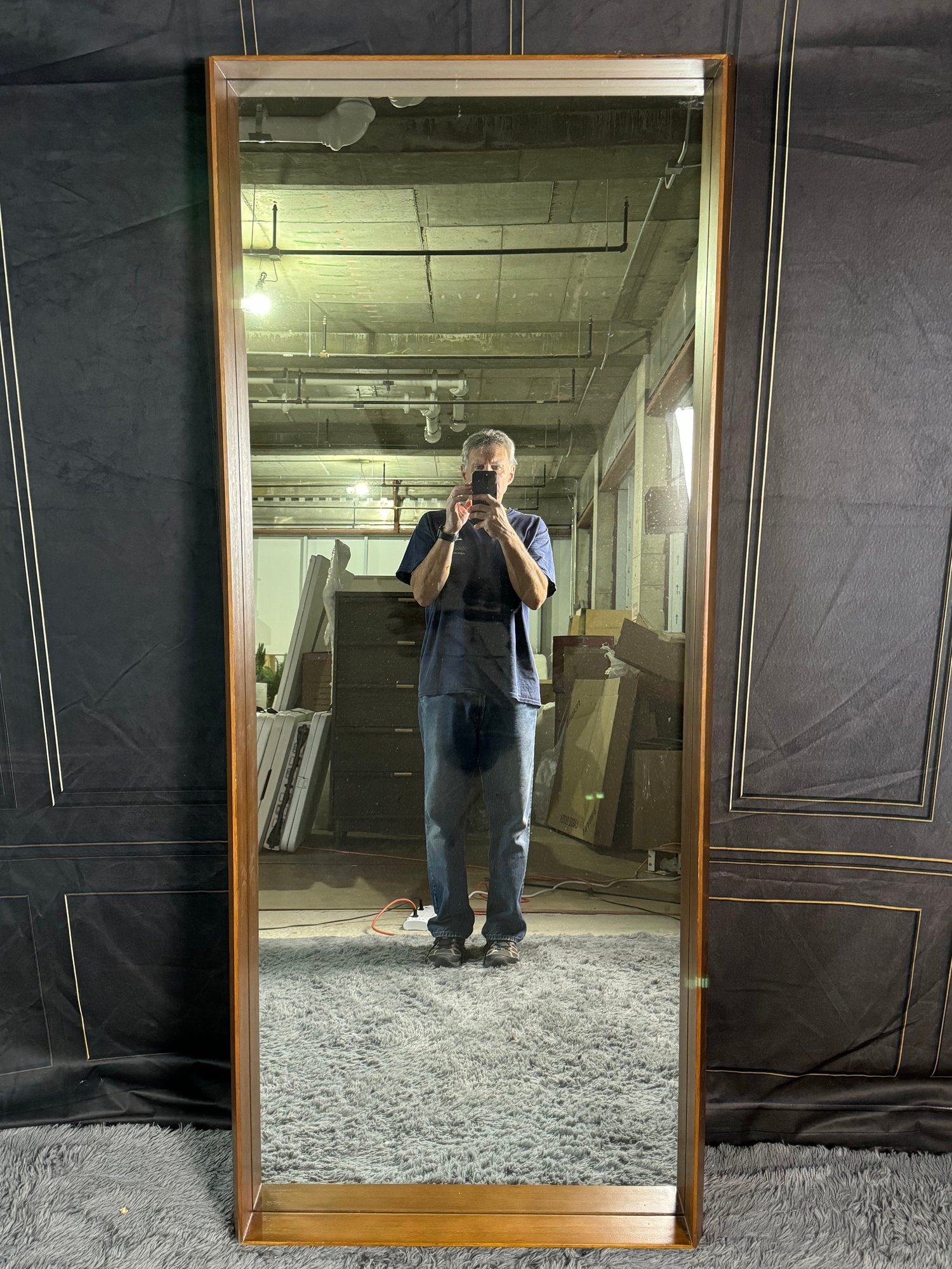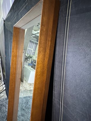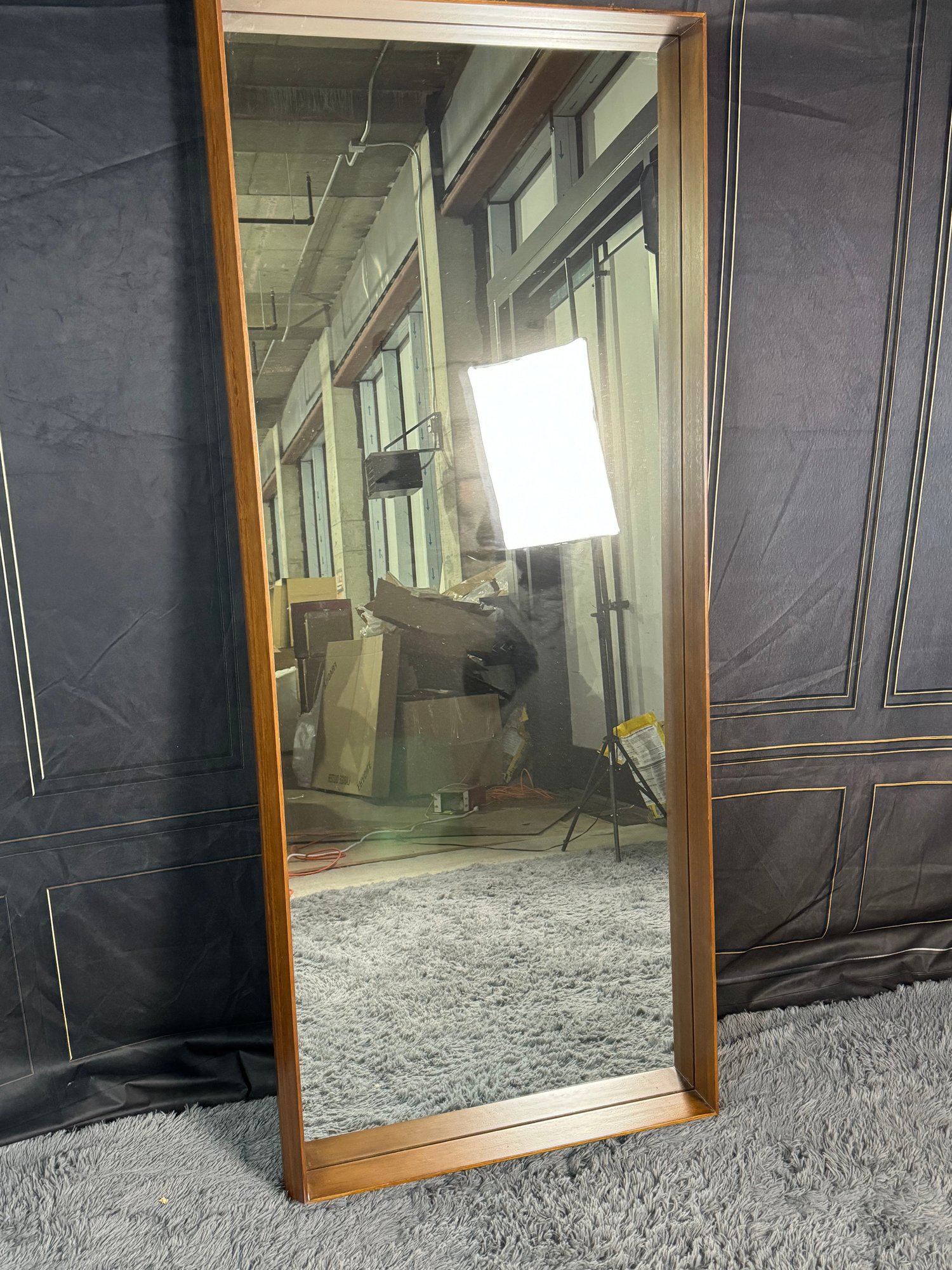 This lovely dark wood framed mirror can be hung in either portrait or landscape orientation. It measures 30” by 72”.