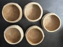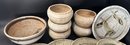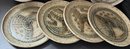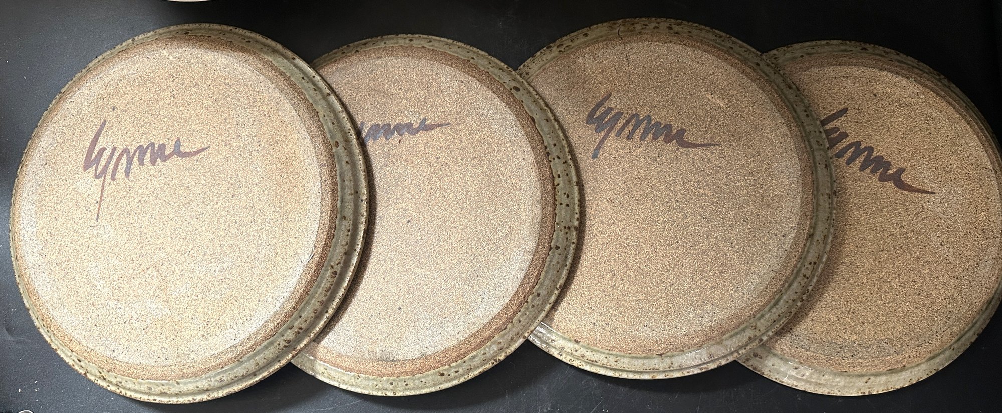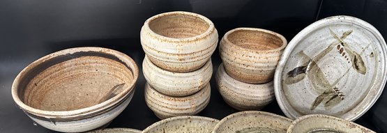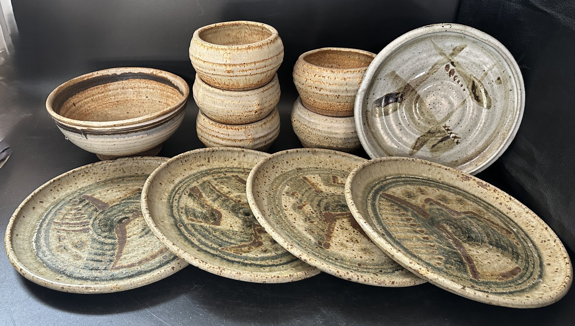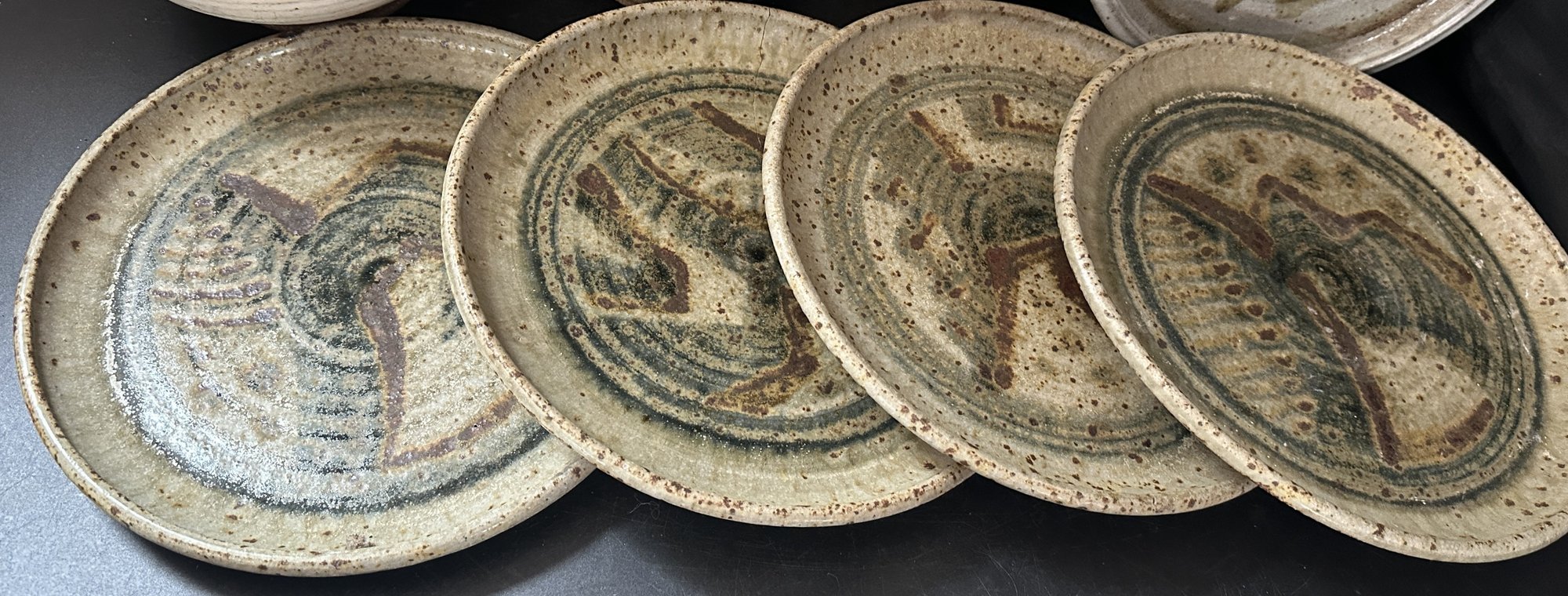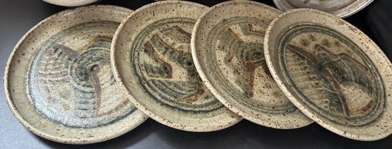 Large bowl is 9" D x 4.5"H; smaller bowls are 5.75"D x 3"H; 1 plate is 9.5" D; 4 plates are 10.5"D, one of these has a crack - see photo.