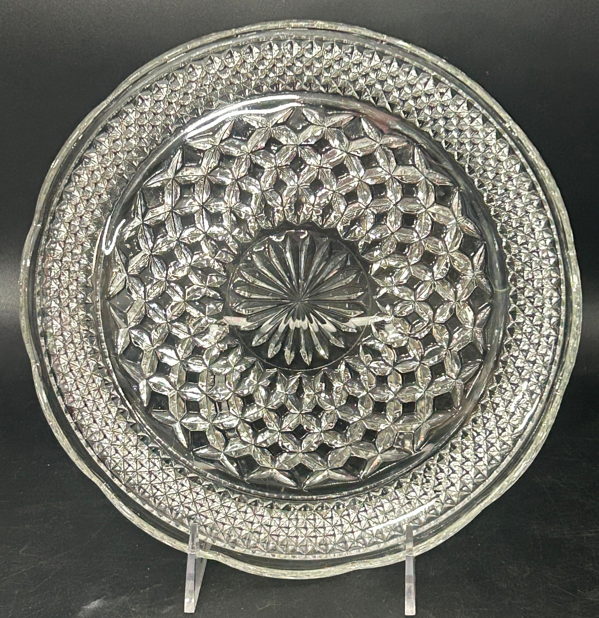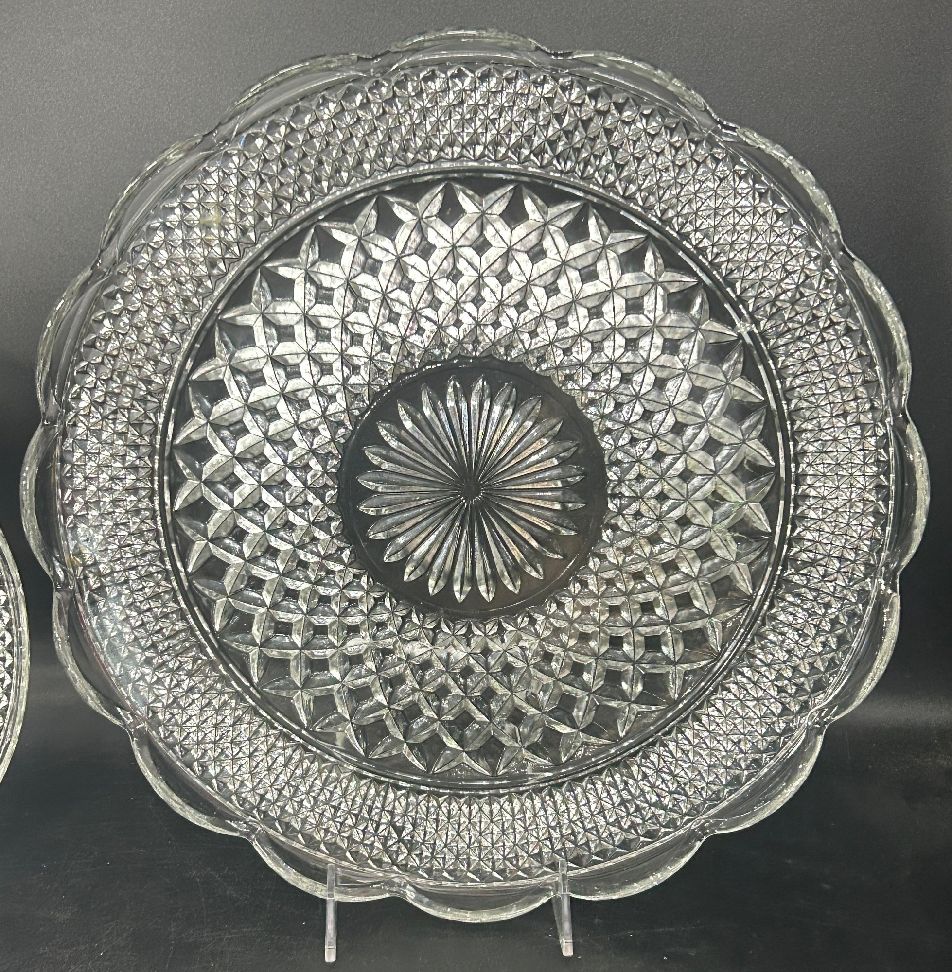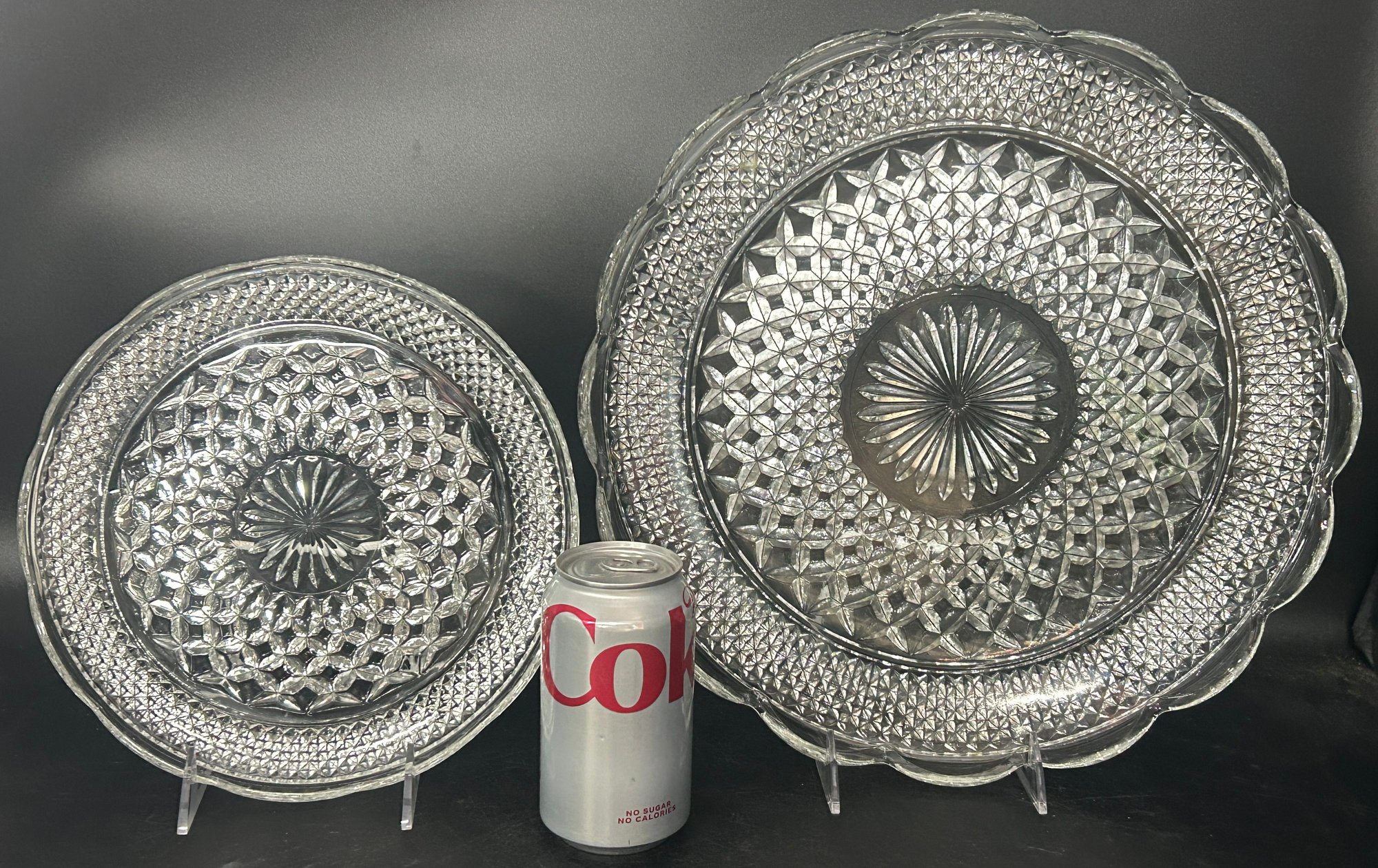 2 Pcs Vintage Anchor Hocking Wexford Scalloped Edge Pressed Glass Plates, Largest 14" Diam.