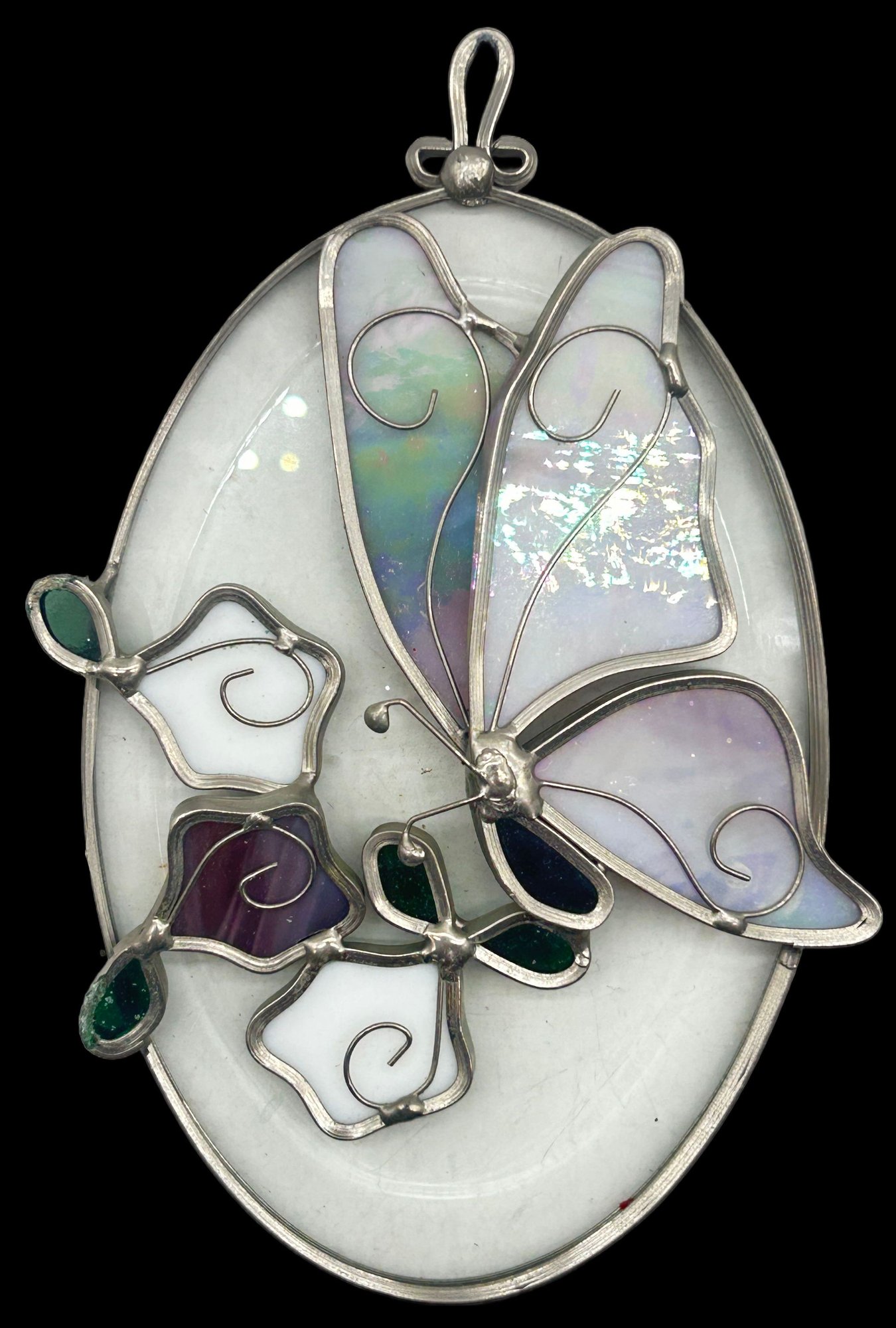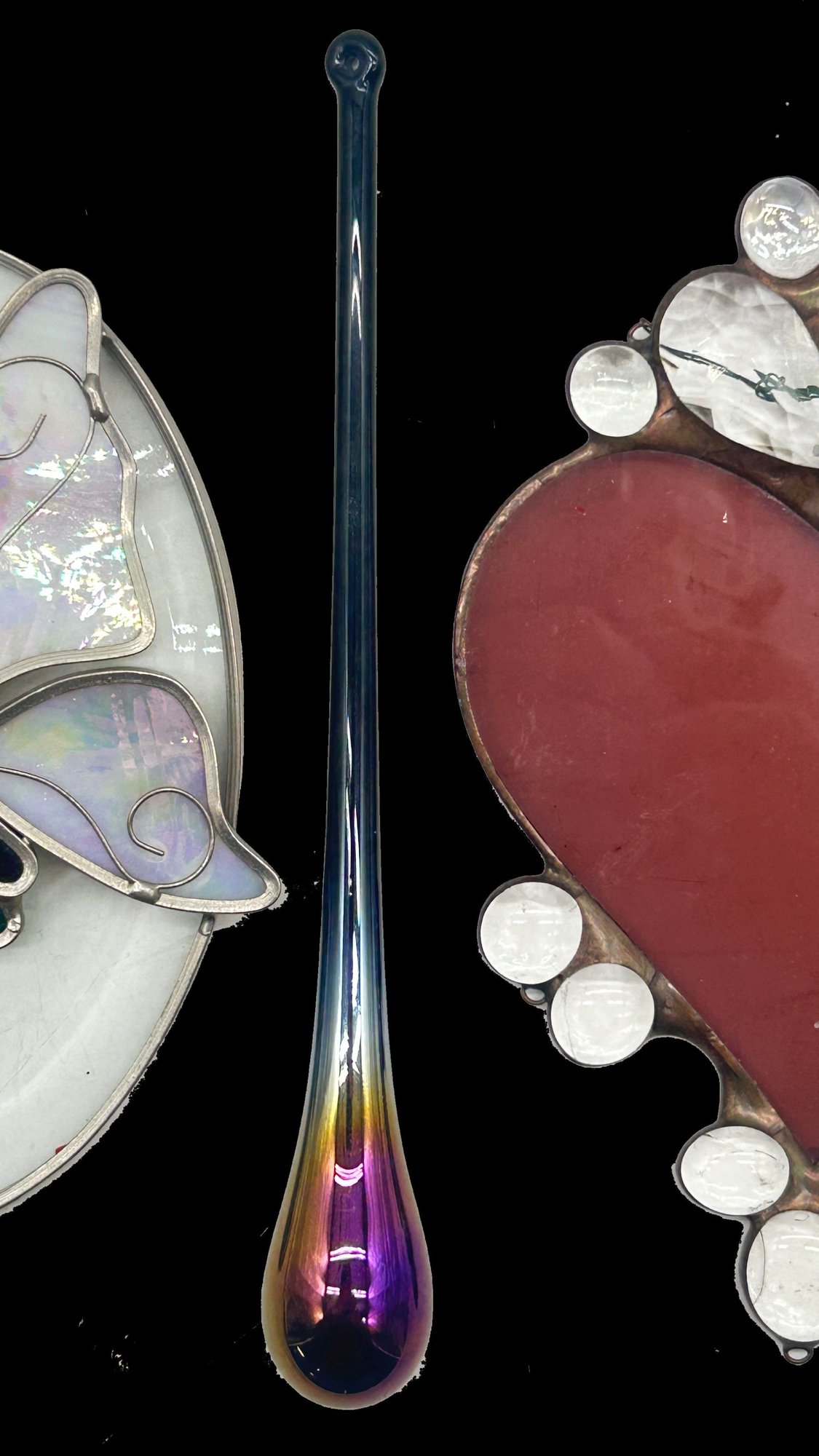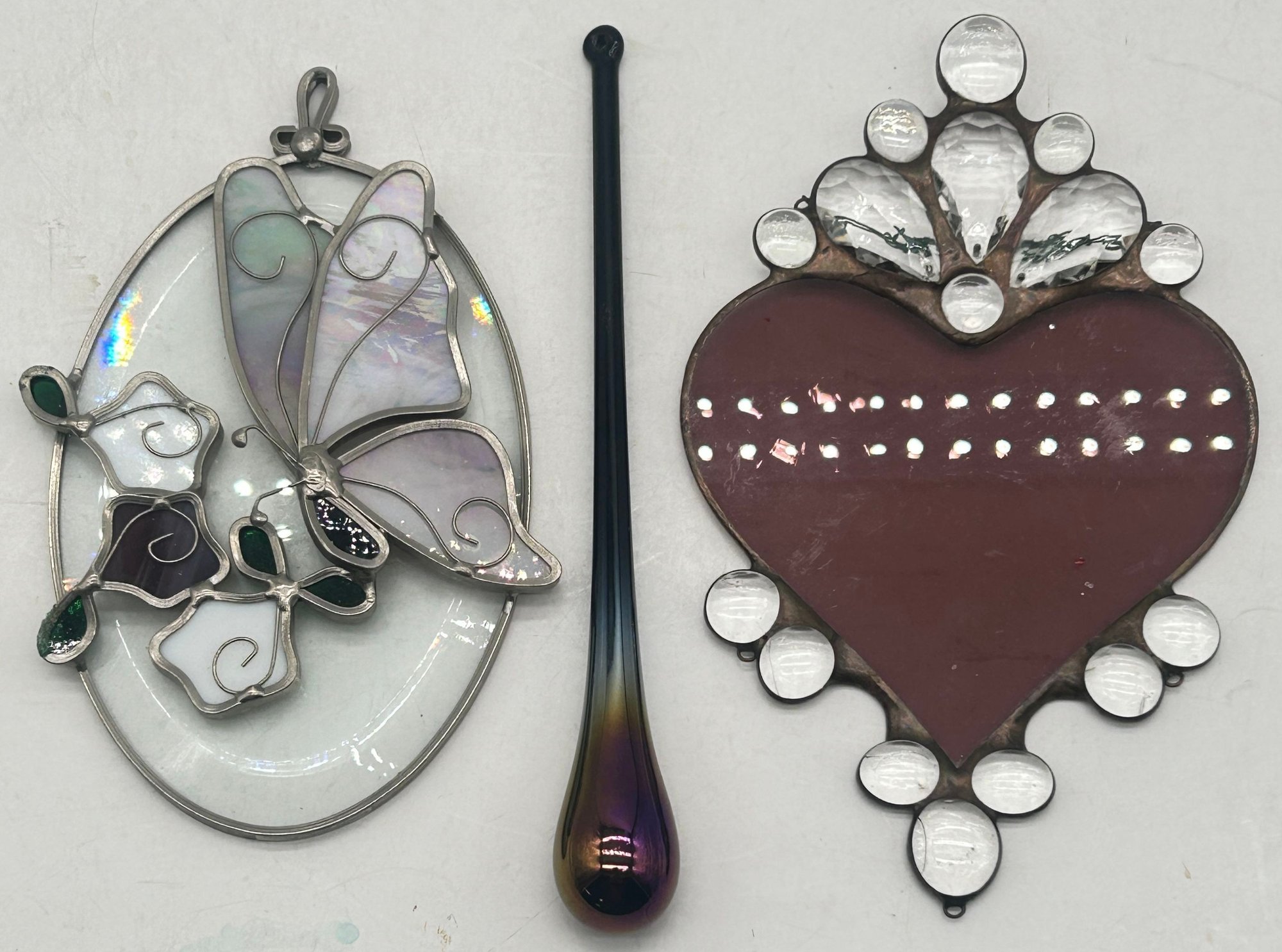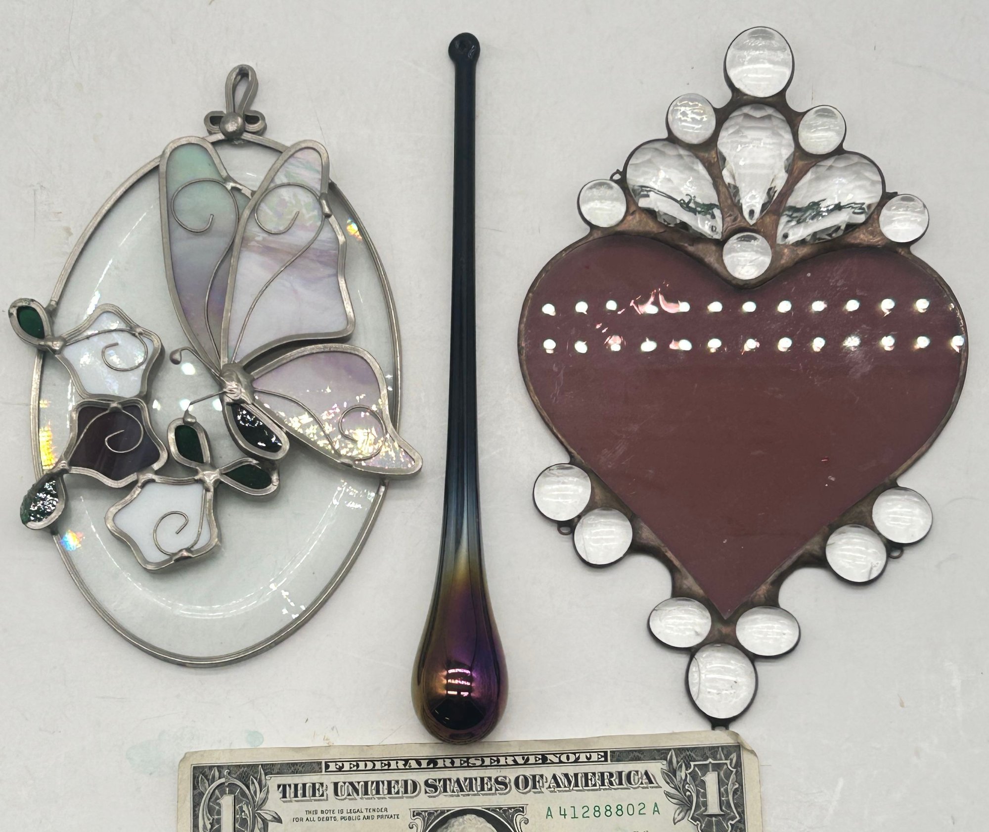 3 Pcs - Stained Glass 3-D Butterfly Light Catcher & Heart With Bubbles And Iridescent 8.25"L Teardrop