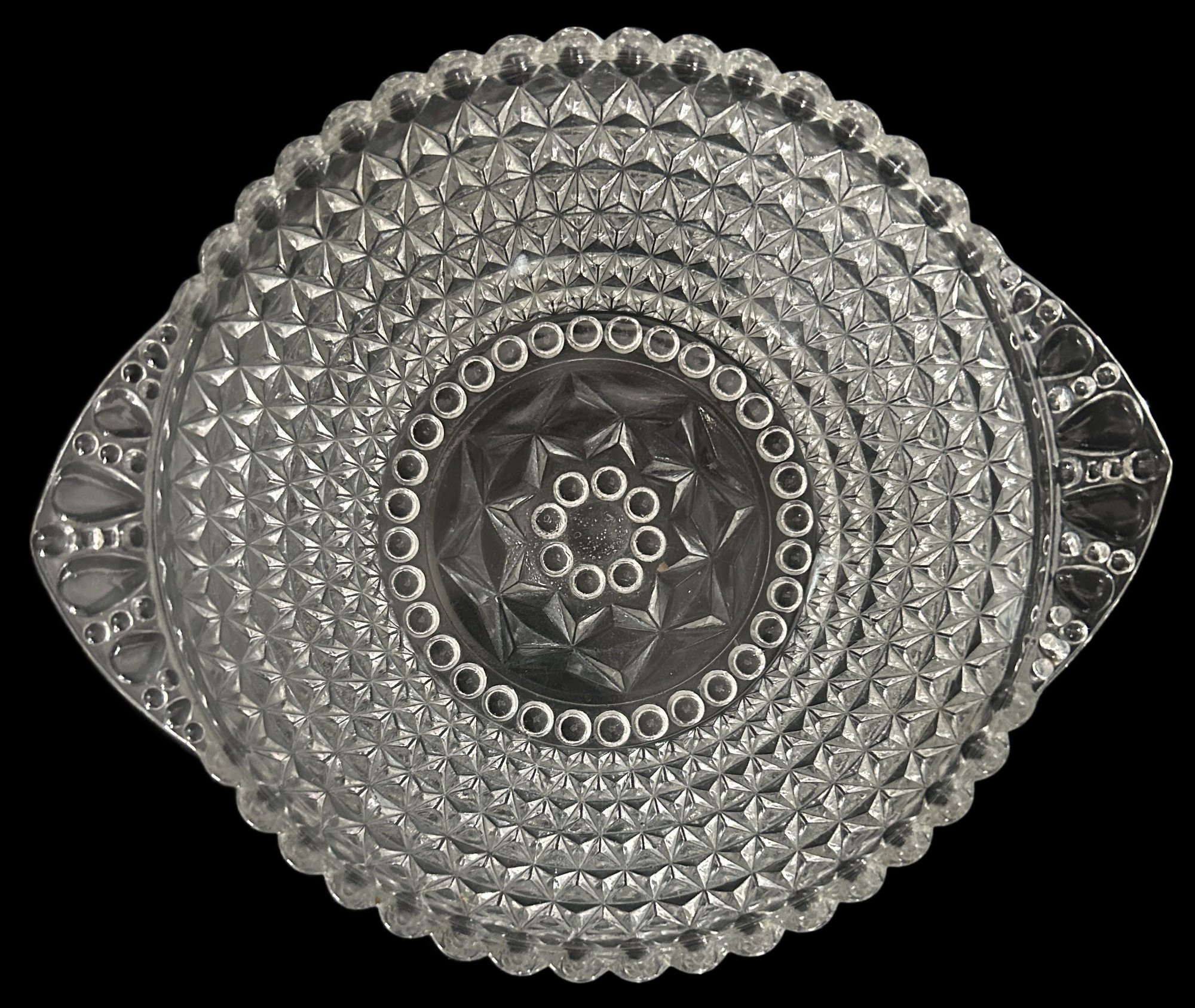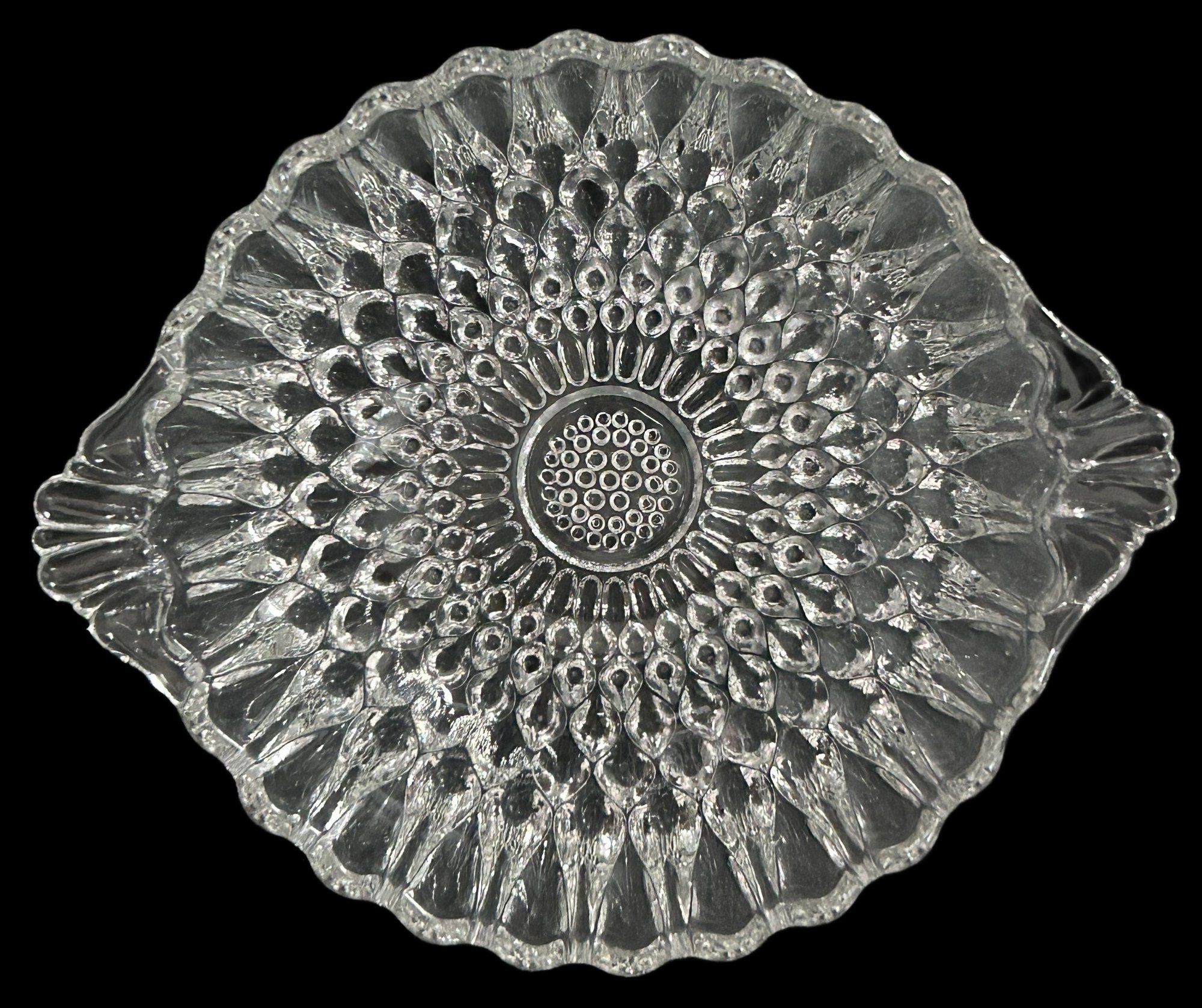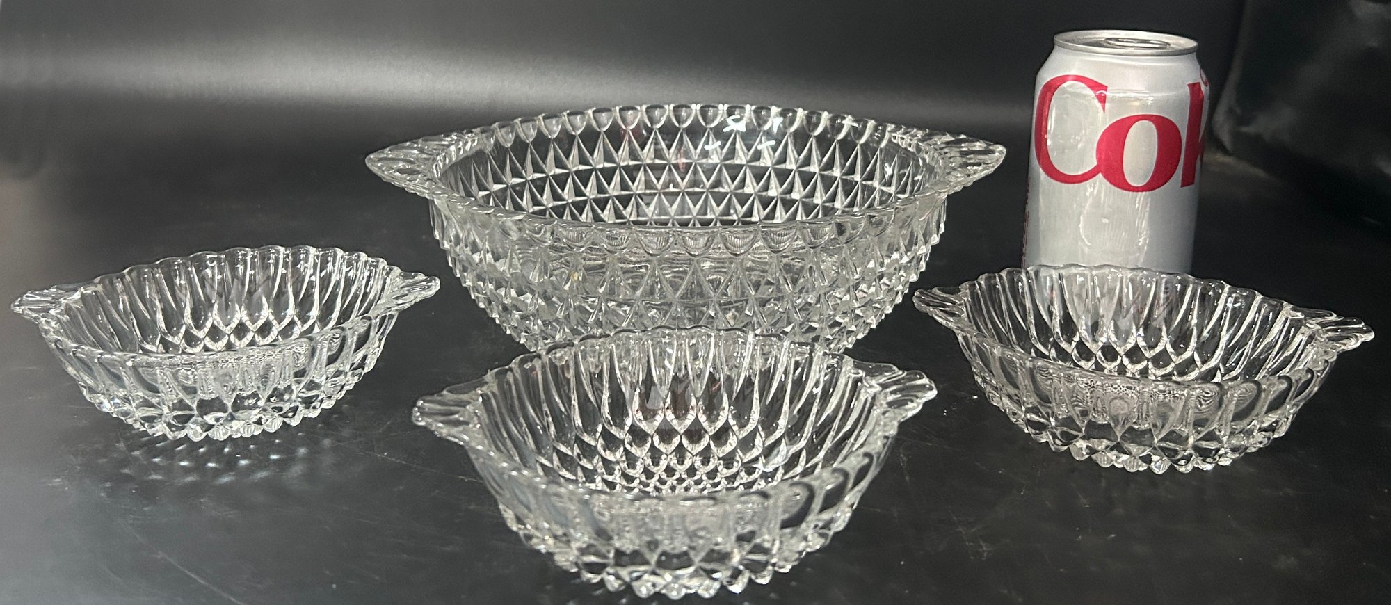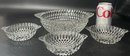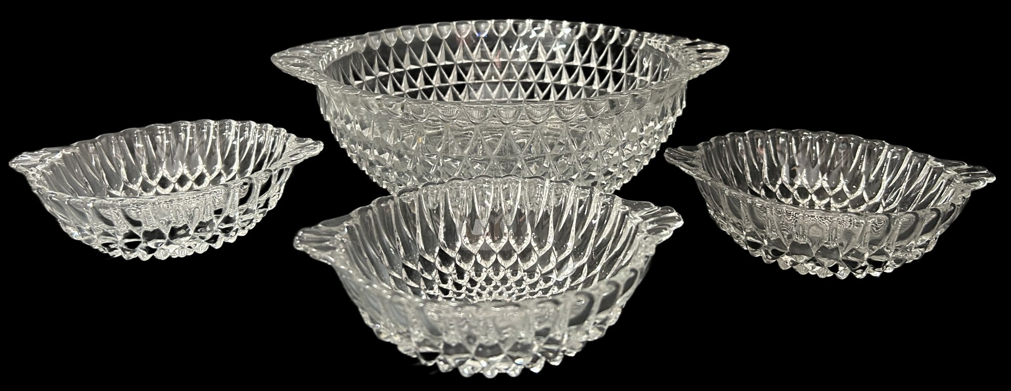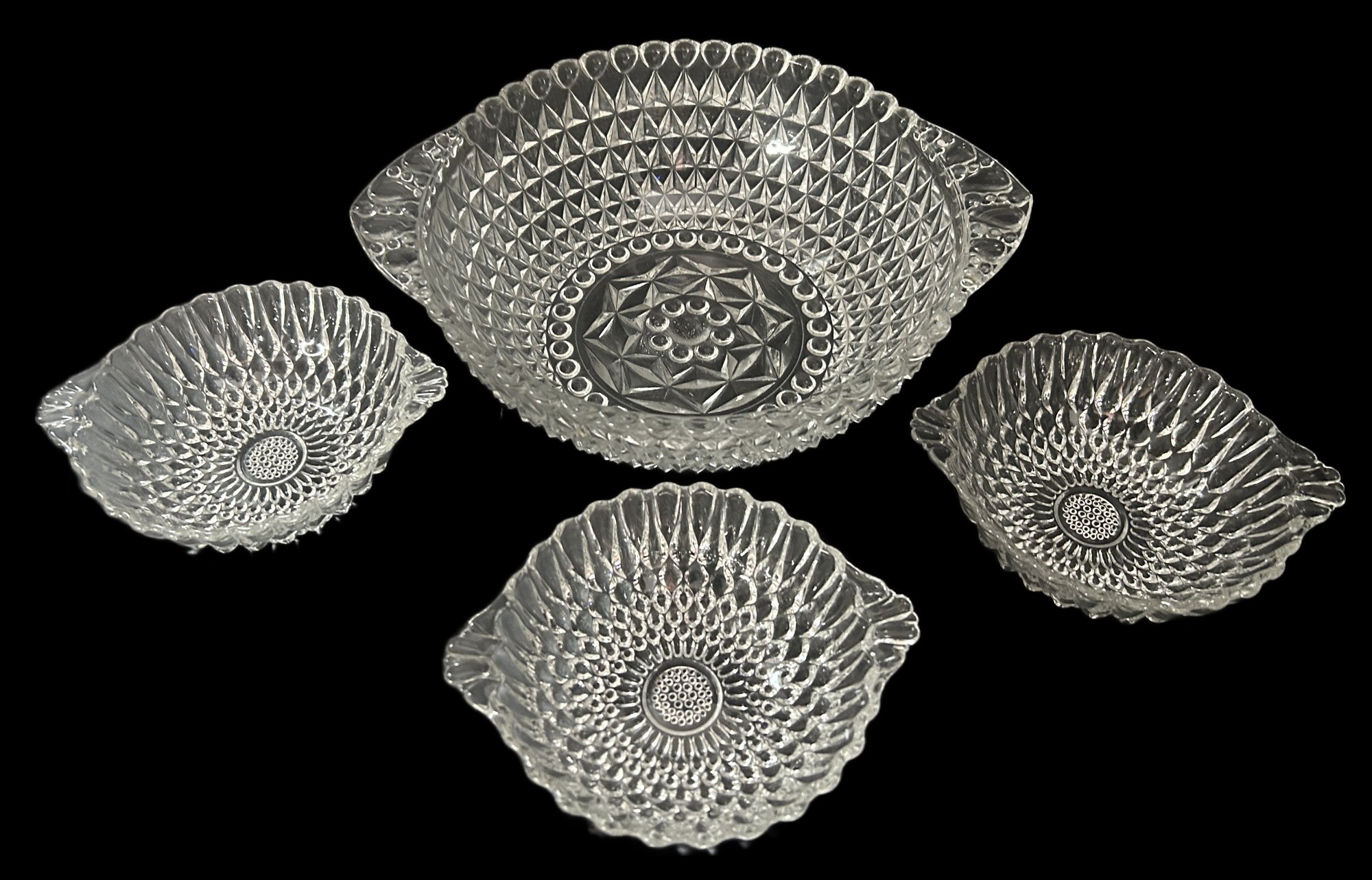 4 Pcs Vintage Clear Pressed Glass Diamond Point Tear Drop 8.75" Diam. Serving Bowl & 3-Individual Bowls