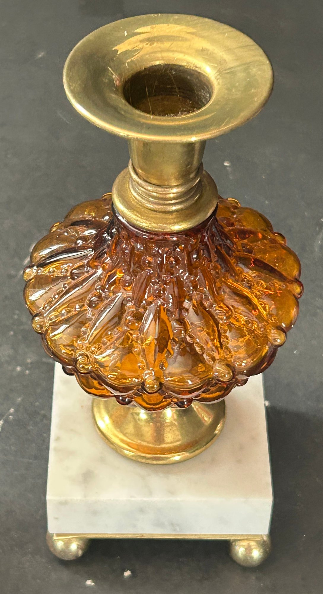 Pair Vintage Candlestick Holders With Amber Patterned Glass Fonts, Brass Accents On Marble Base, 7.25"H