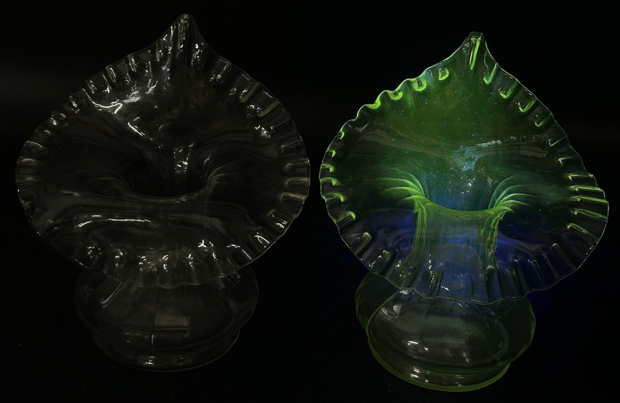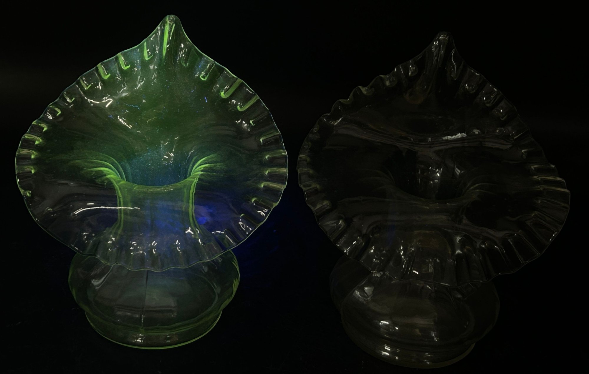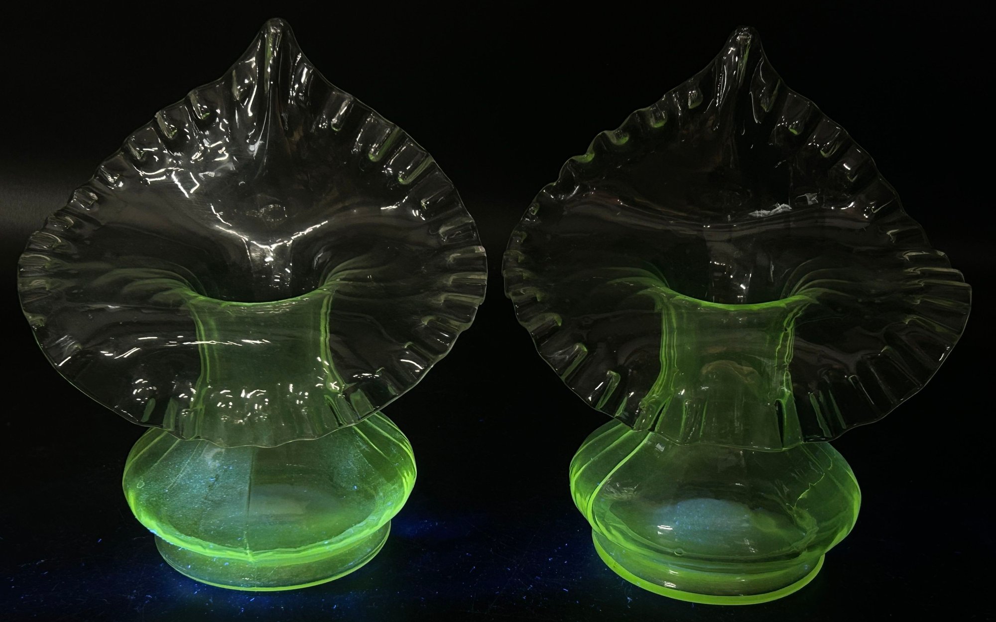 Pair Vintage Jack-In-The-Pulpit Clear Uranium Glass Vases, 6.75"H
