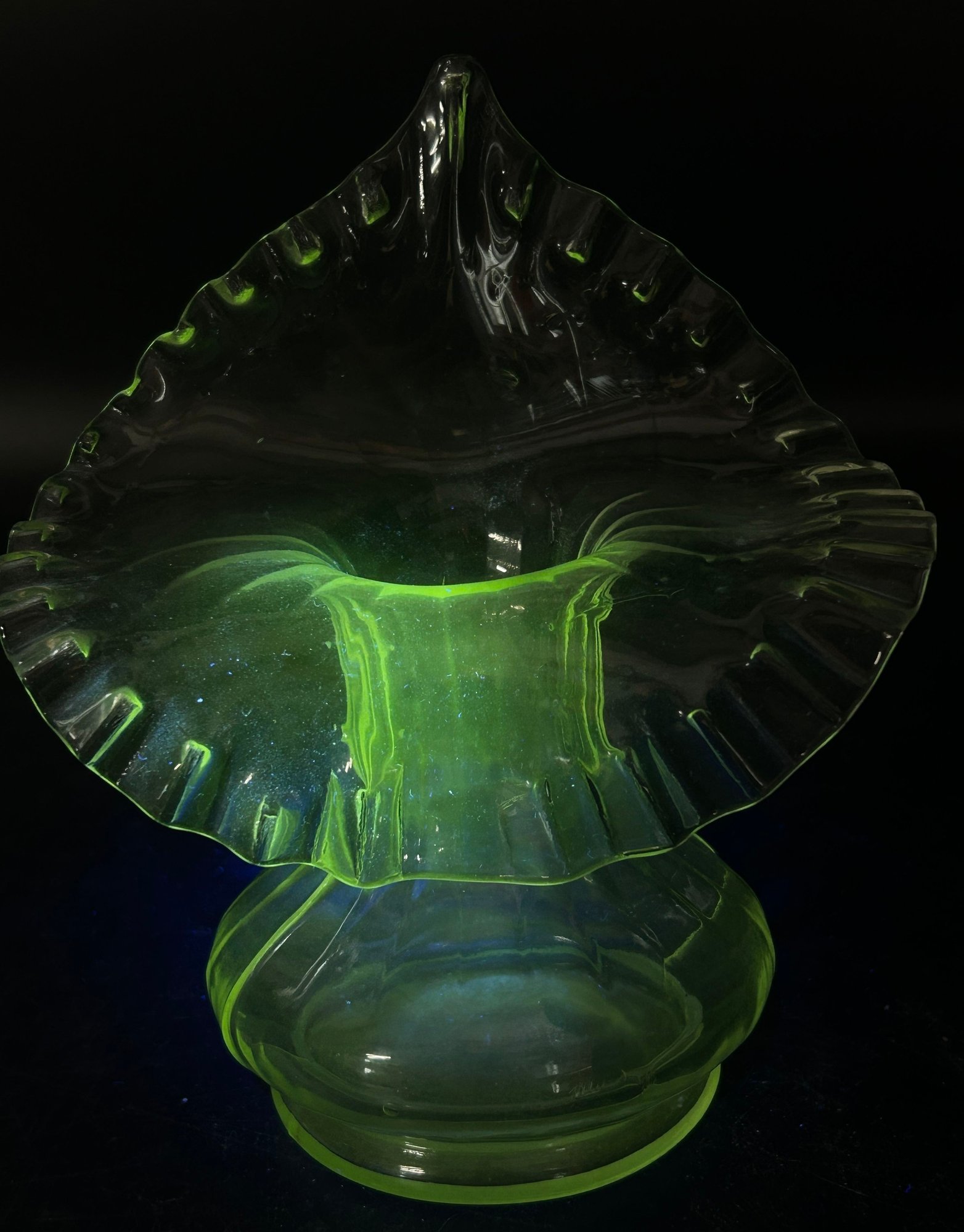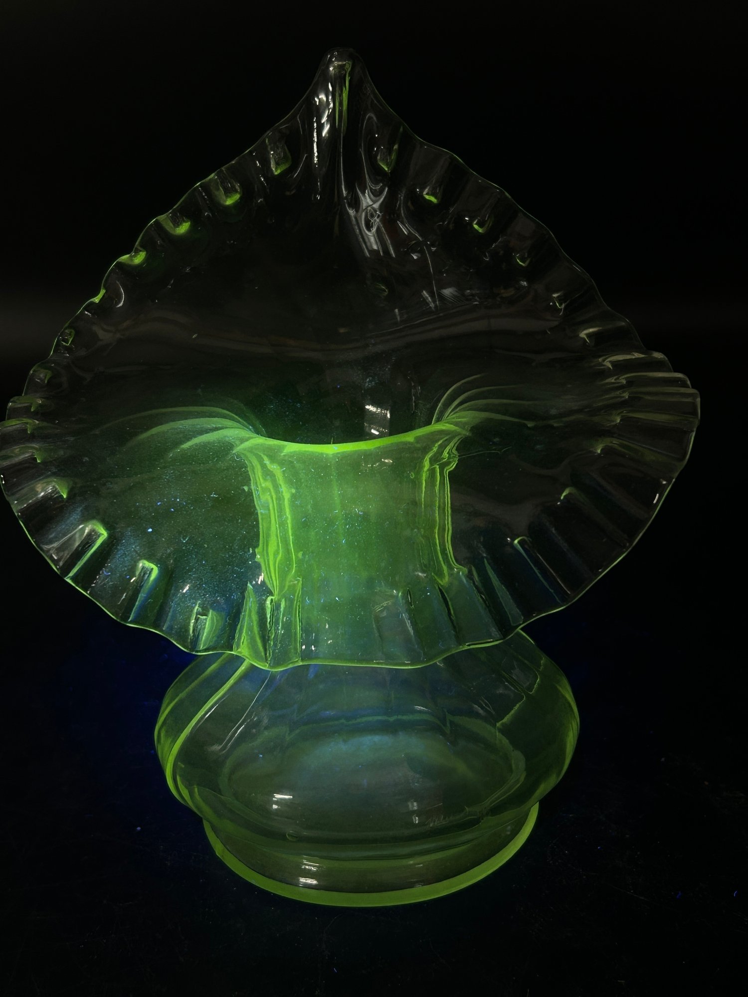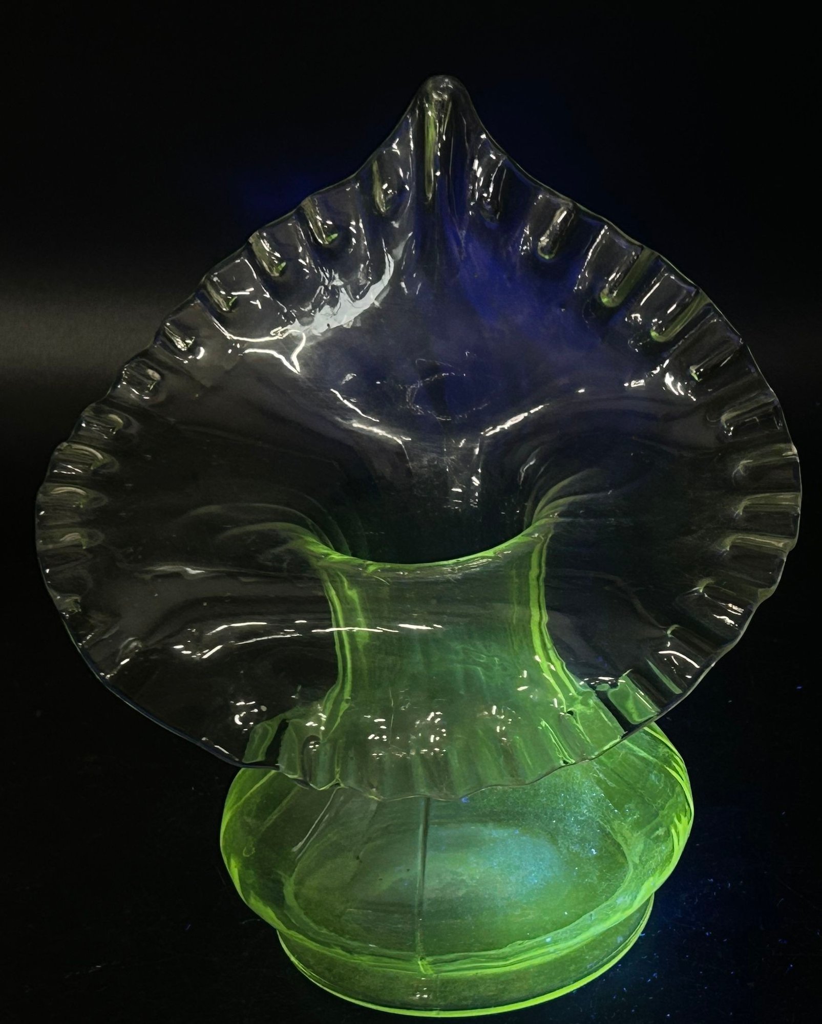 Pair Vintage Jack-In-The-Pulpit Clear Uranium Glass Vases, 6.75"H