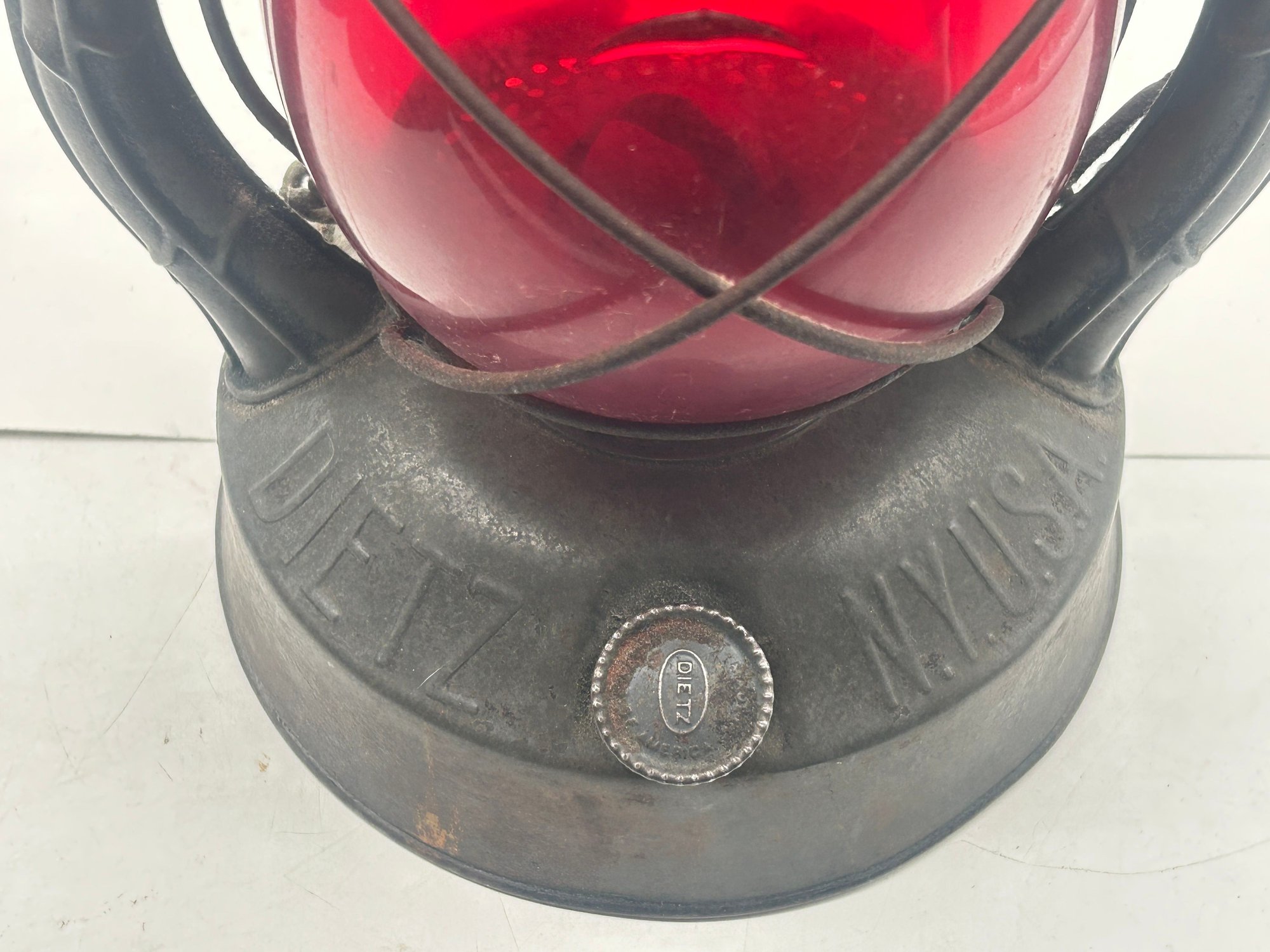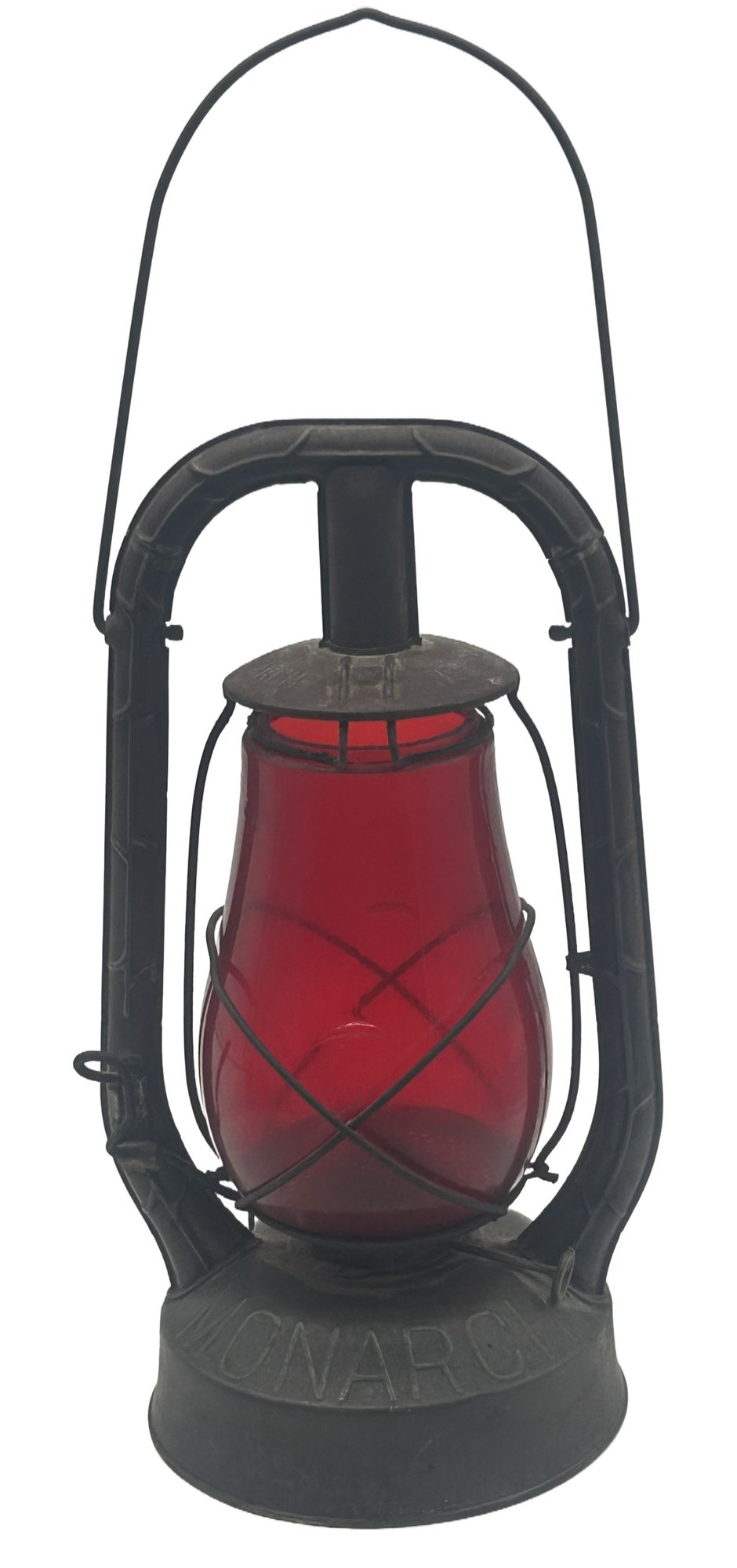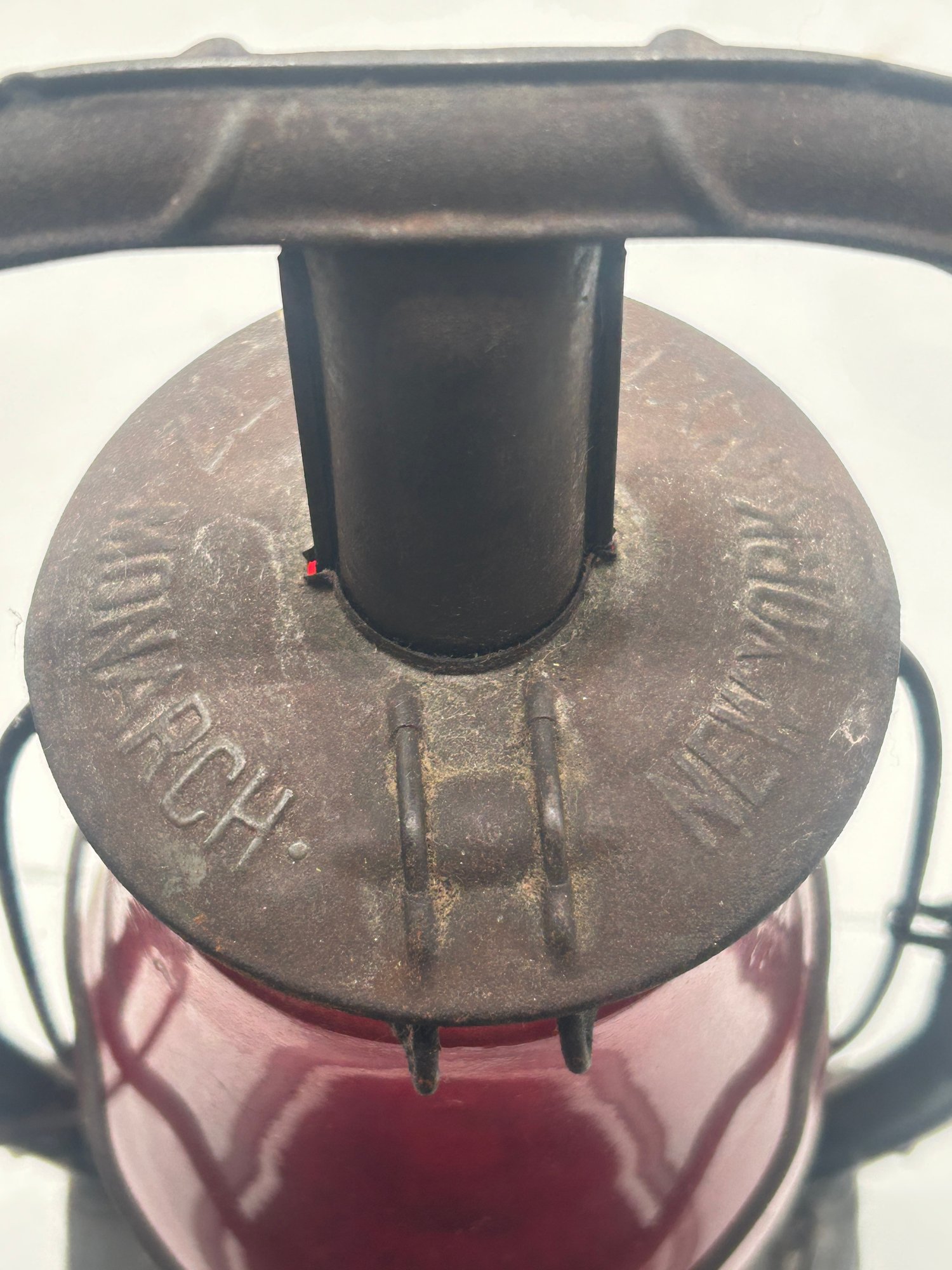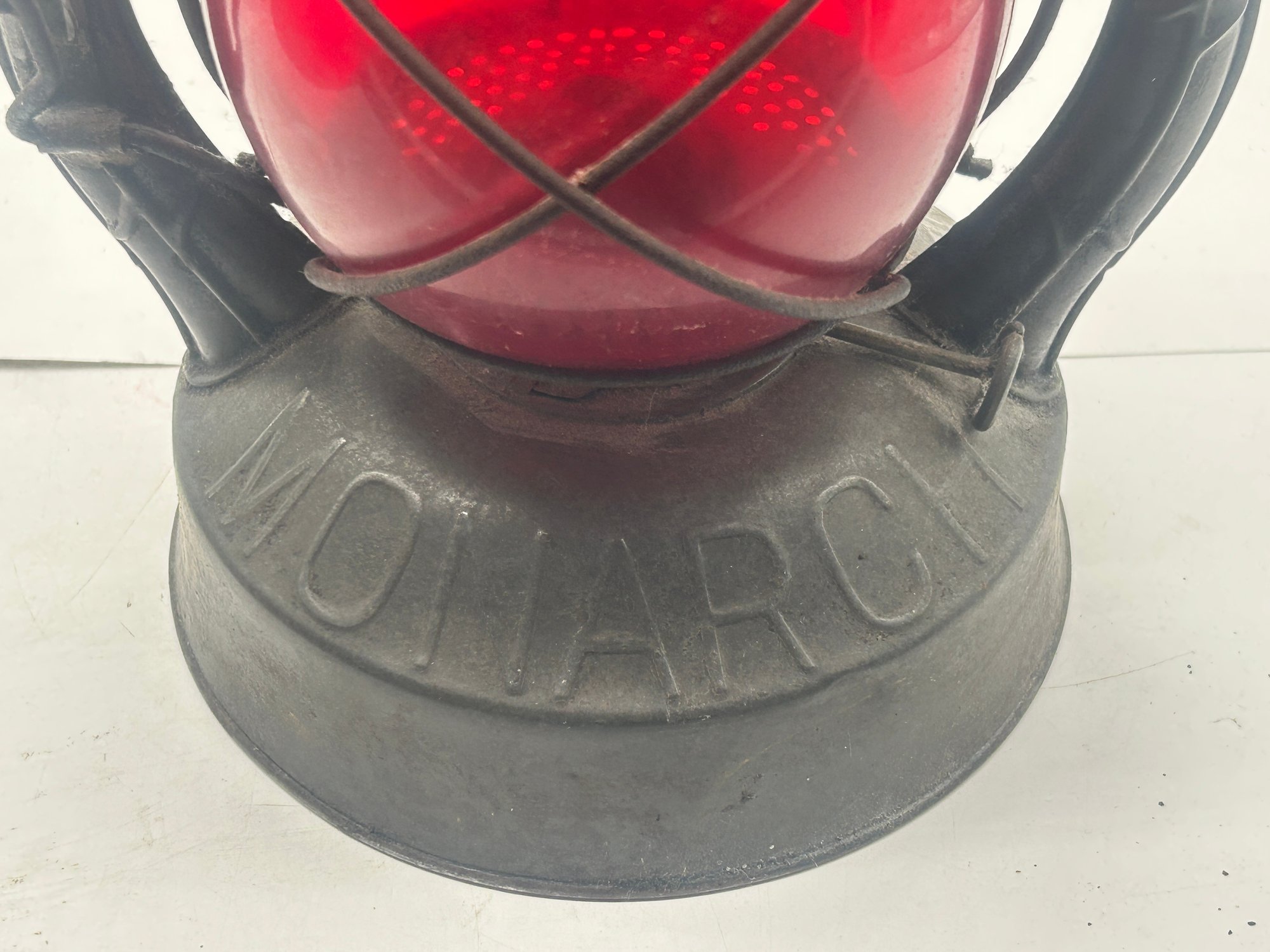 Antique Dietz Monarch Railroad Lantern With Red Glass Globe, 18.5"H (Handle Up)
