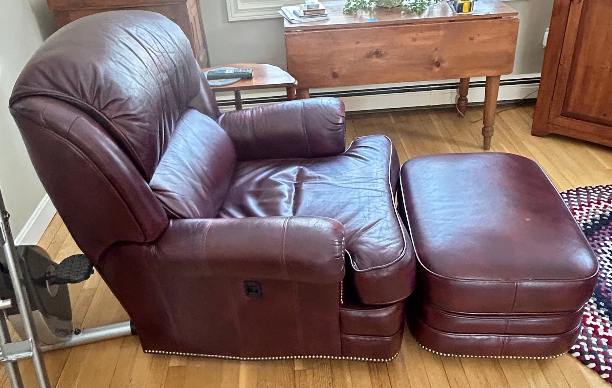 Burgundy Leather Swivel Recliner 36" Sq X 39"H, And Rolling Ottoman,
