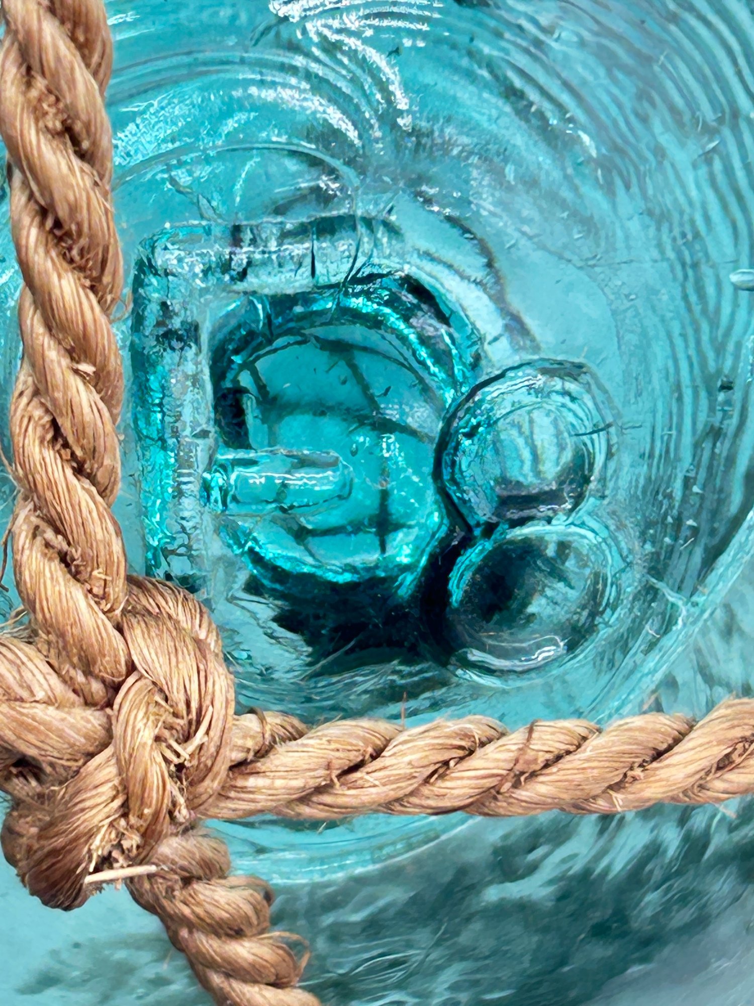 Hand-Blown Aqua Glass Rope Bound Fishing Float, Marked "F8", 5.5" Diam.