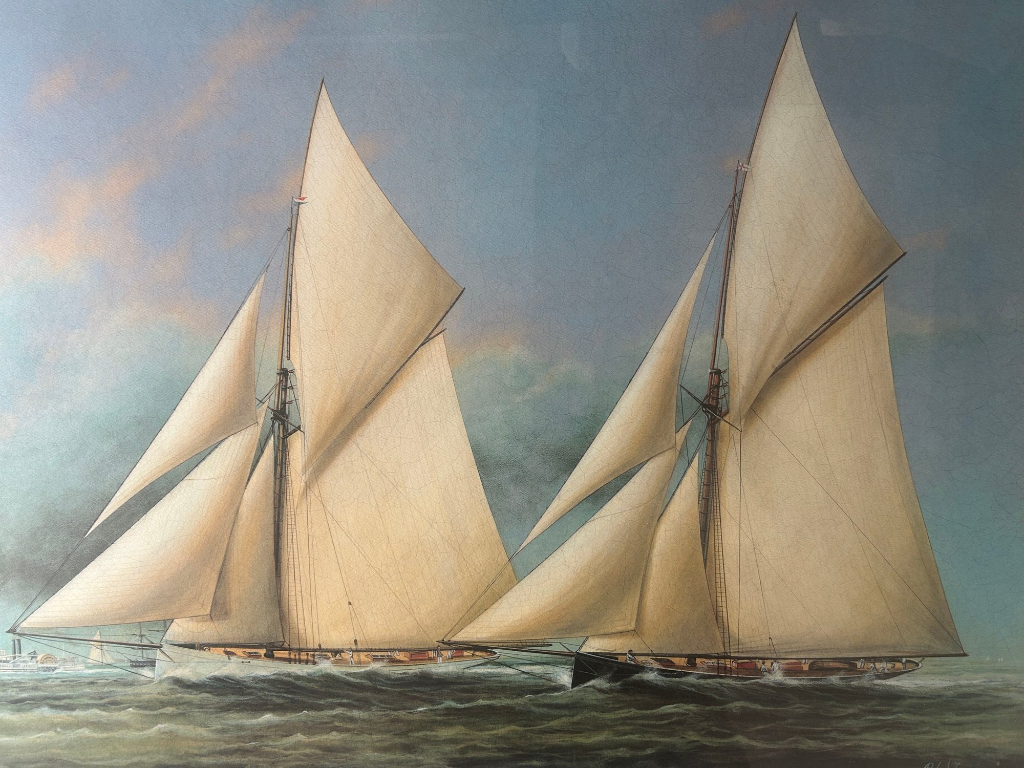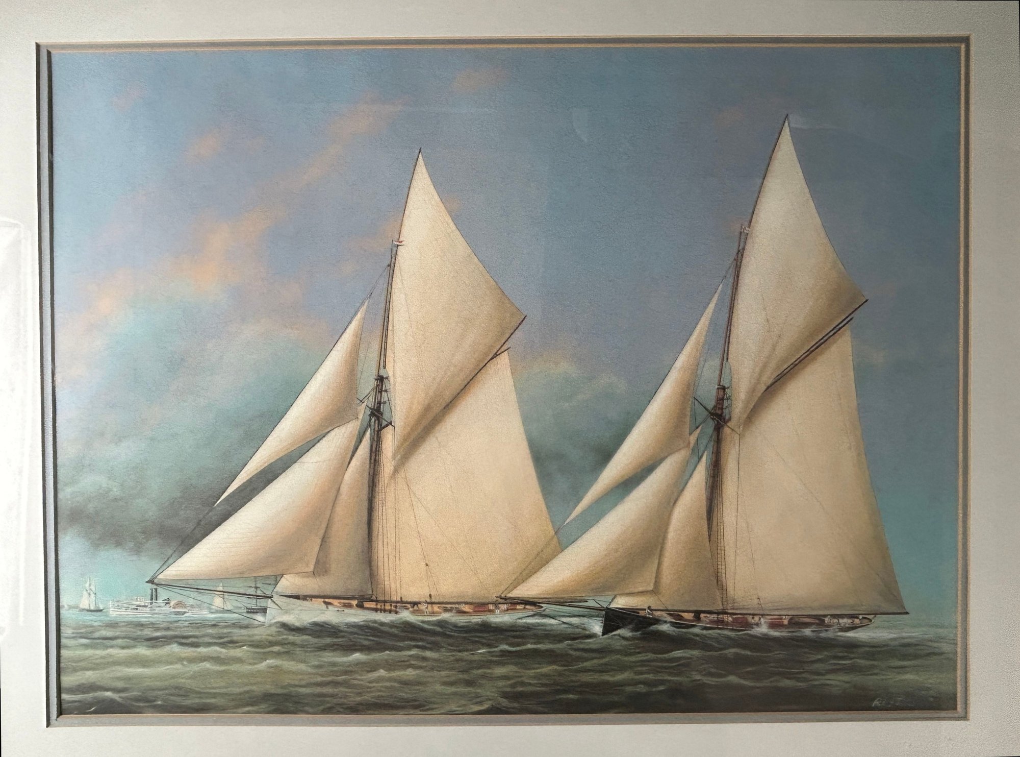 Large Well Framed & Double Matted Print Of Two Racing Yachts, 35.75" X 28.25"H