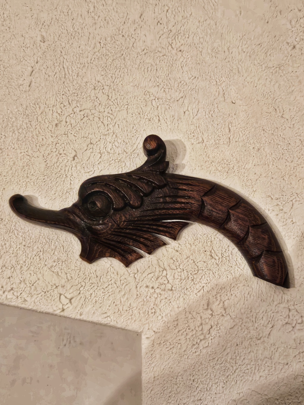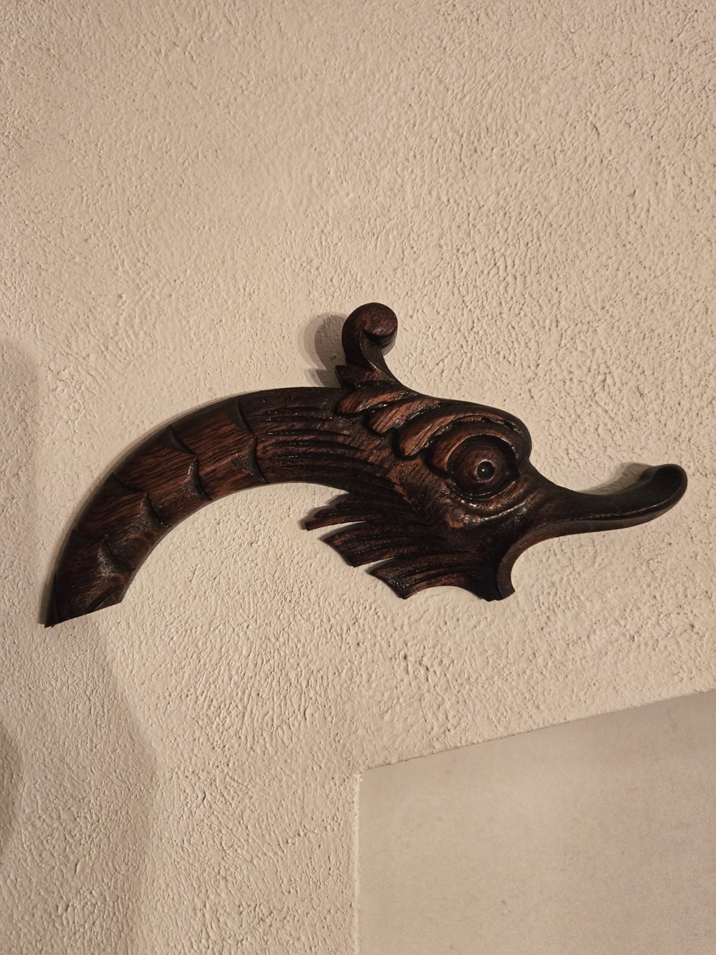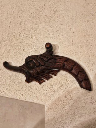 Beautifully carved wooden pair of sea creature profile busts each measure approximately 9 inches long