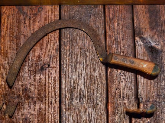Gorgeous vignette of Farm tools ranging in size from 18 inches to over 2 feet.
