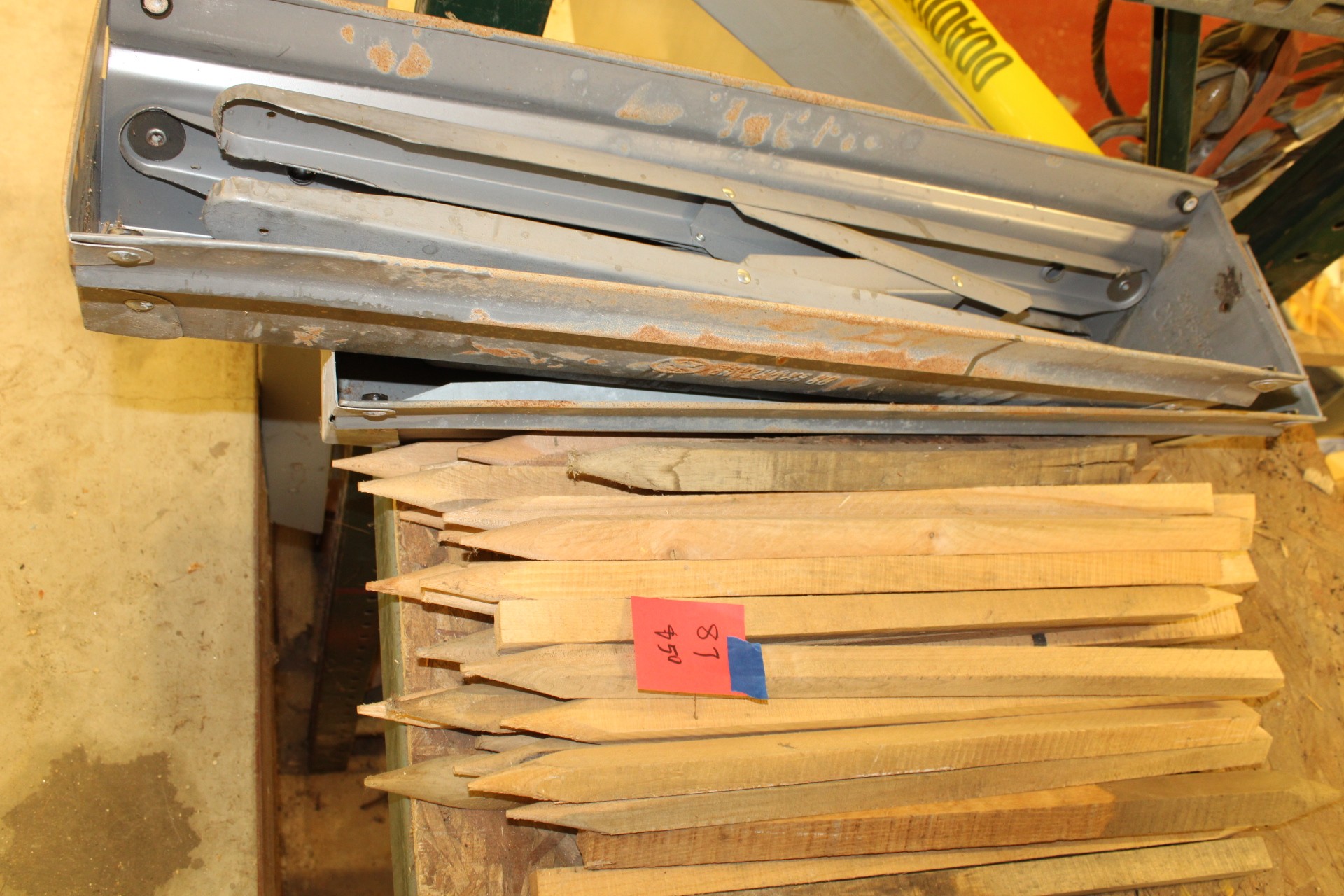 2 metal sawhorses and wooden stakes