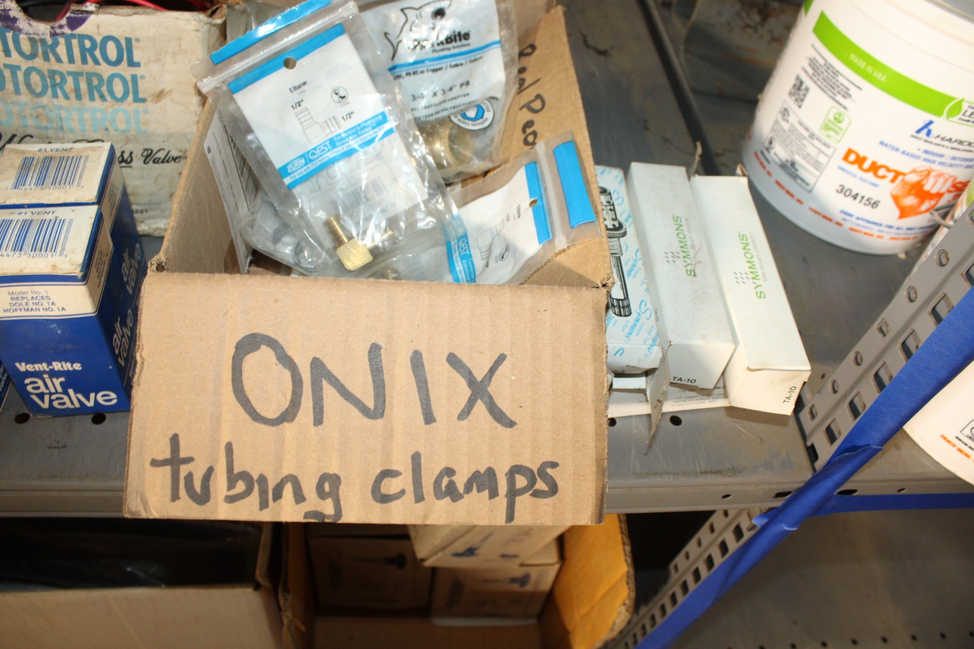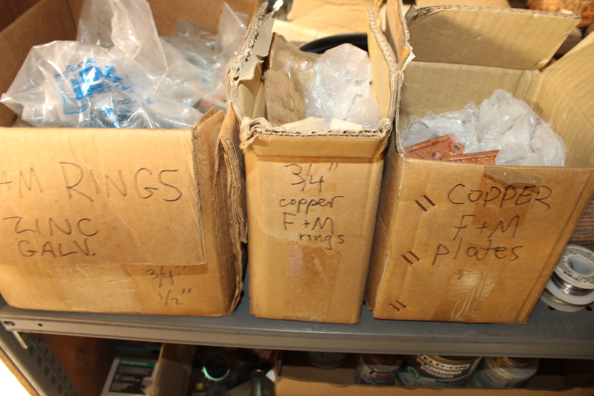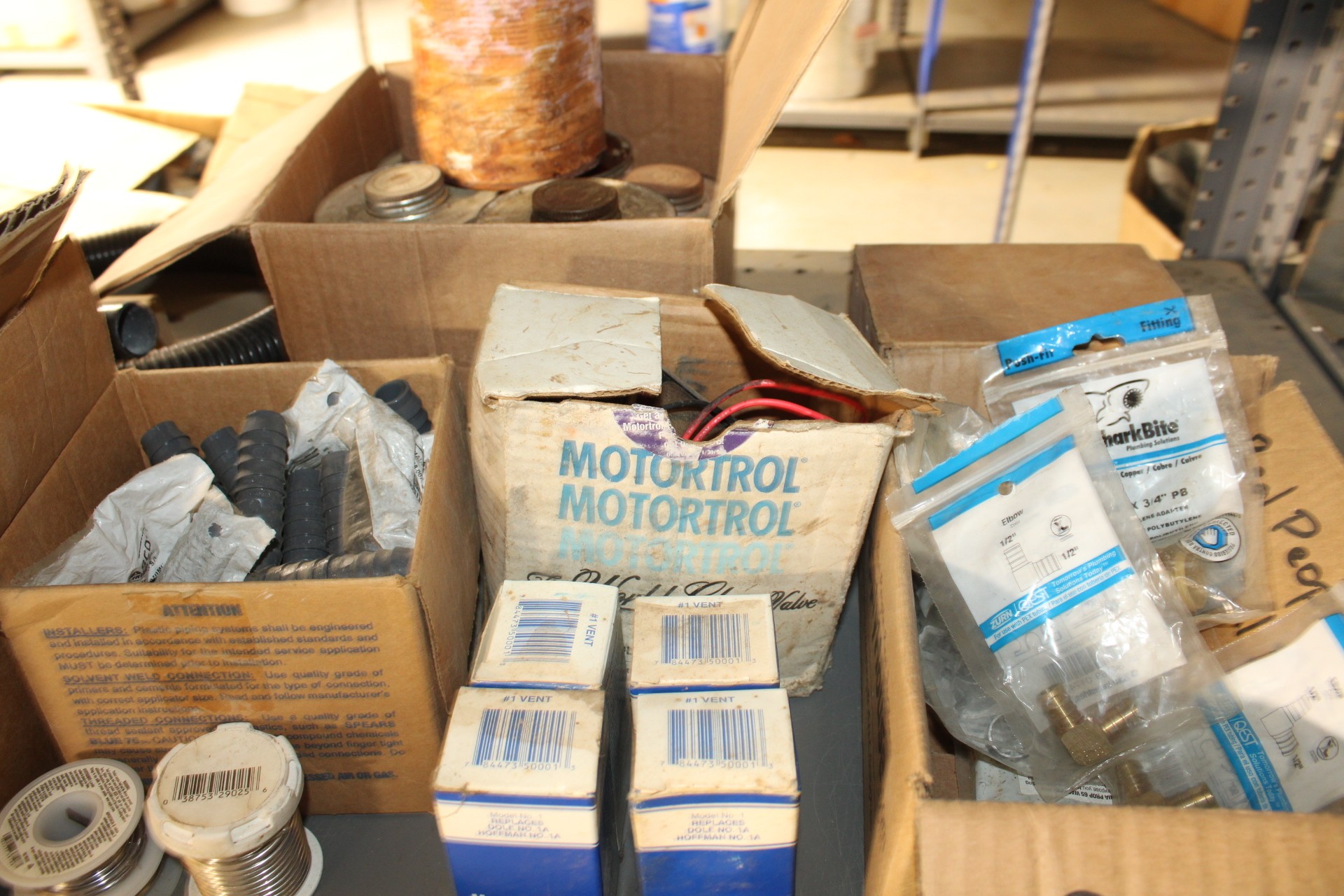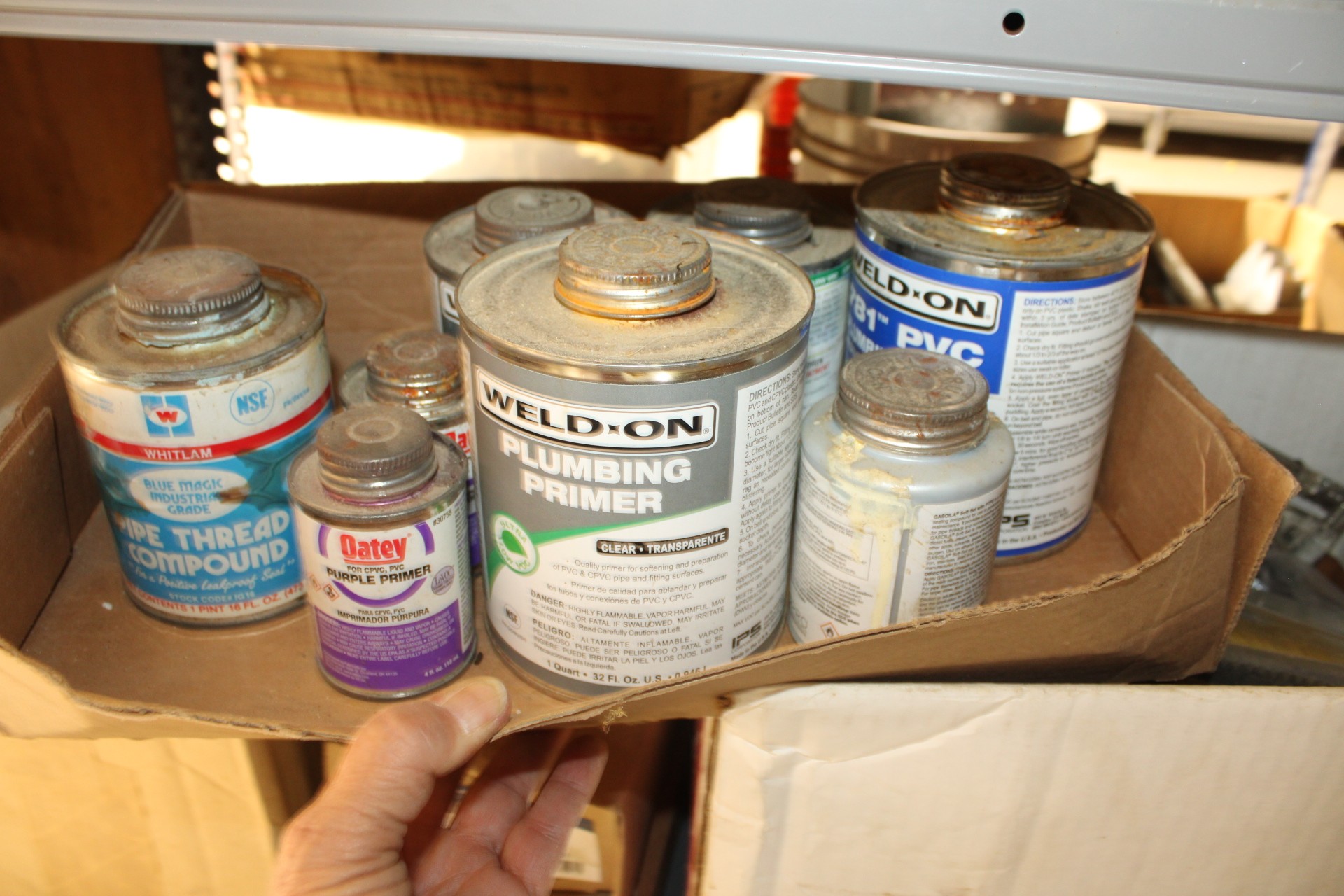 2 shelves shark bite fittings, uniflange ball valves, plumbing primer
