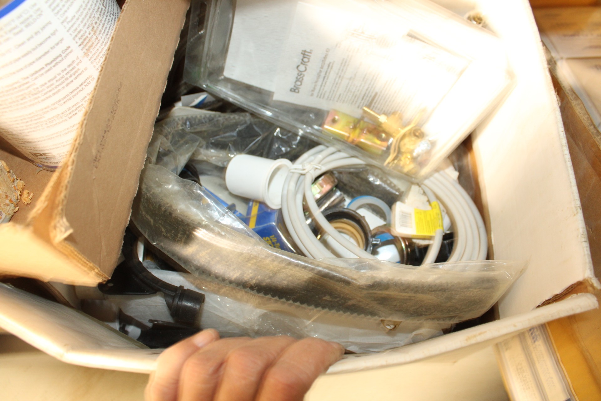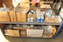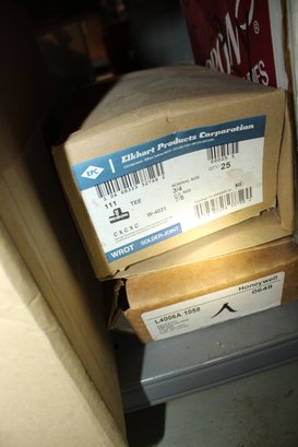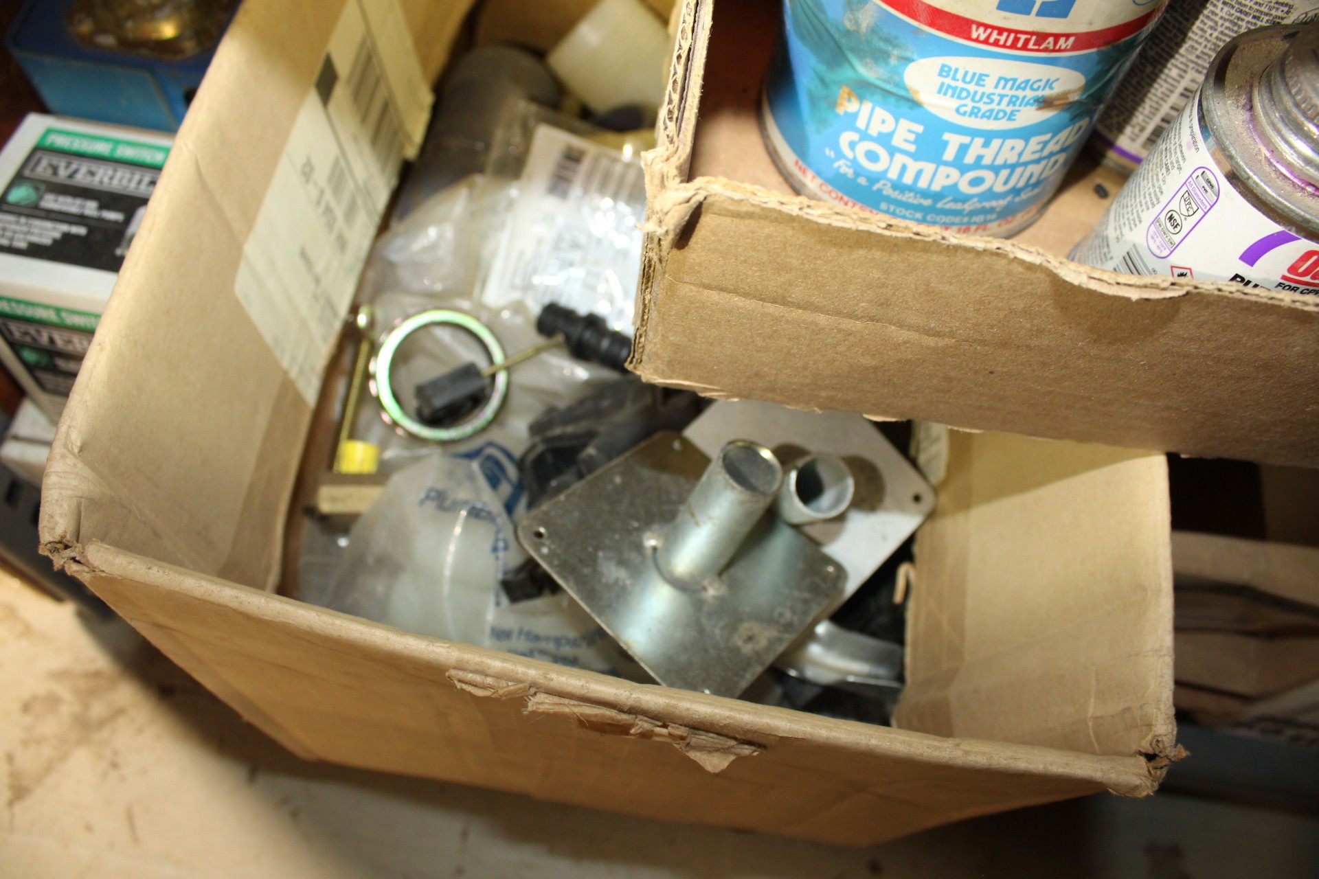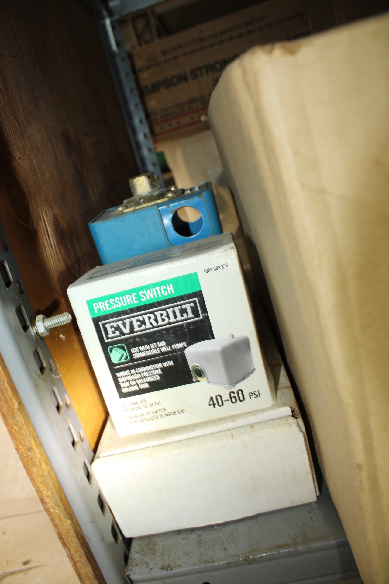 2 shelves shark bite fittings, uniflange ball valves, plumbing primer