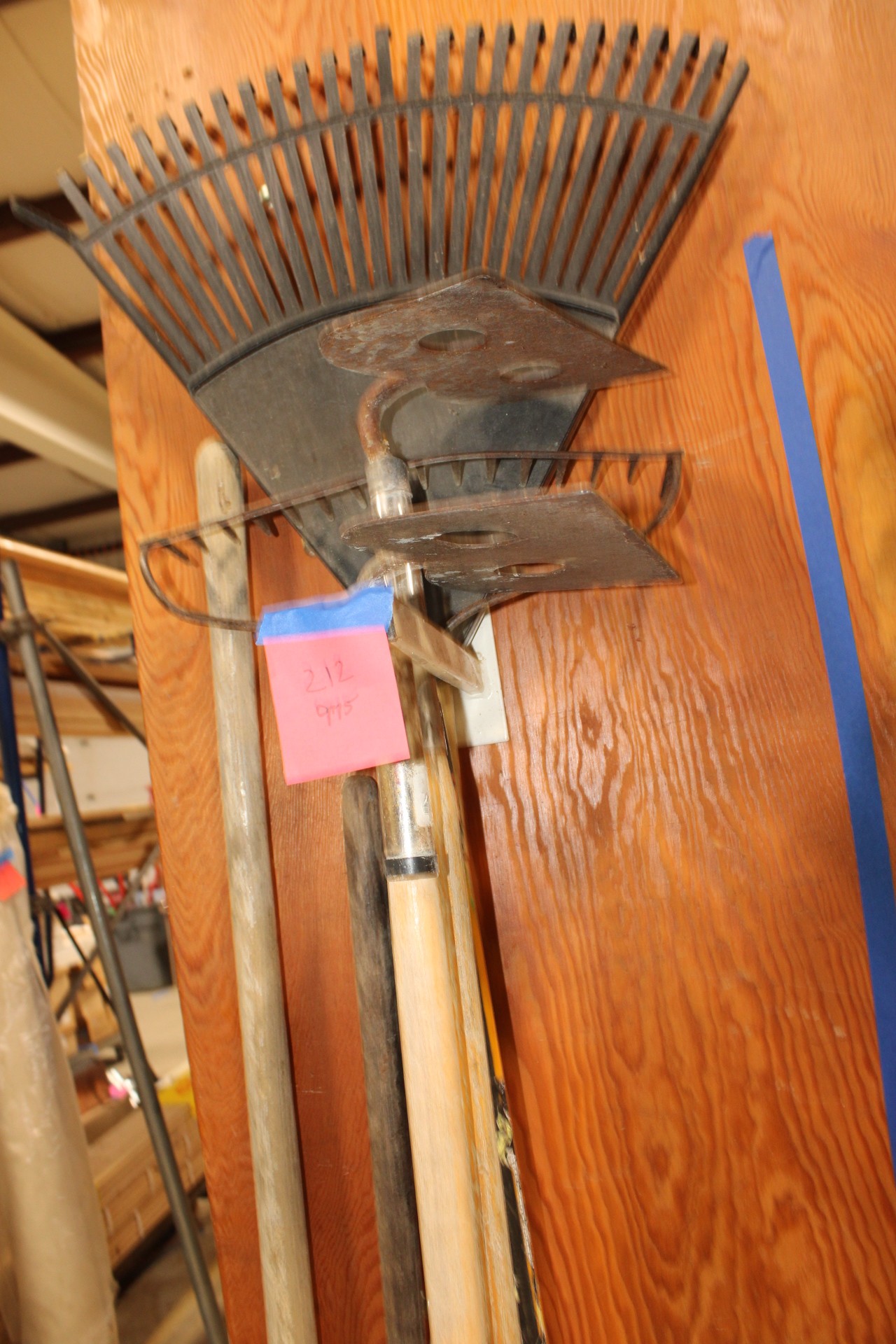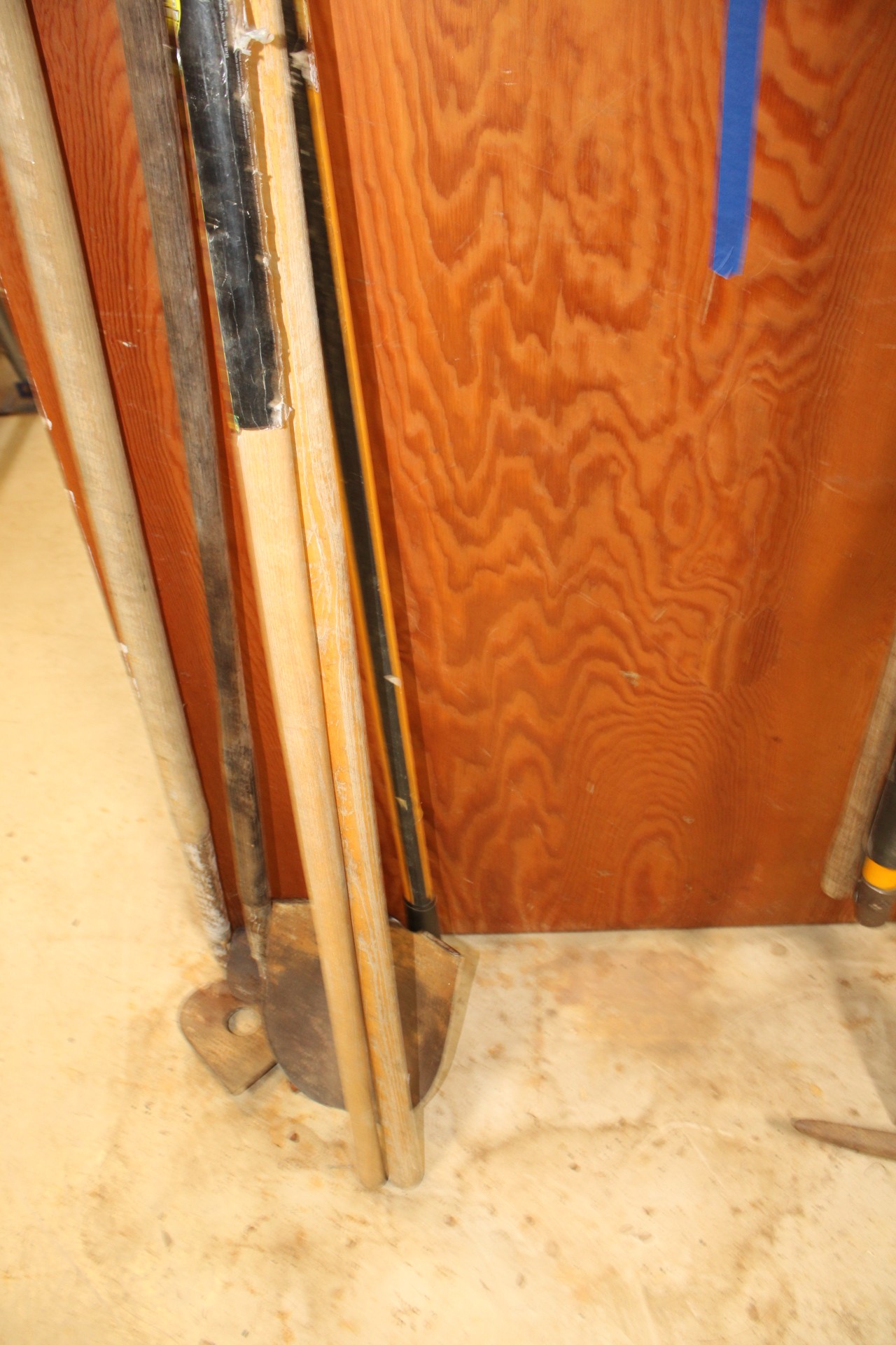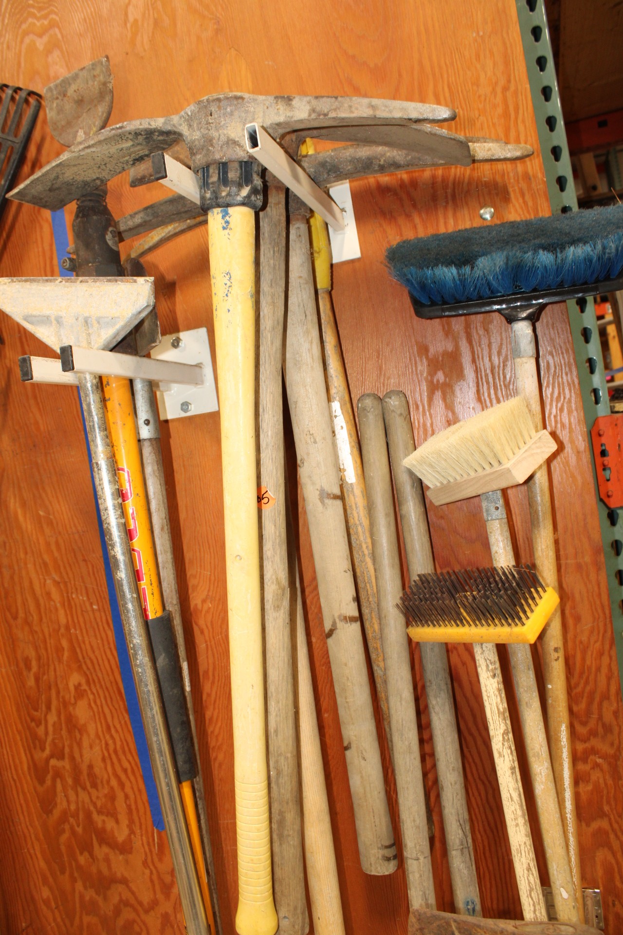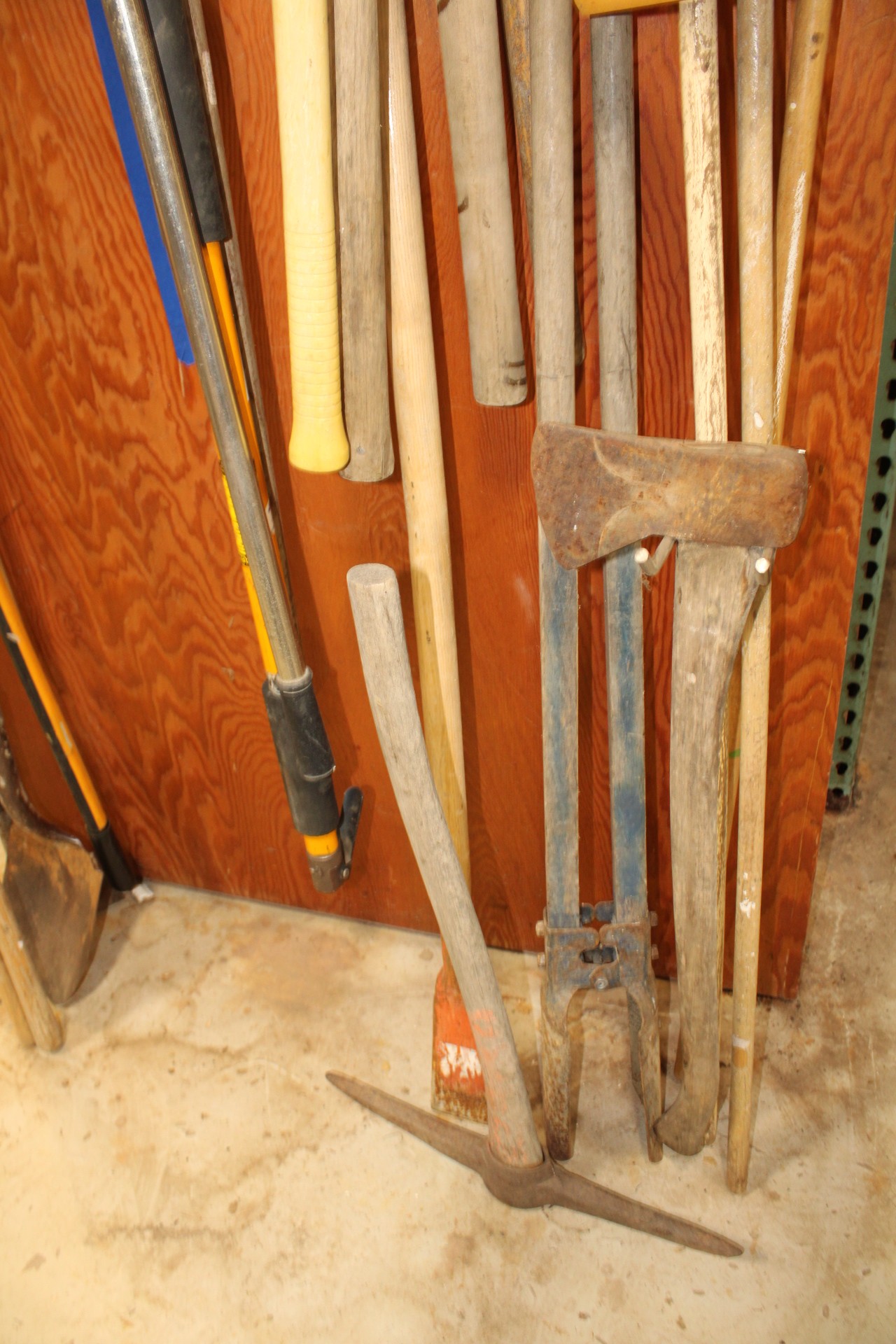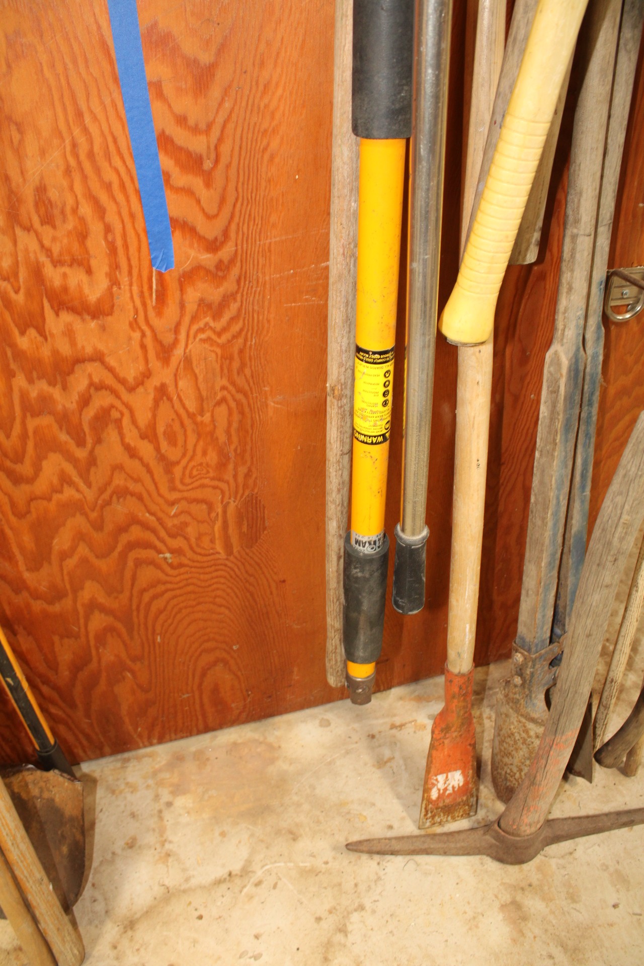 22 lawn tools, post hole digger, pick axe, shovel, hoe