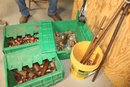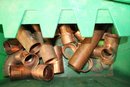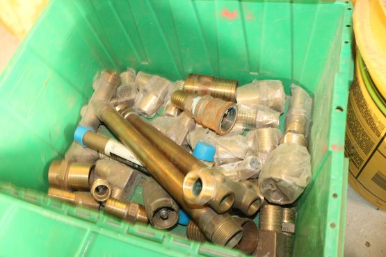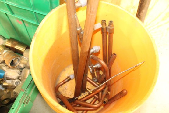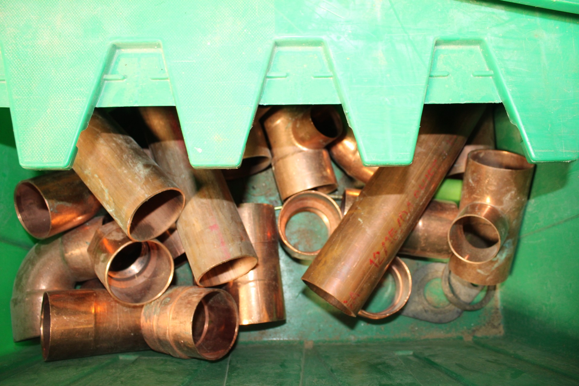 3 totes of copper fittings up to 2 inch , pipe bender misc