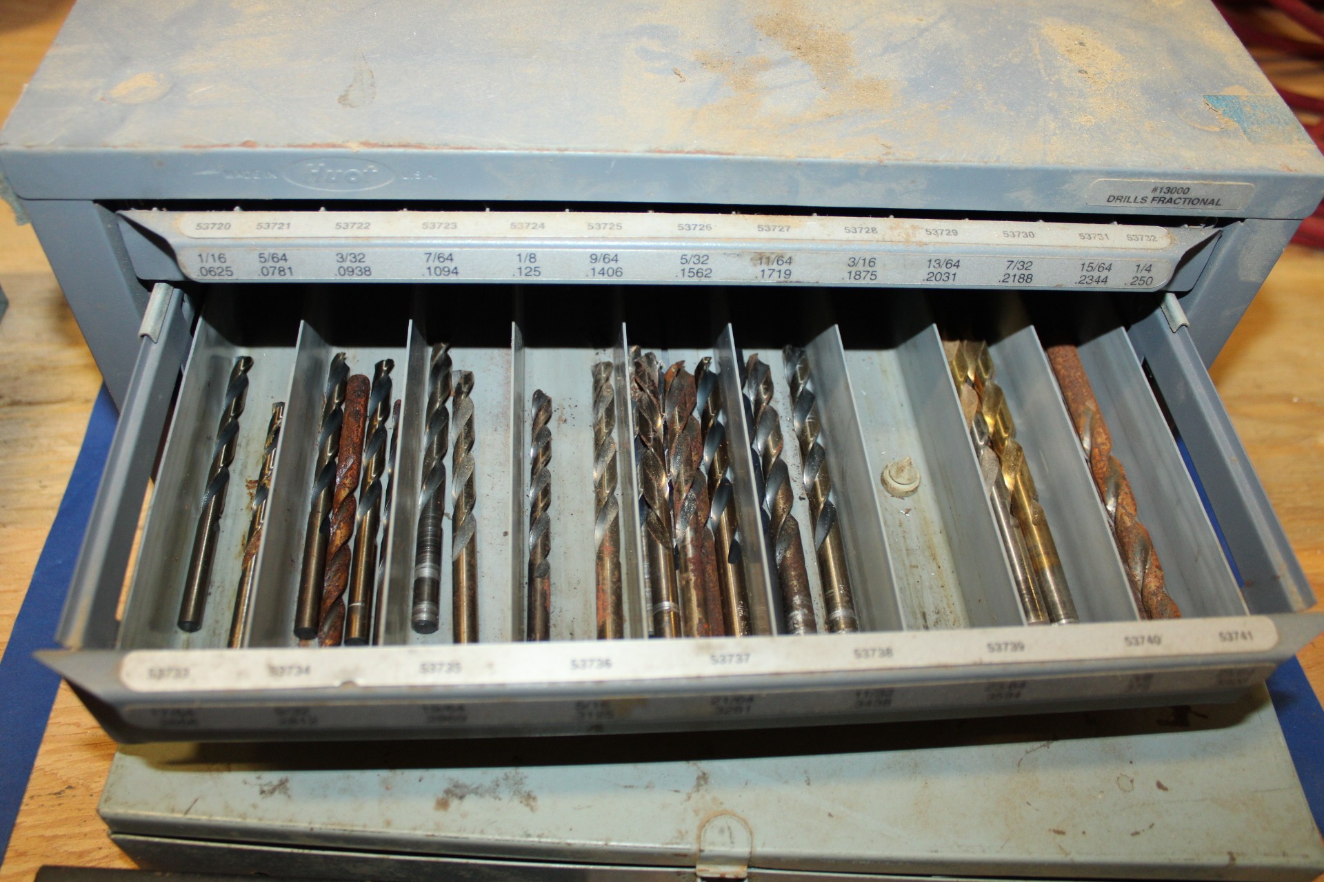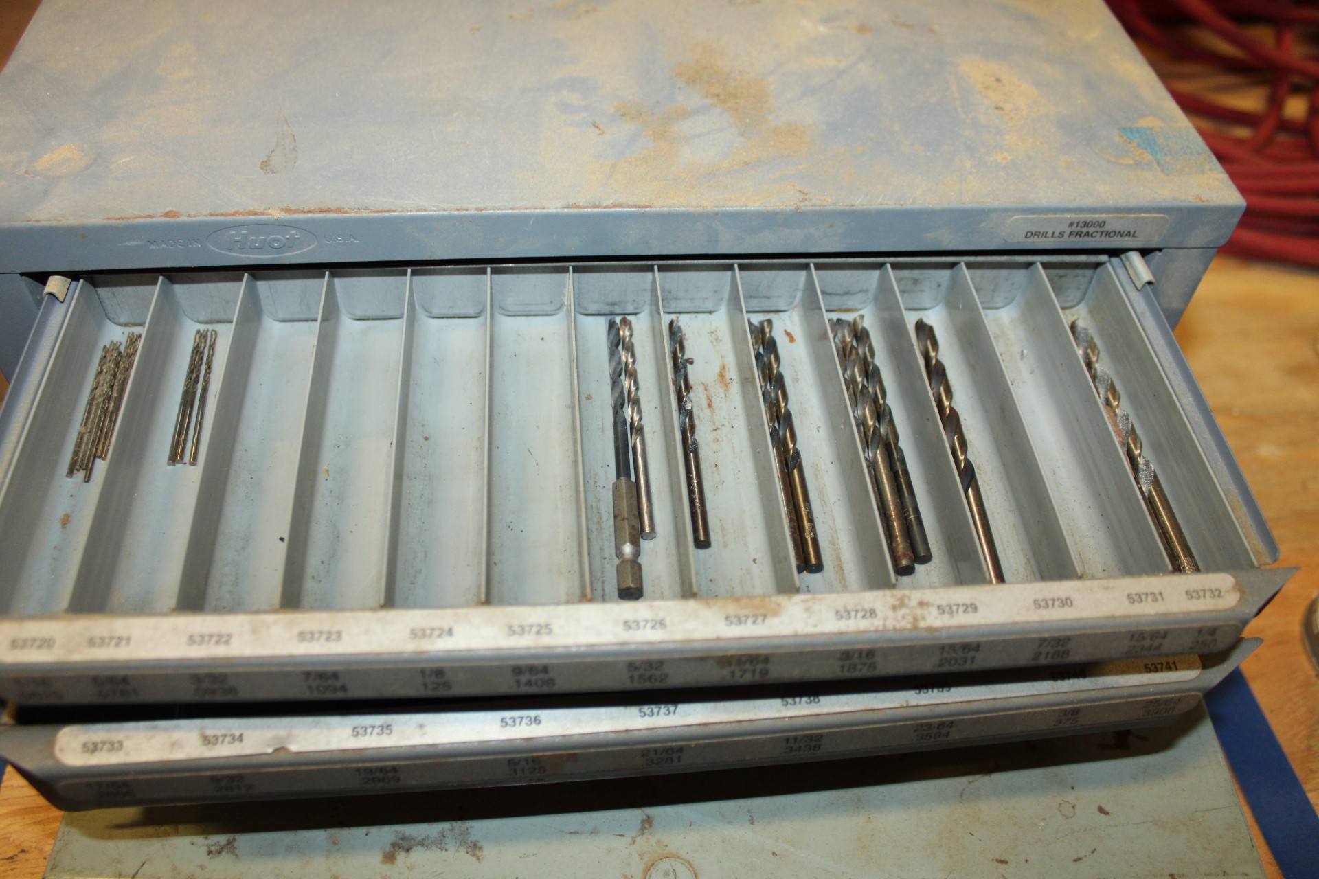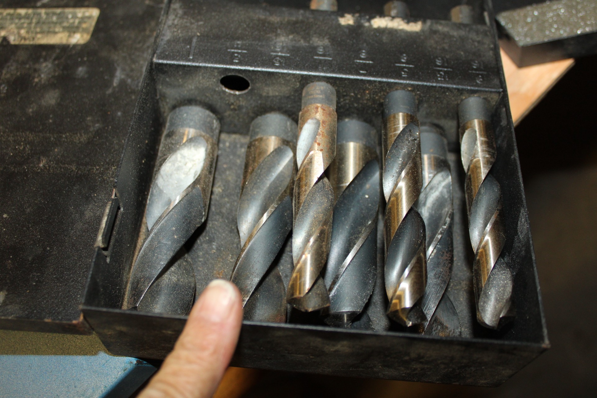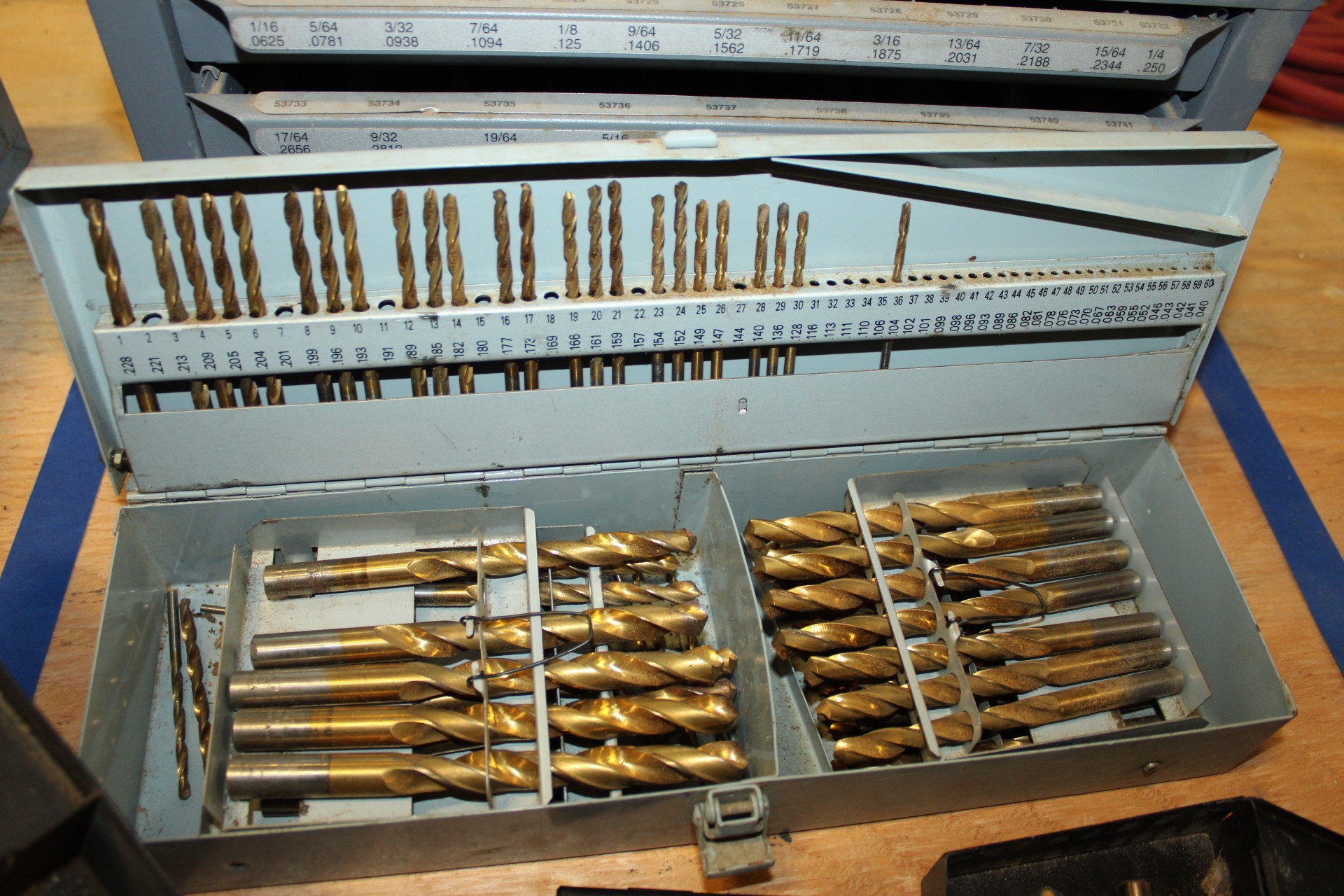 Big lot of drill bits in 5 different cases various sizes up to 1 inch gold tip, carbide