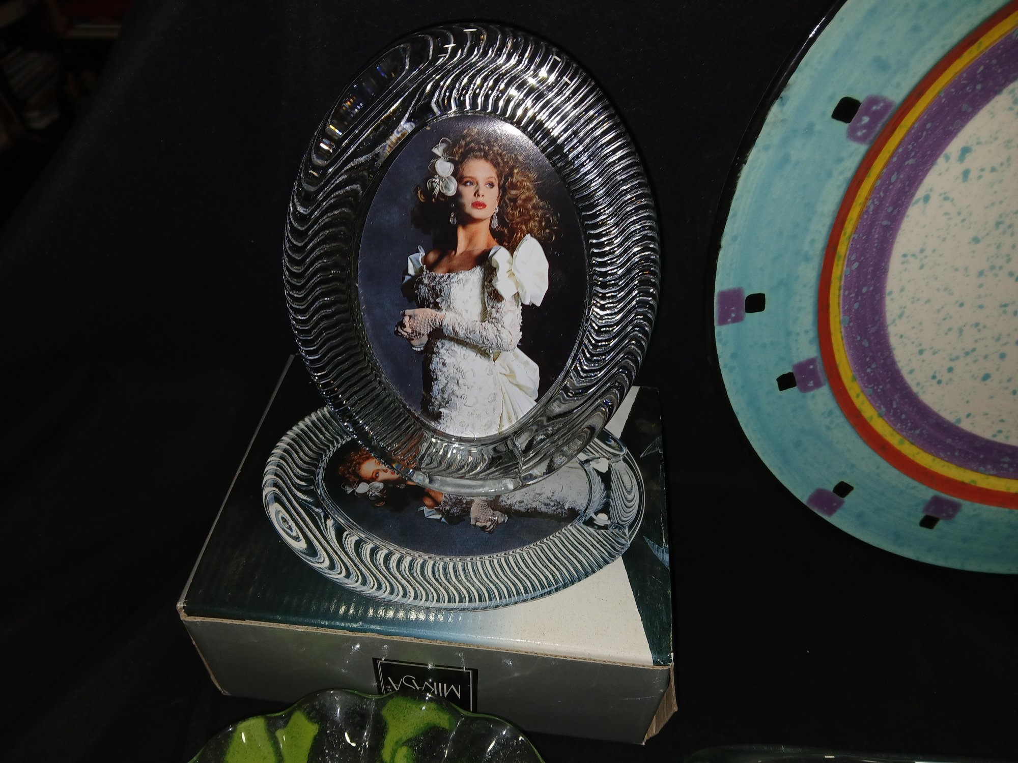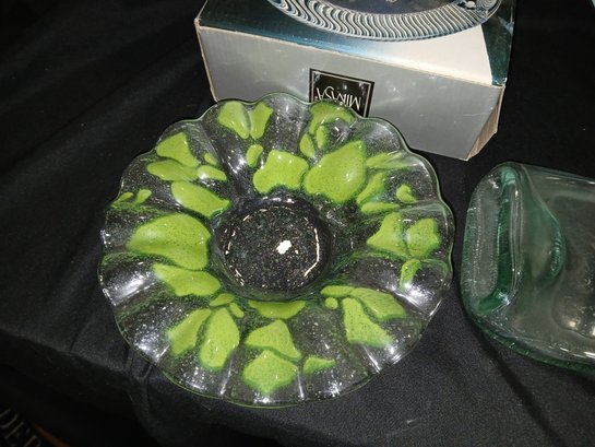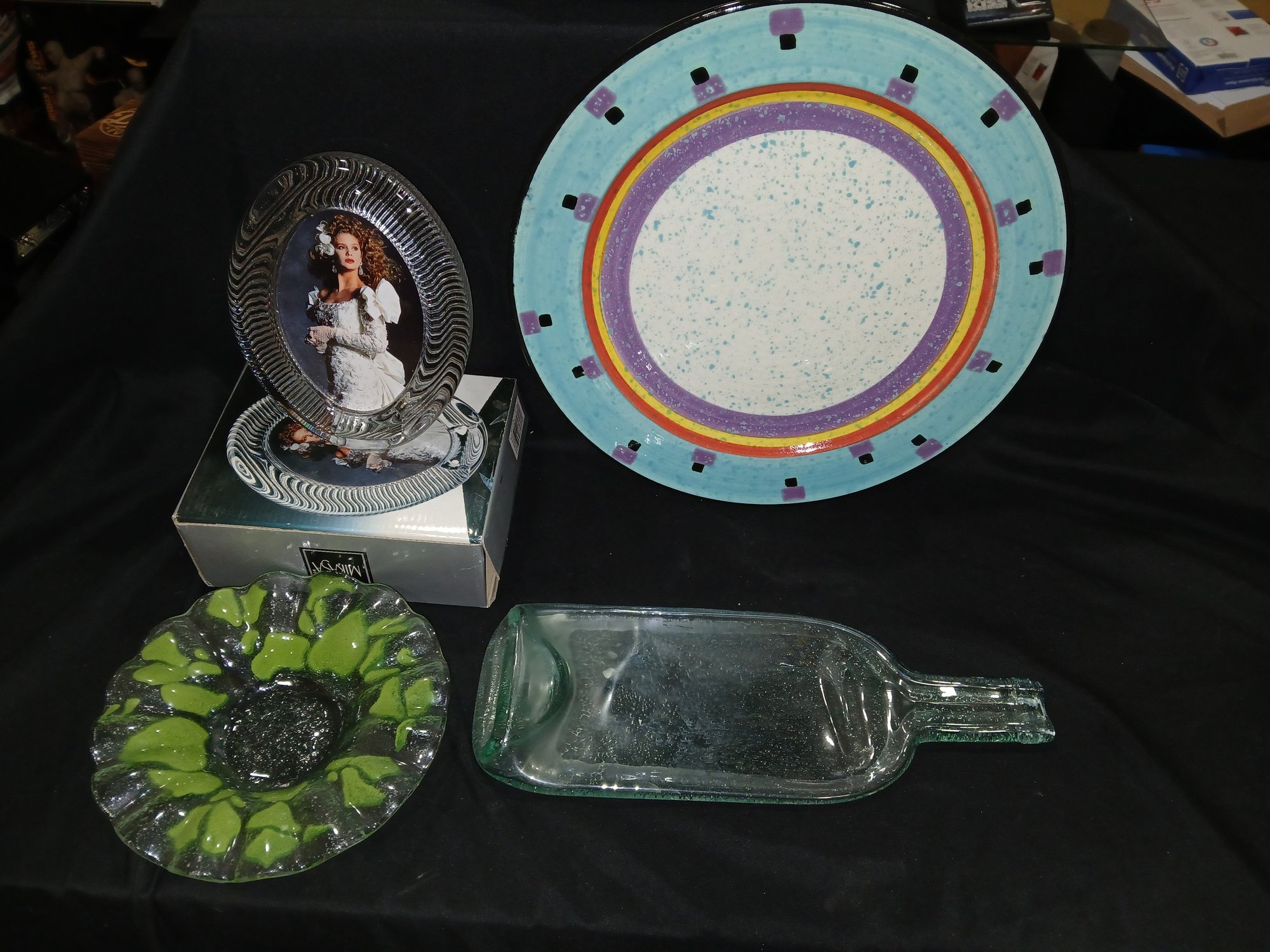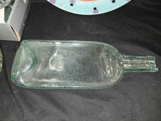 Decorative Glassware Lot: Bowl, Frame, plate, Flattened Bottle
