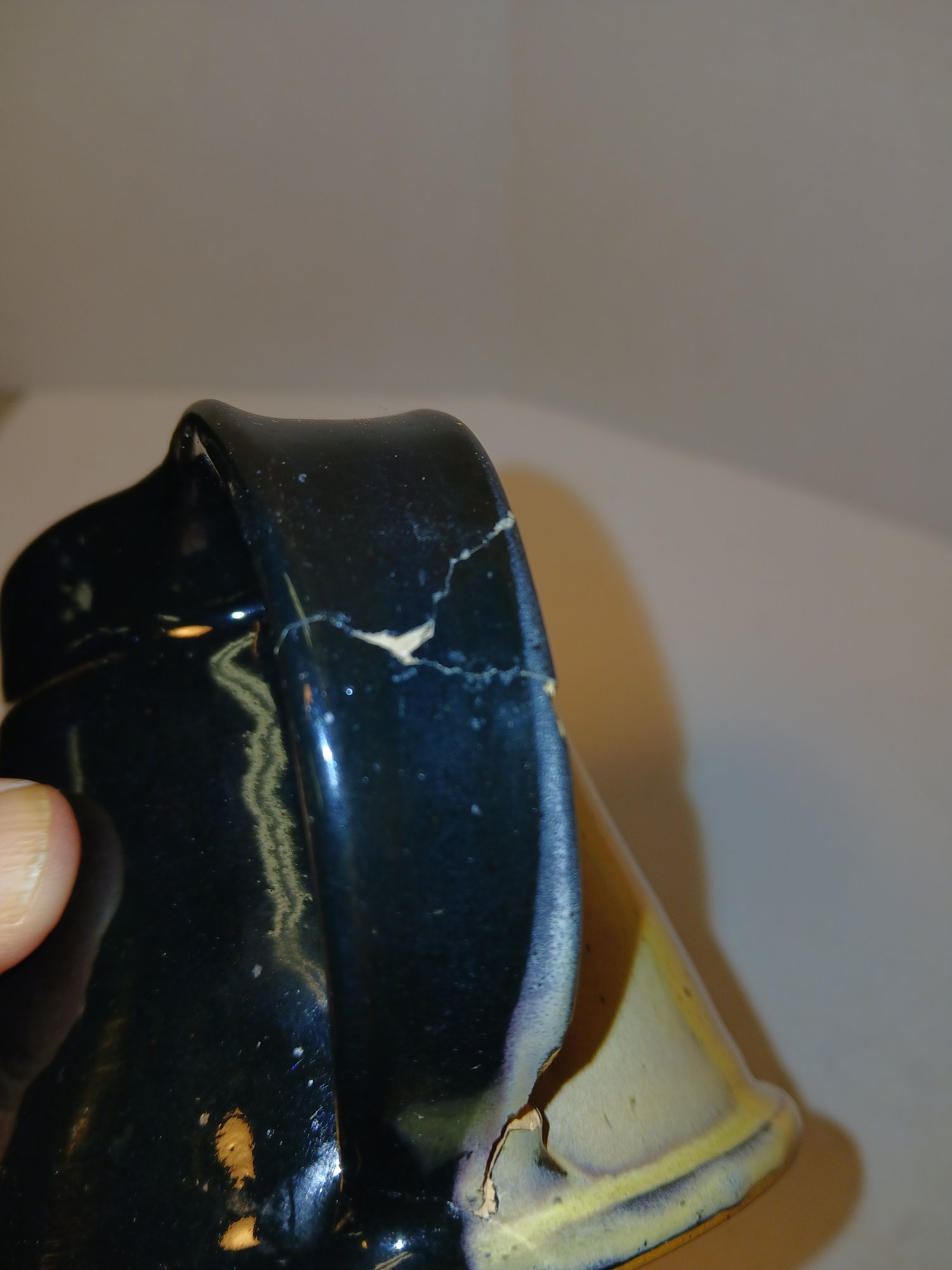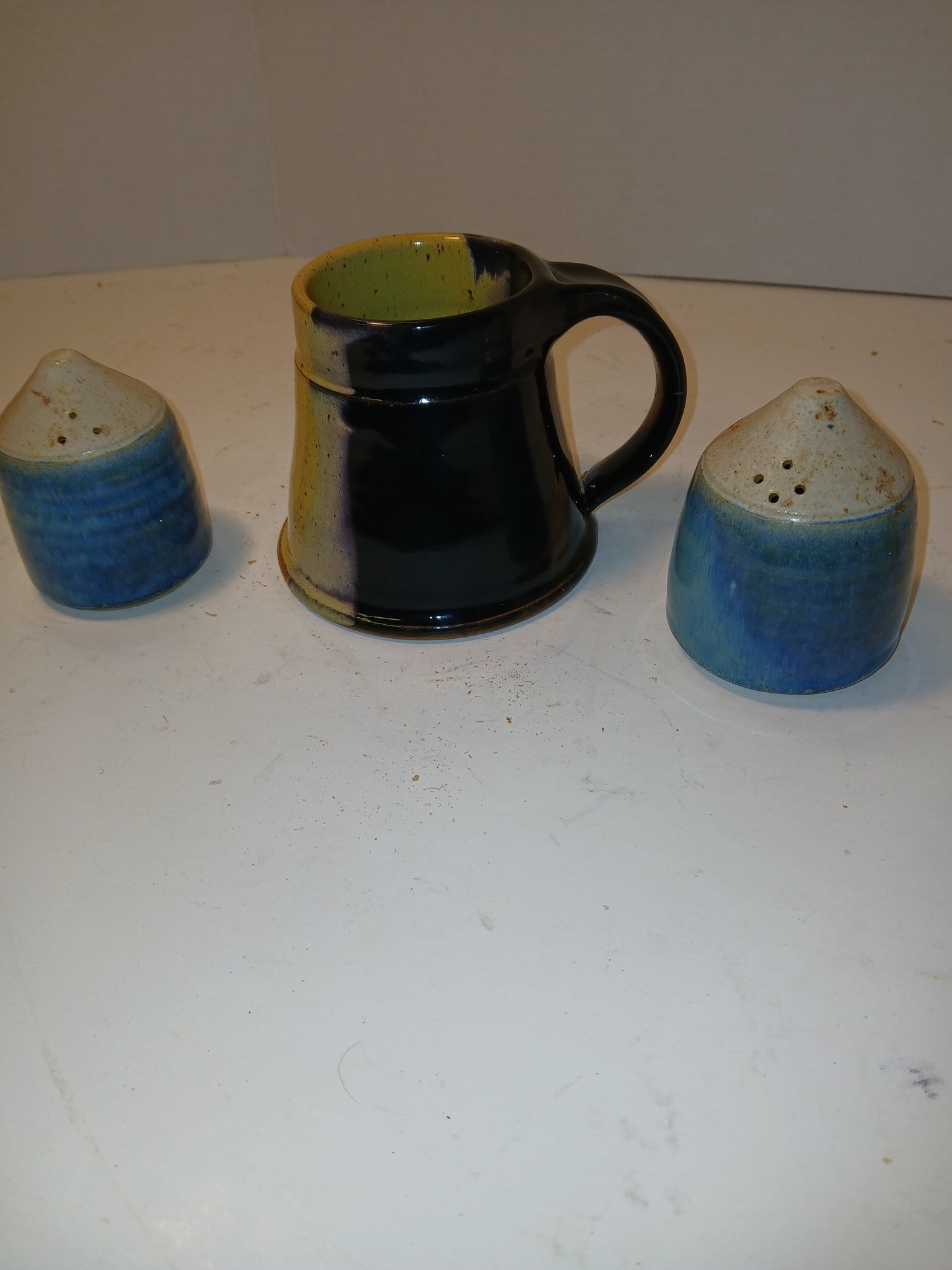 lot of handmade ceramic salt and pepper shakers, cool bicolor mug, crack in handle, put a plant in it, see pic