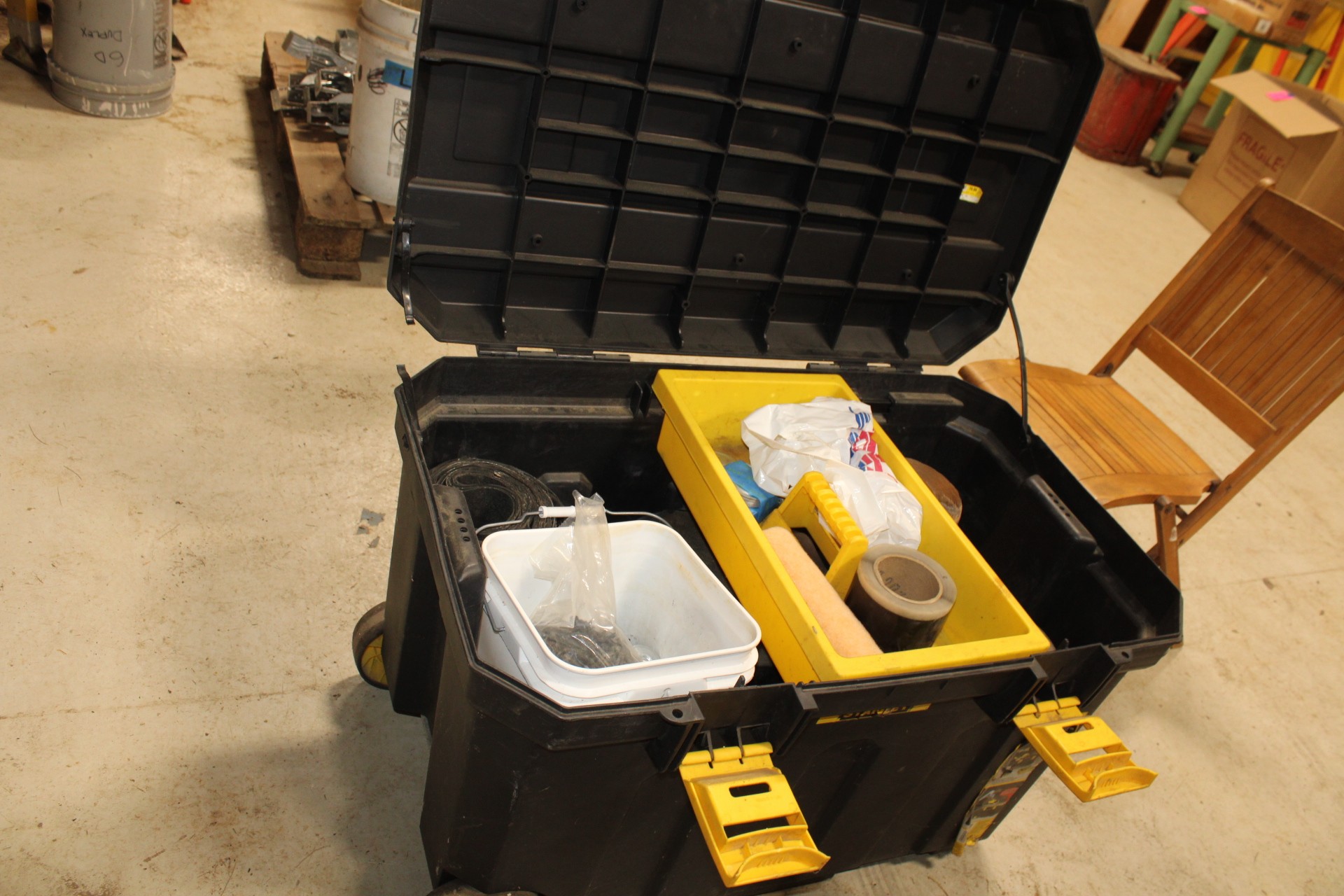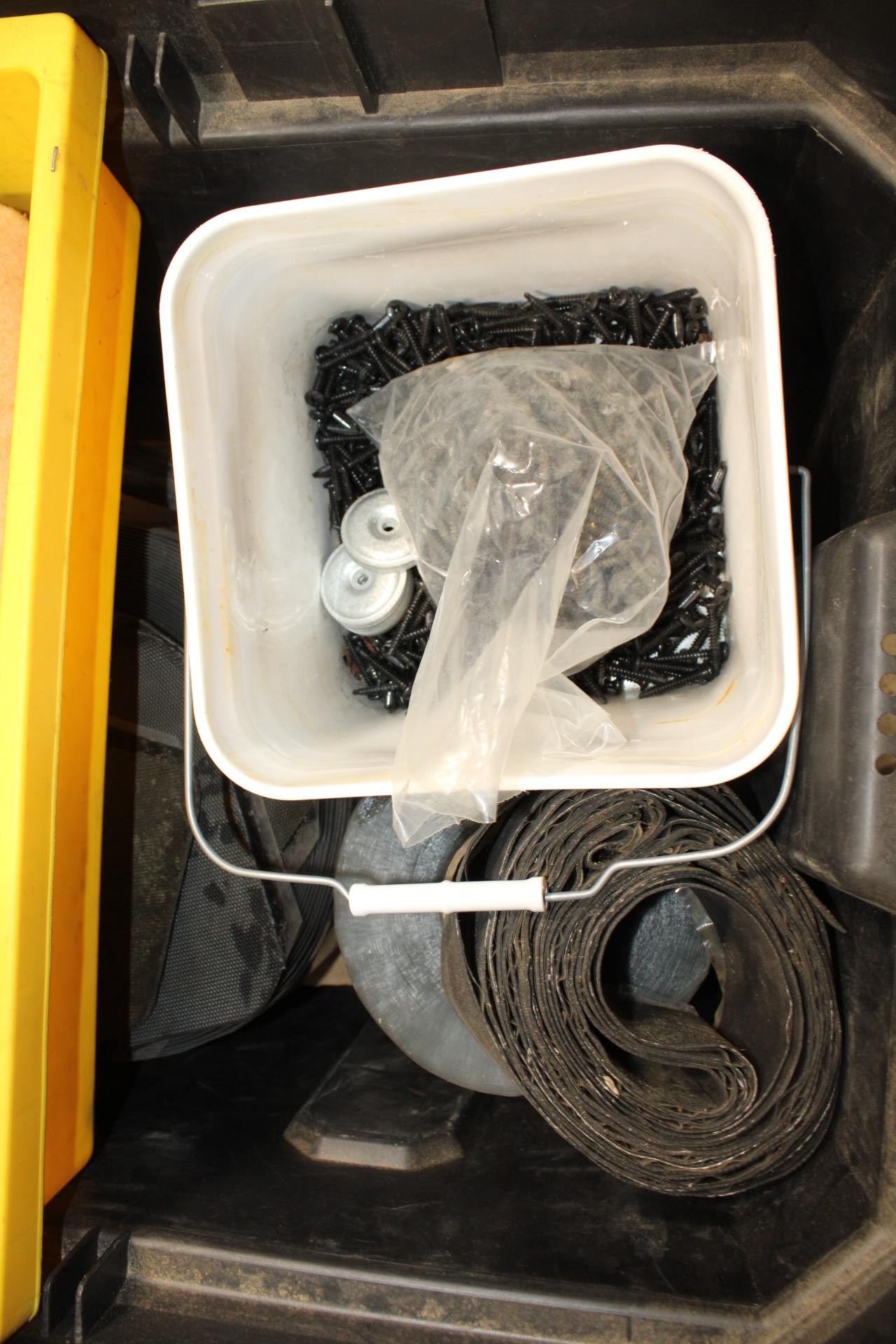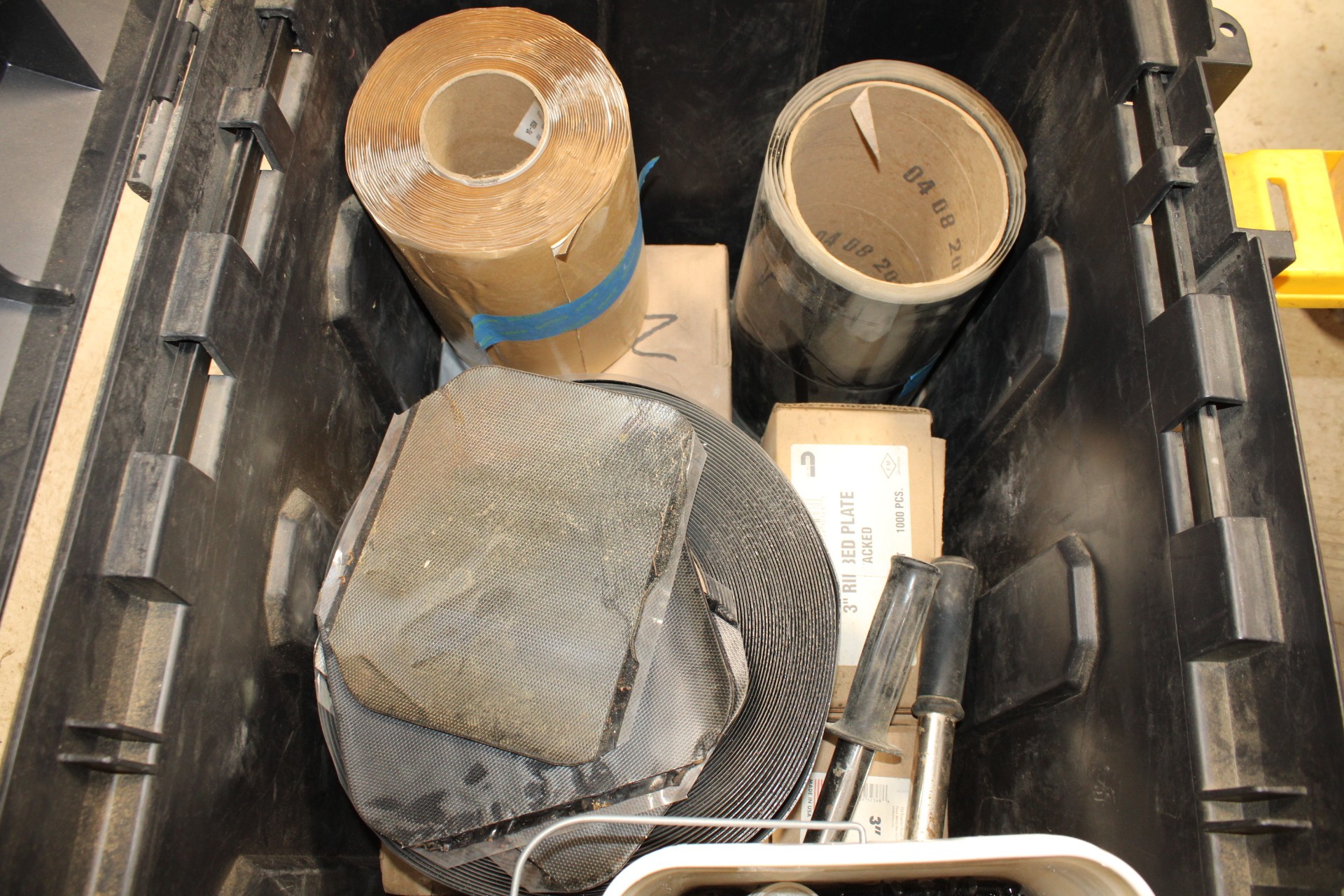 large rolling plastic gang box full of rubber water proofing tape sealer, misc sizes roofing