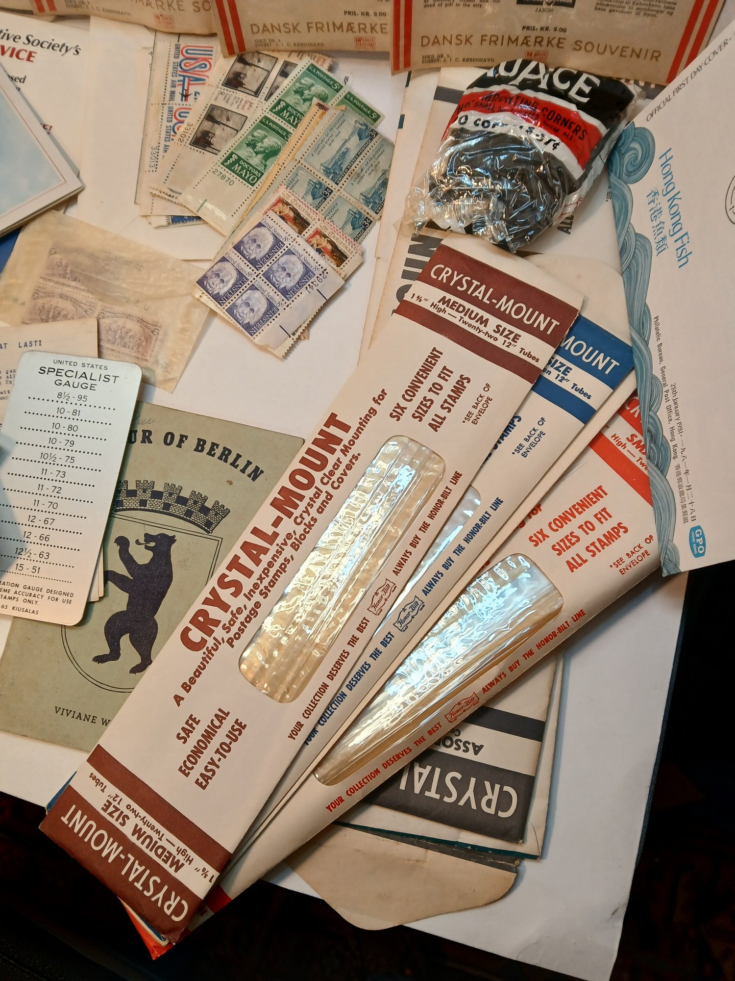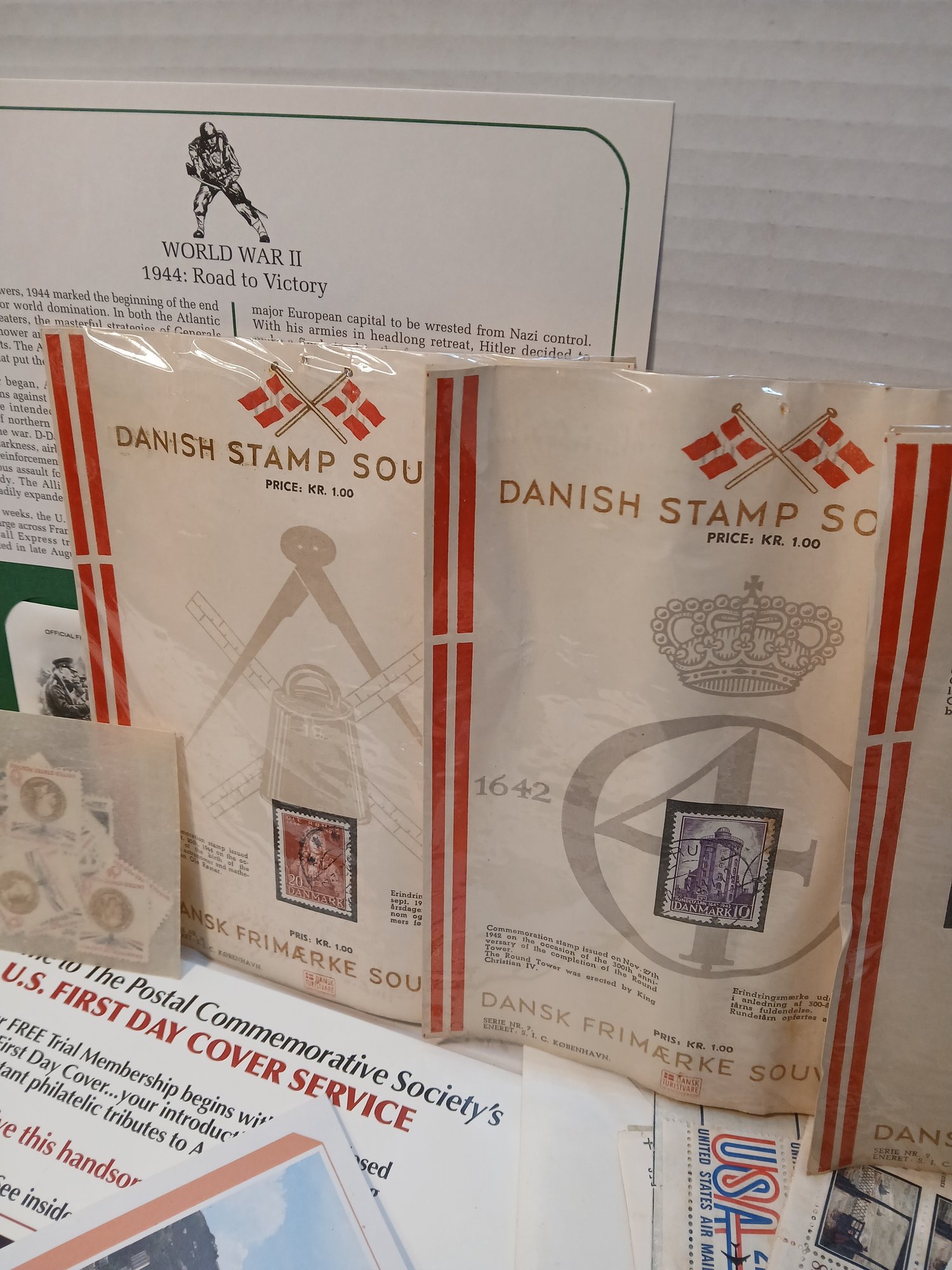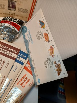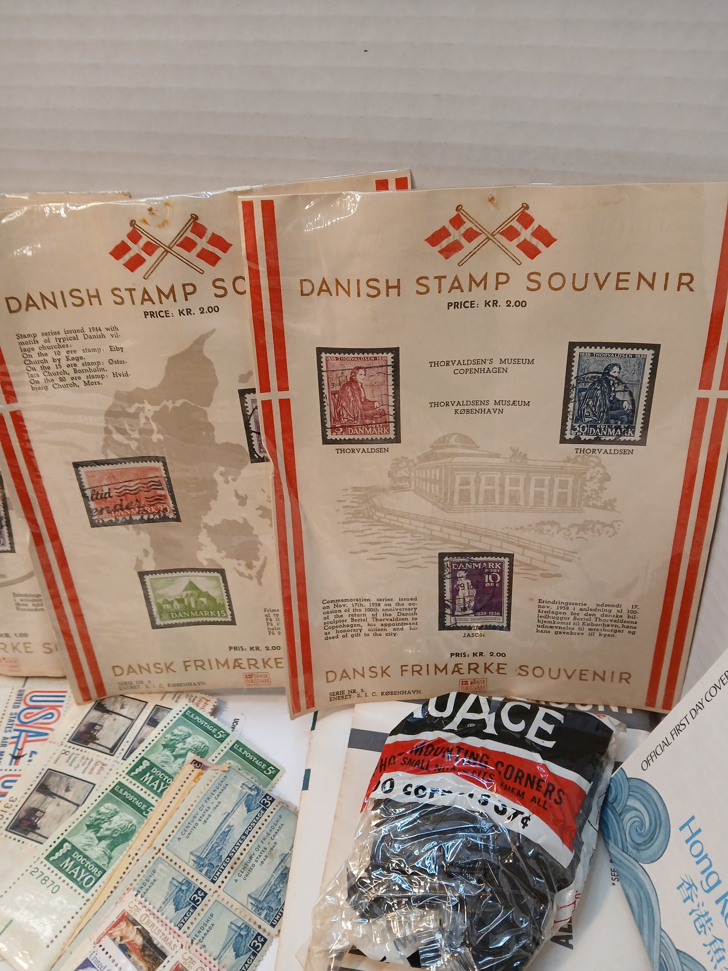 lot of first day issues, unused, various stamps, loose, assorted crystal mounts, corners, danish stamps, stamp gage