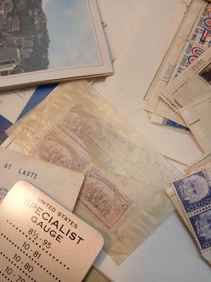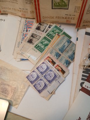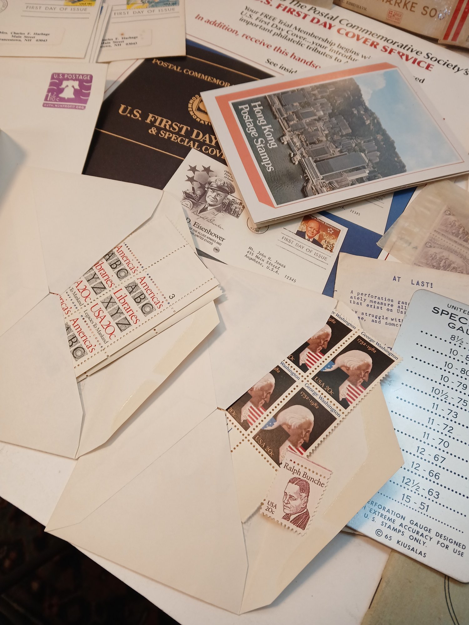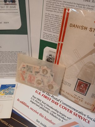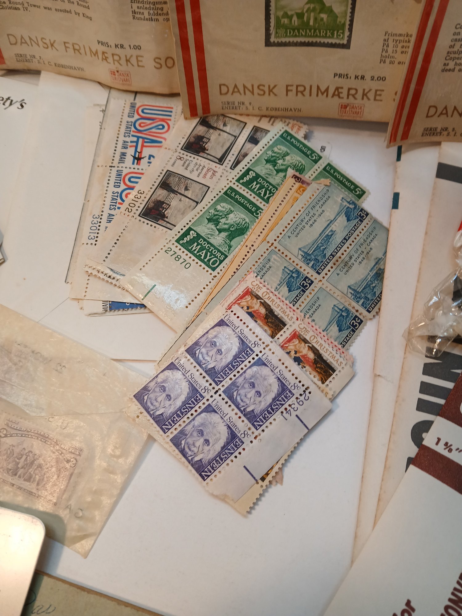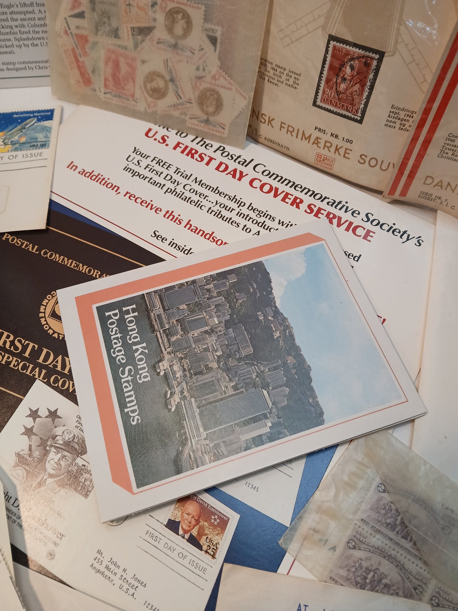 lot of first day issues, unused, various stamps, loose, assorted crystal mounts, corners, danish stamps, stamp gage