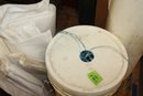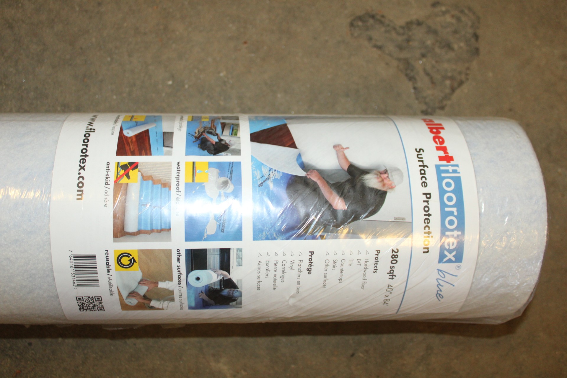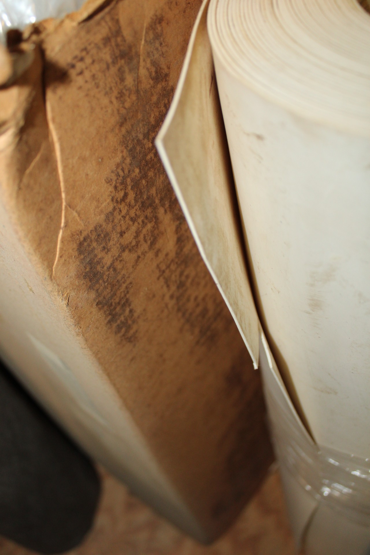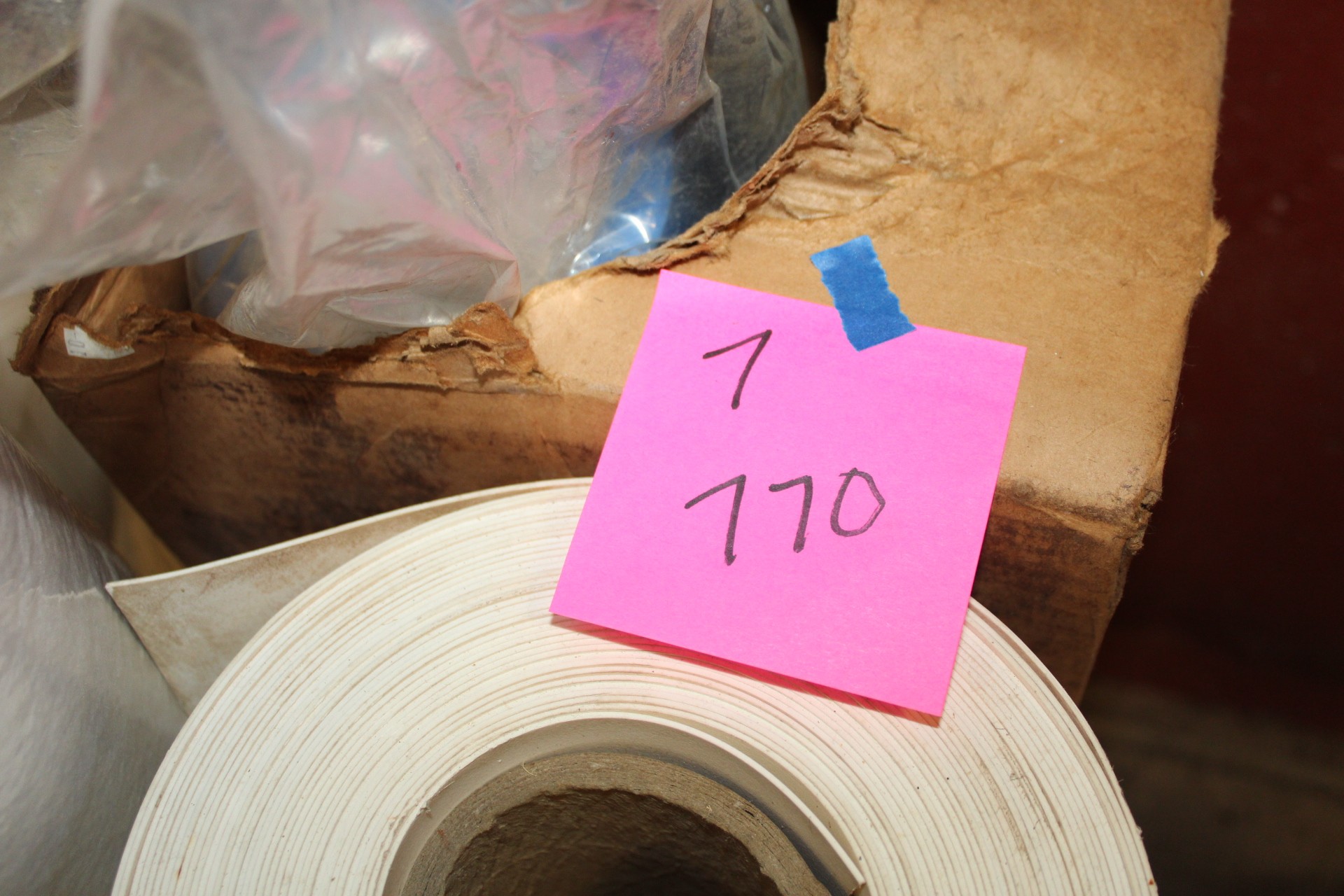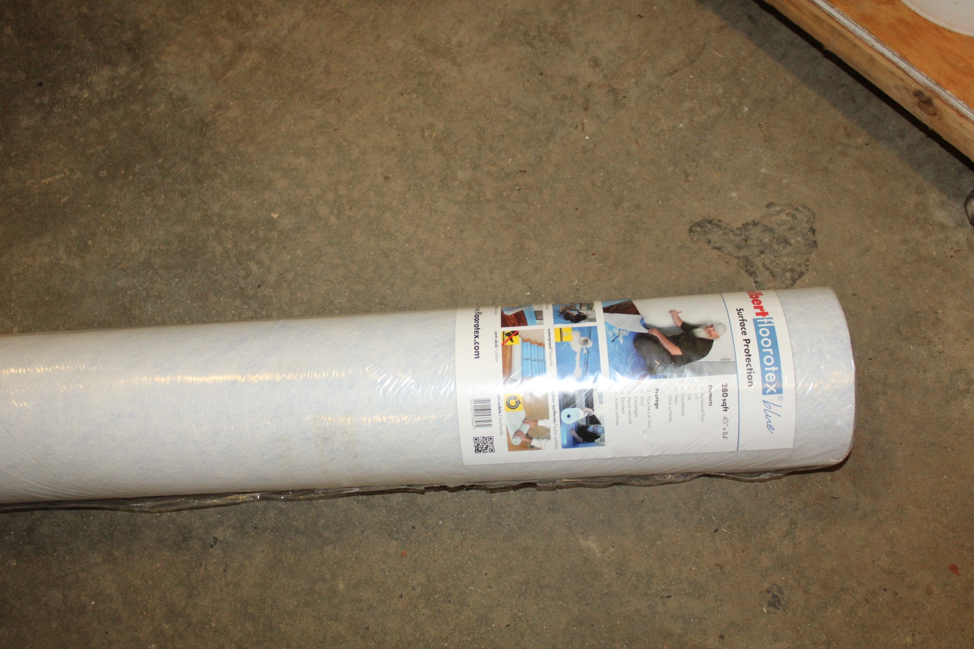 lot of rolled floor batting, vinyl, white flags, and bucket of string