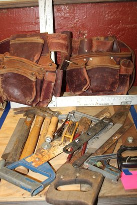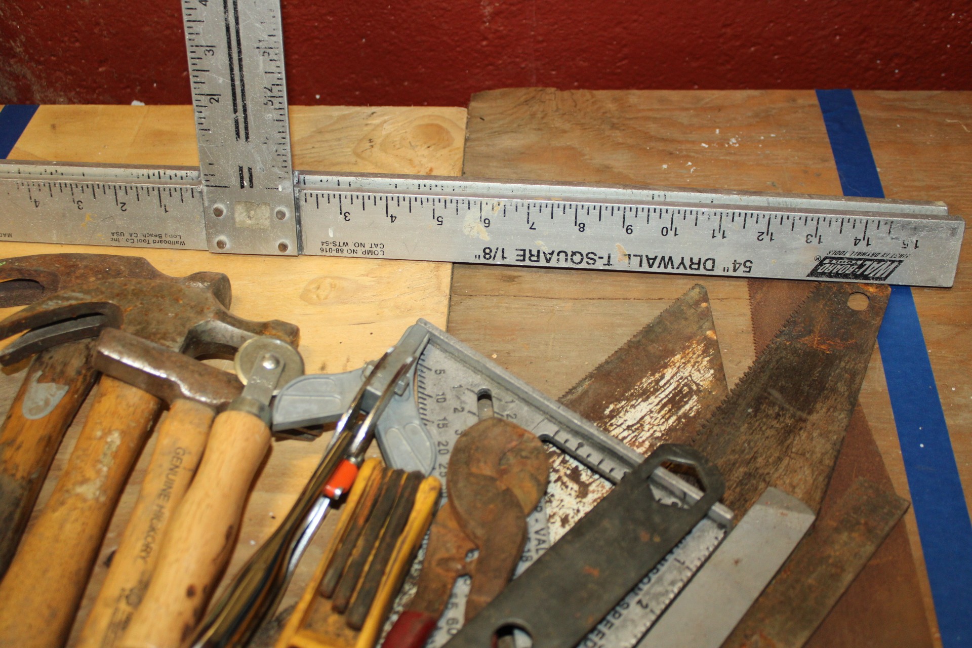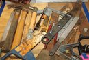misc lot of hand tools saws, hammers, tsquare, tool bag
