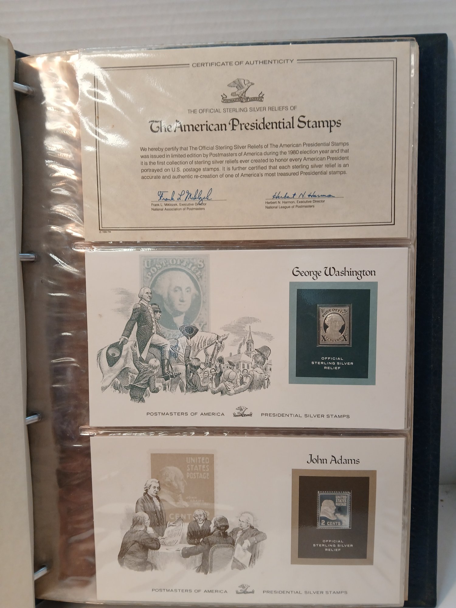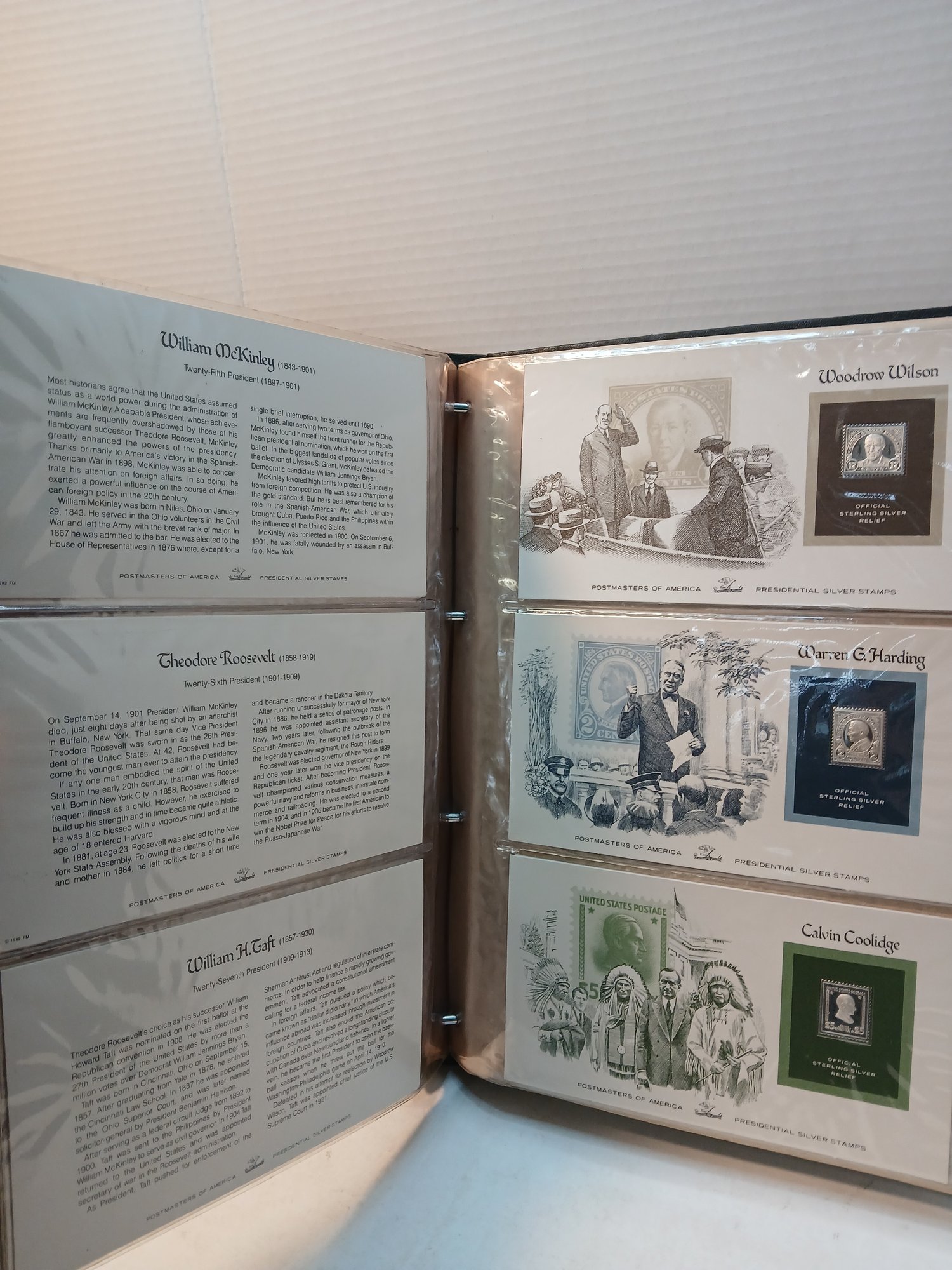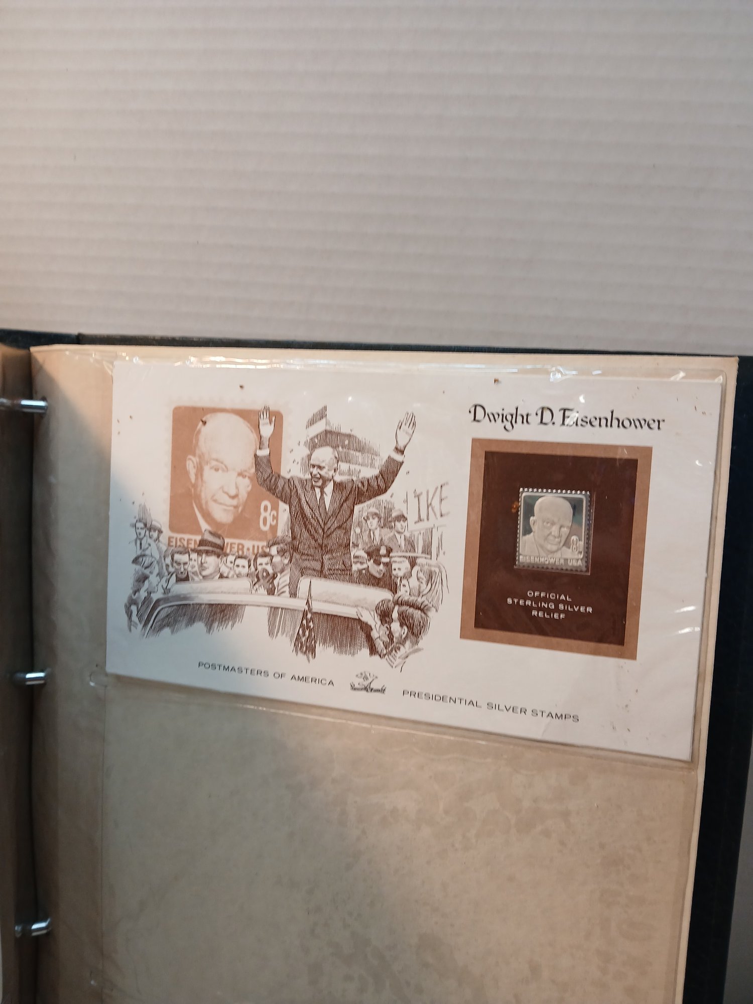 postmasters of america binder, sterling silver relief presidential stamps, washington to eisenhower