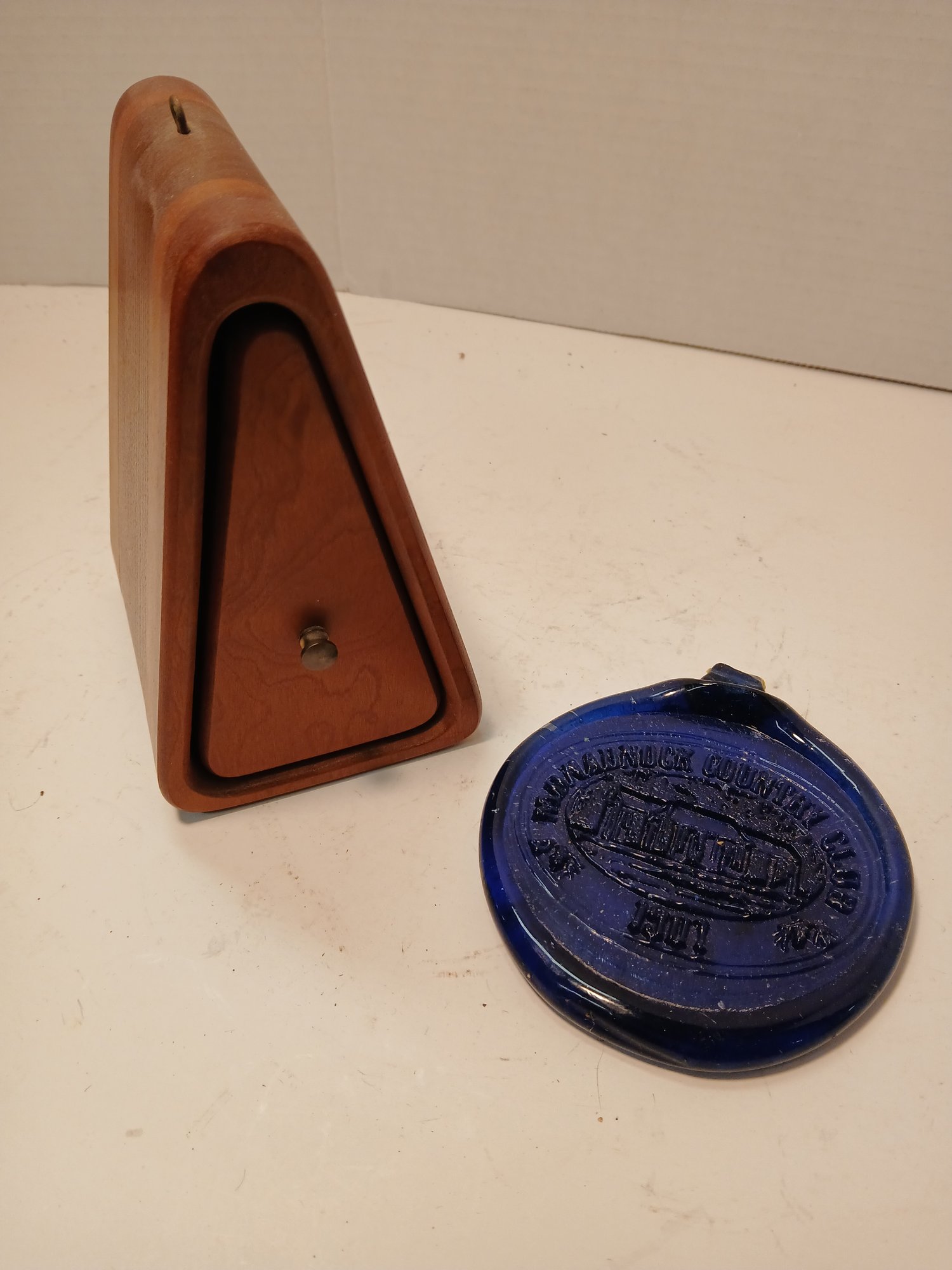 small wooden, triangular hidden trinket box, signed, cobalt glass suncatcher/boiling water, see pics