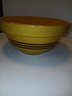 two medium sized mixing bowls, one roseville, one yellow ware, both striped, see pics