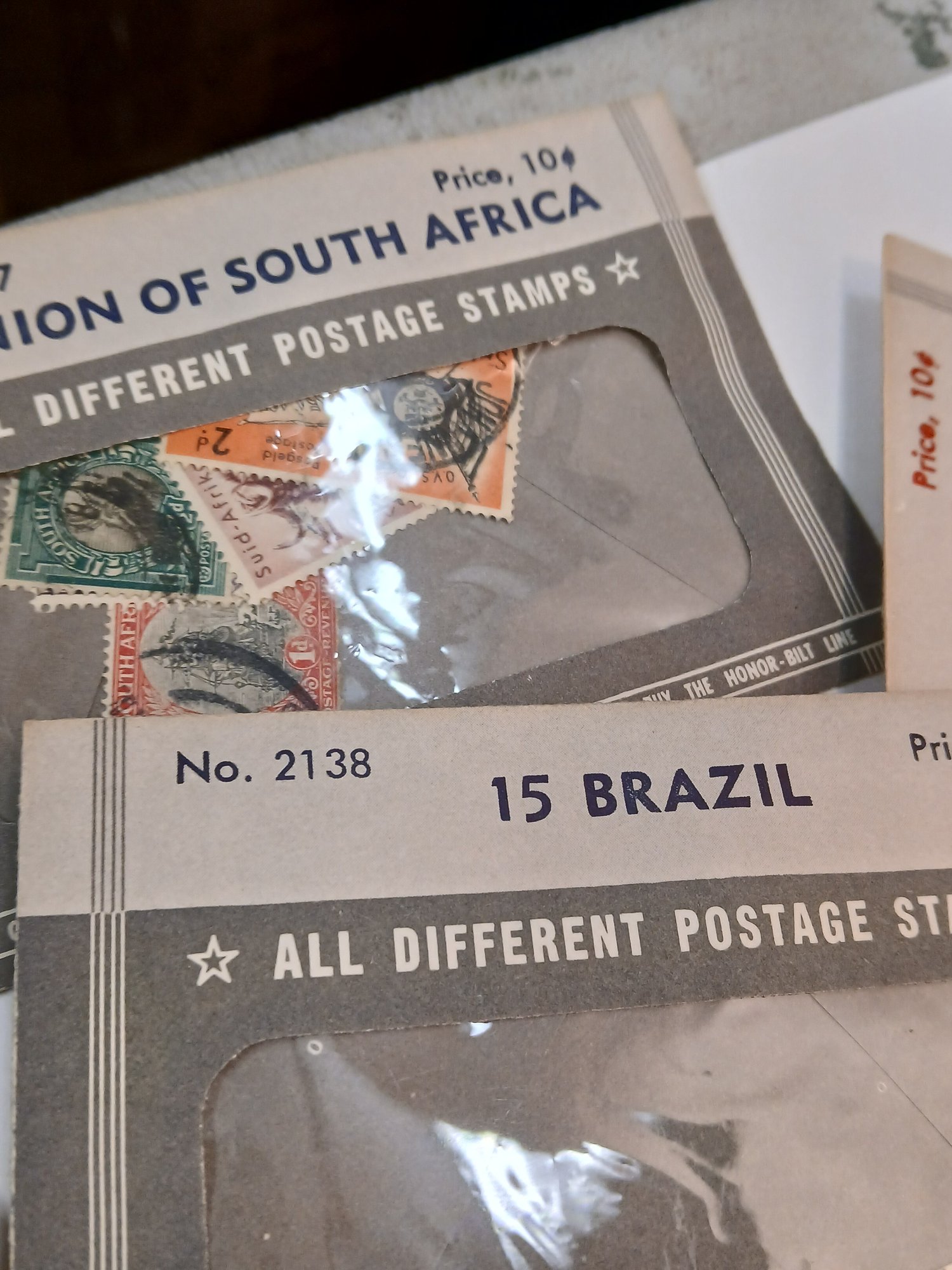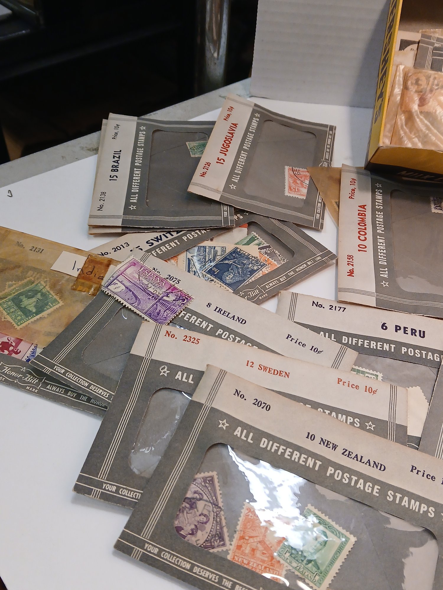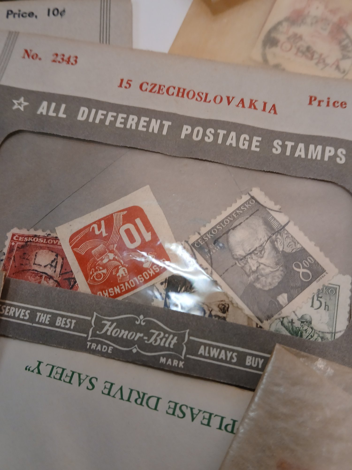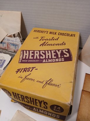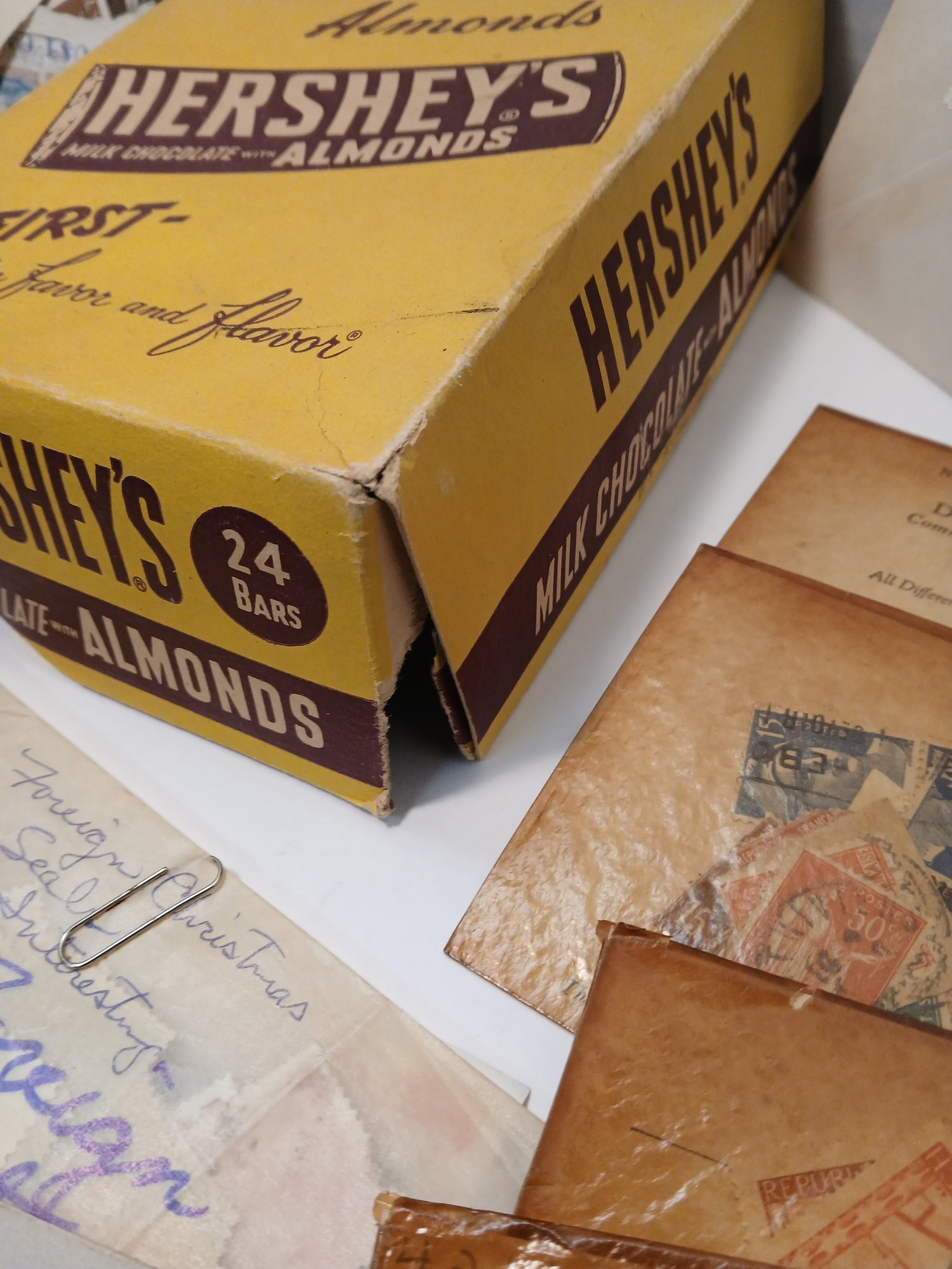 vintage hershey's milk chocolate with almonds box, filled with stamps, cute bit of ephemera