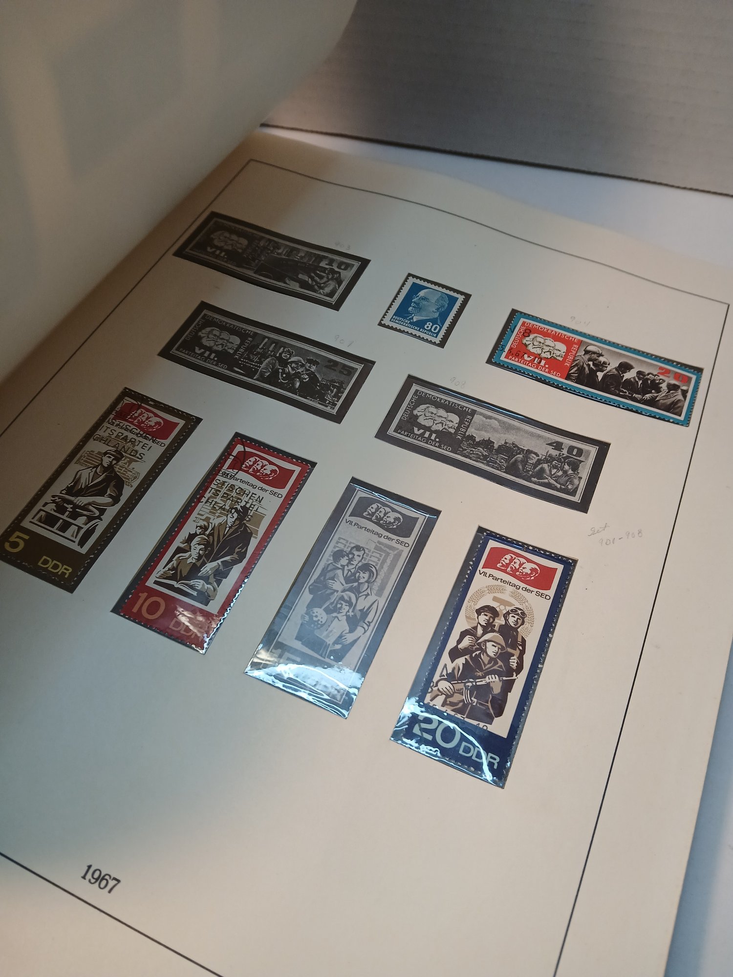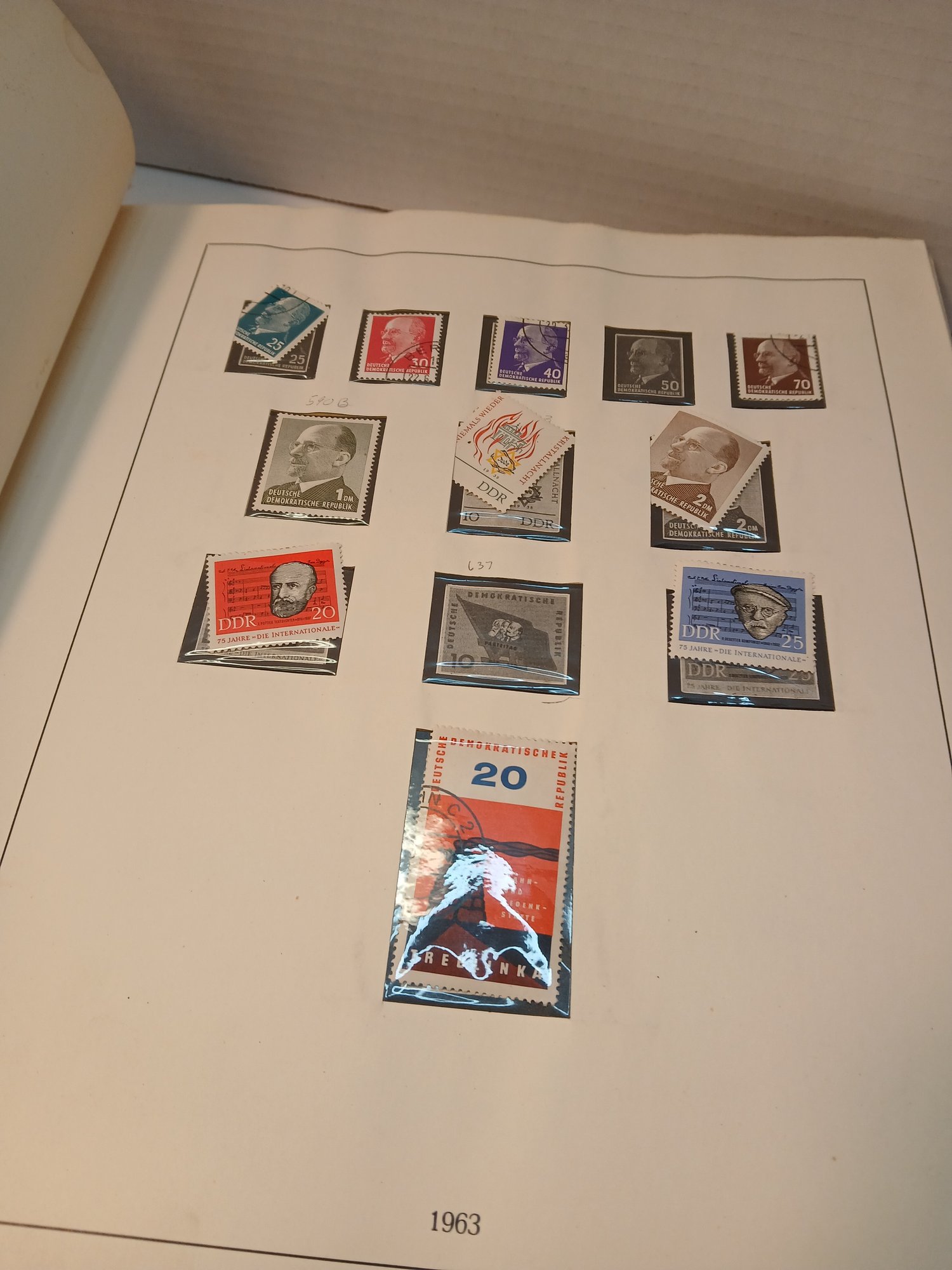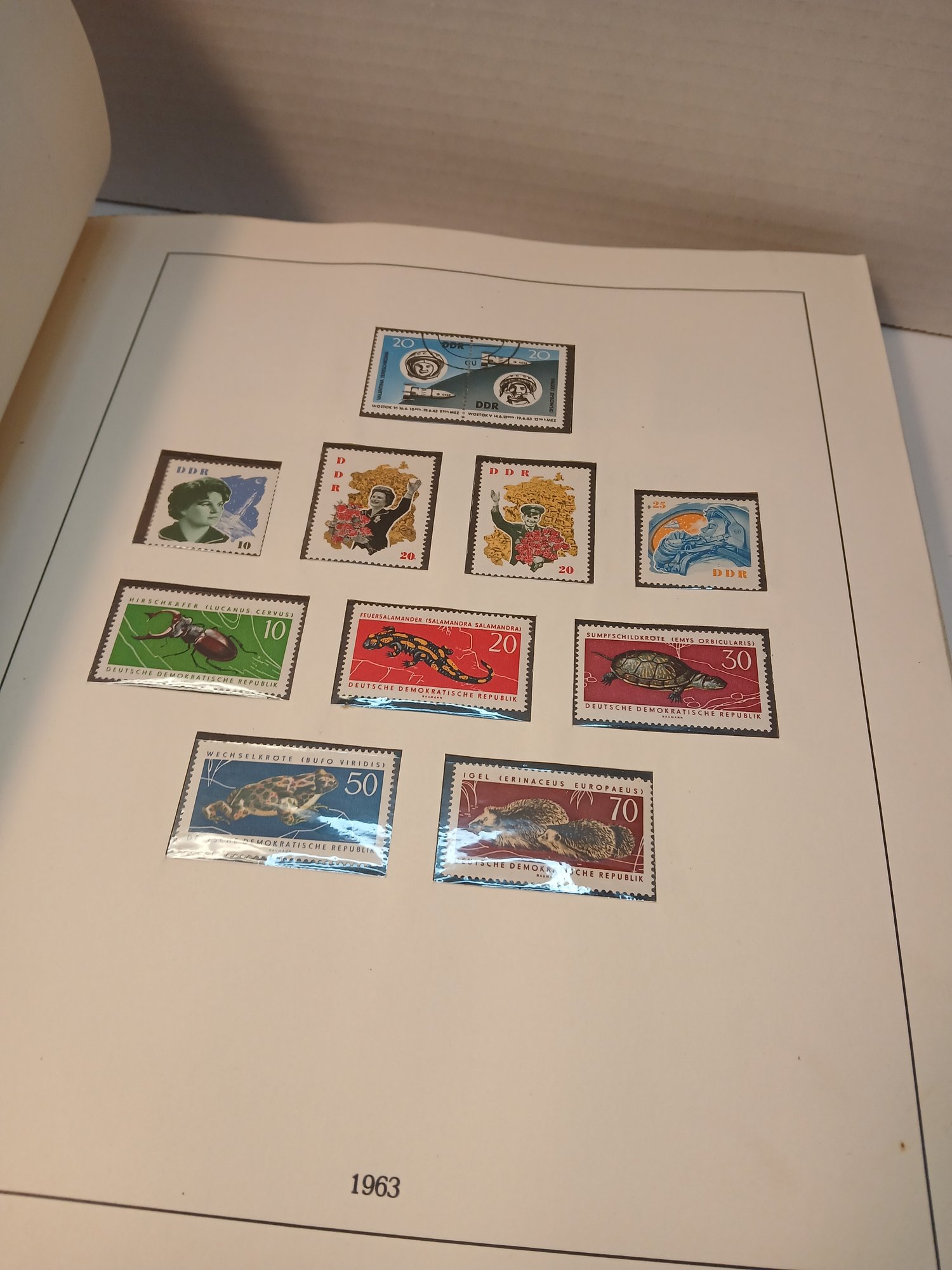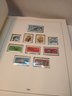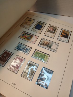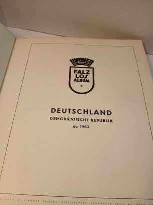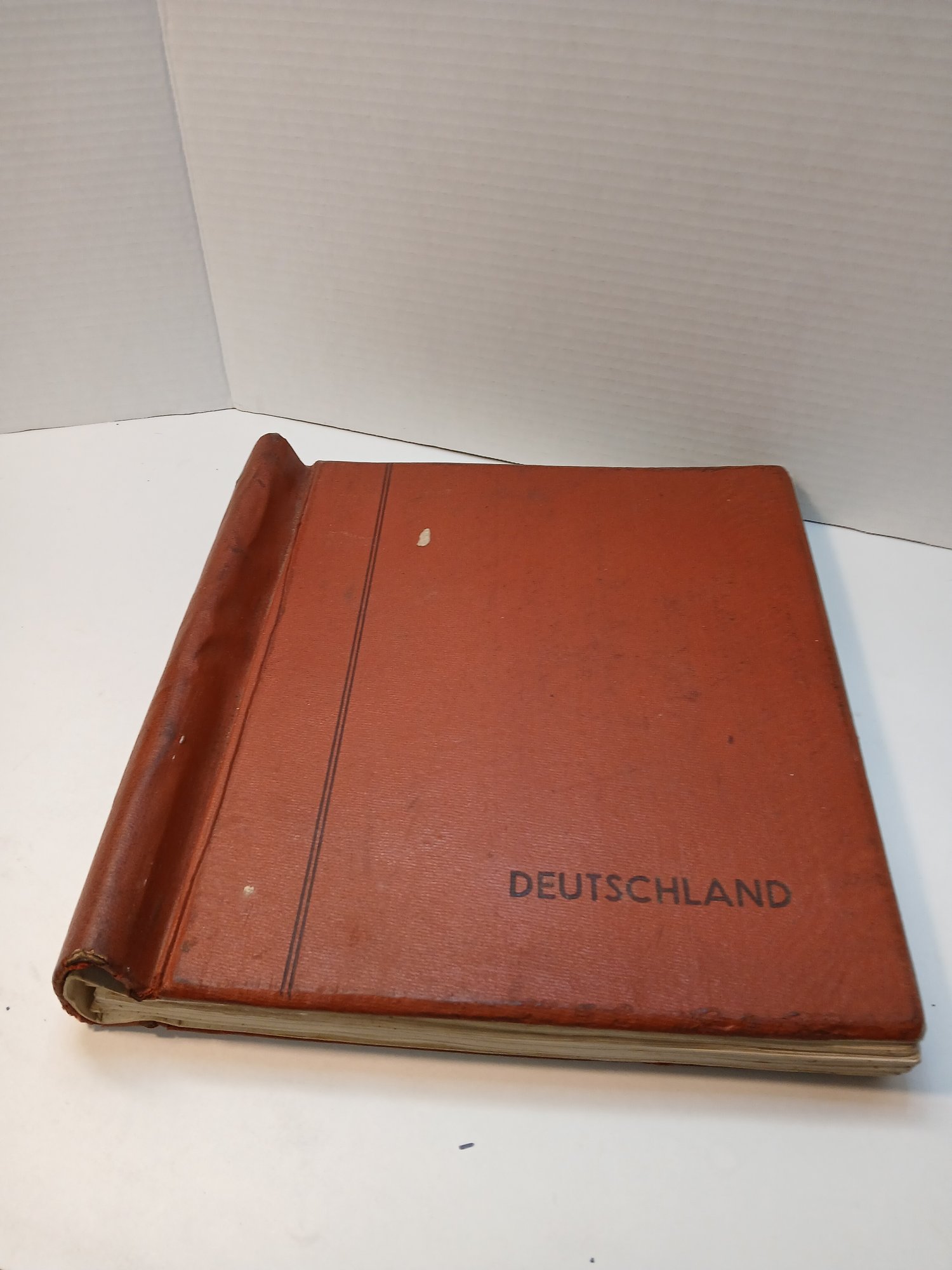 vintage red binder, 1960's german stamps, 60% full, approximately