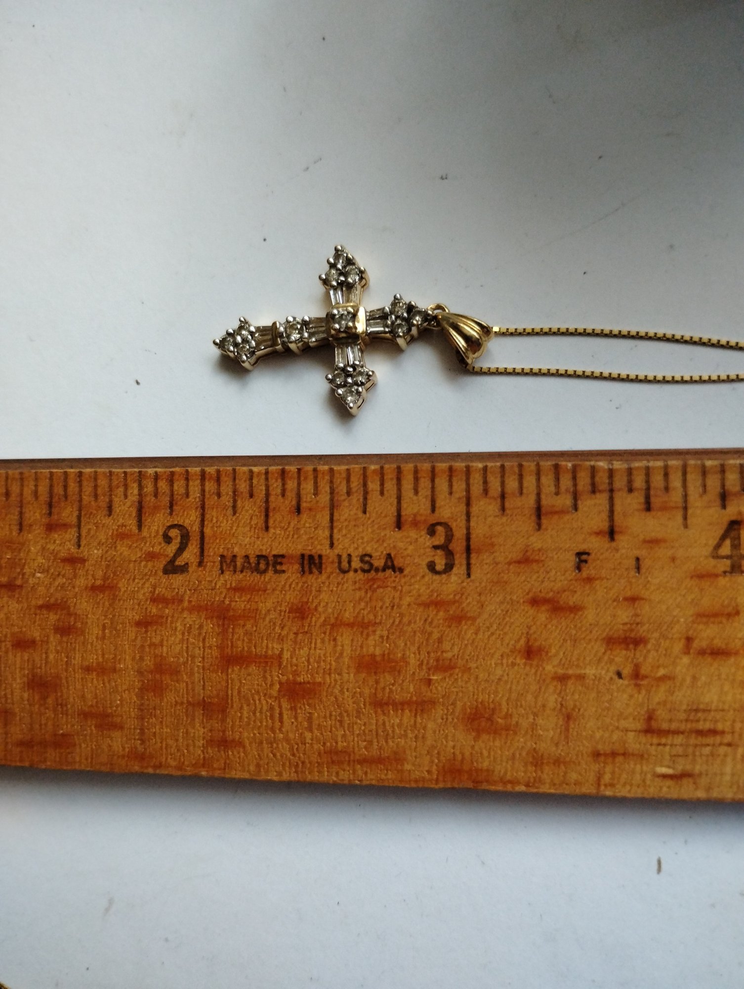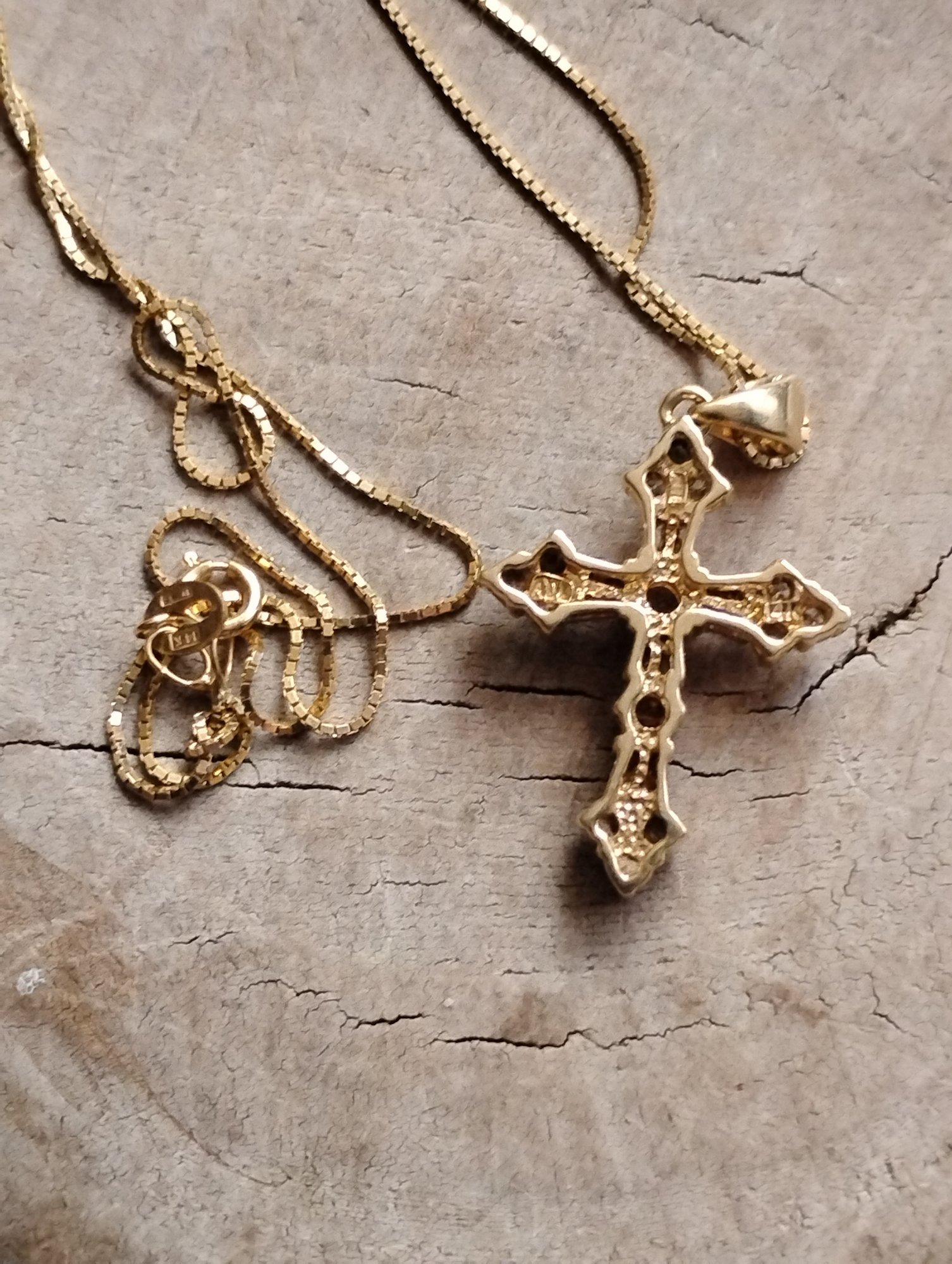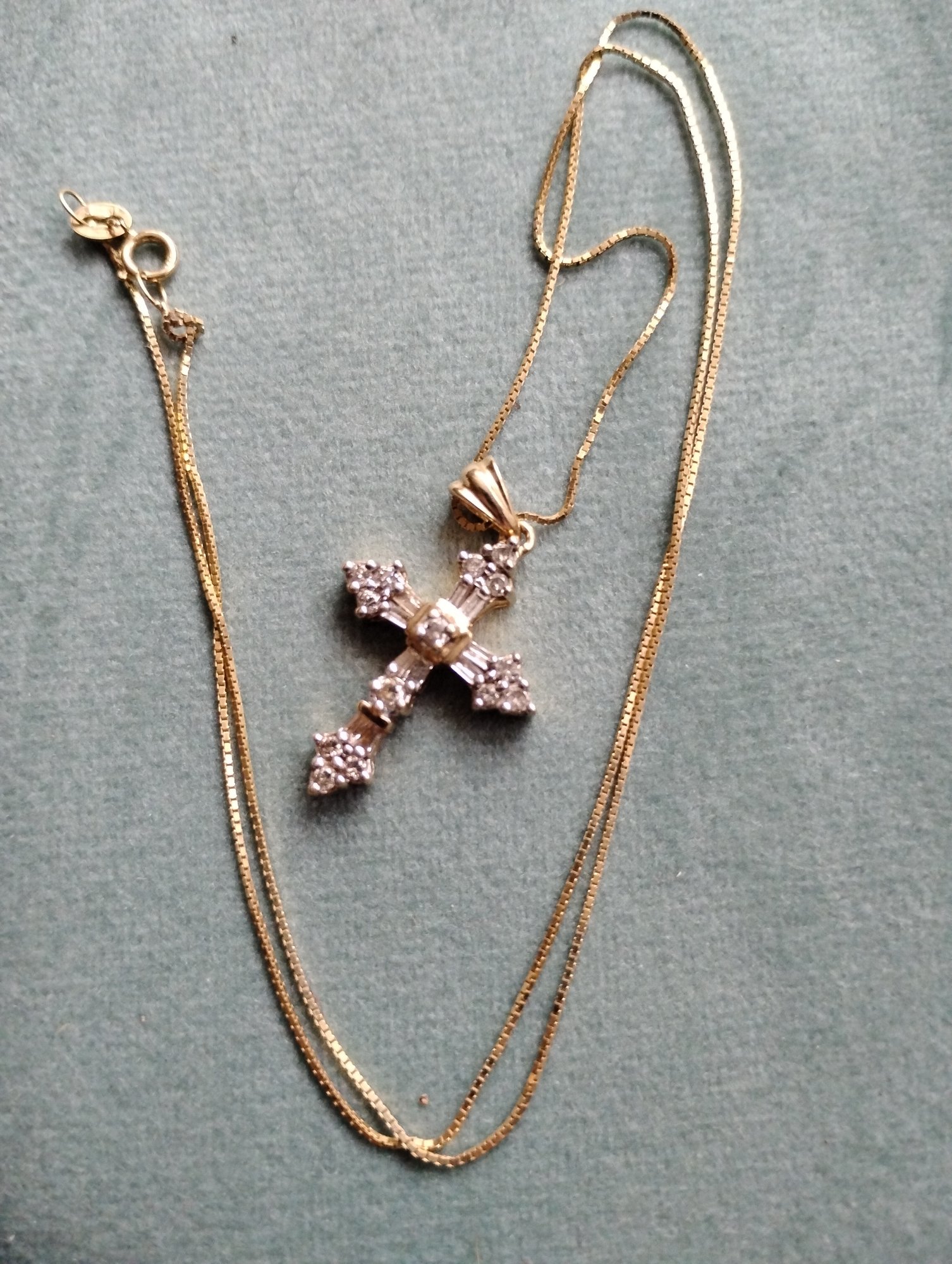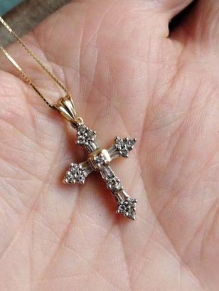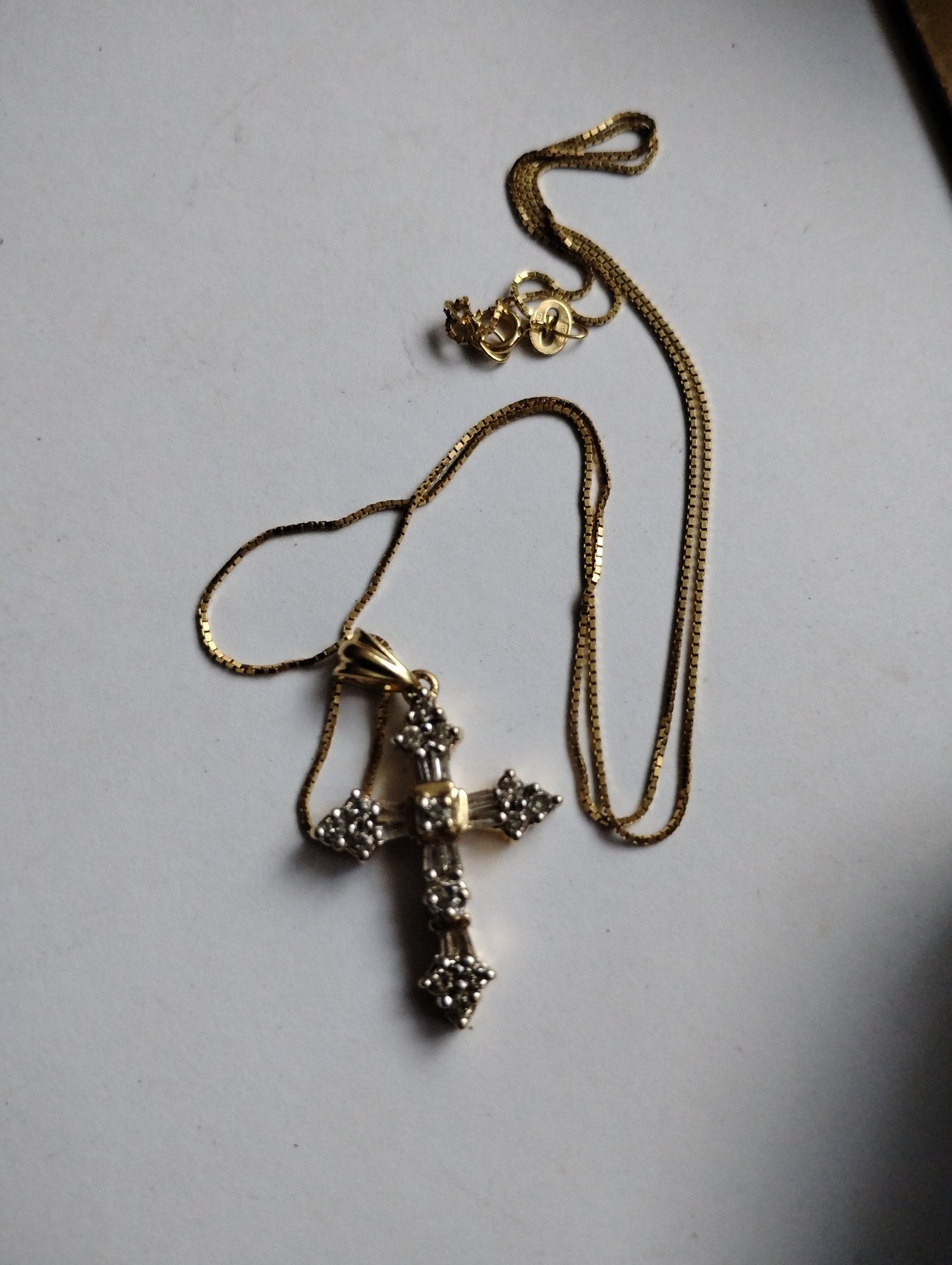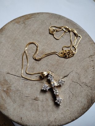 This is a 14k yellow gold box chain with a diamond cross pendant. Both the cross and chain are marked 14. The pendant has the makers initials ADL.