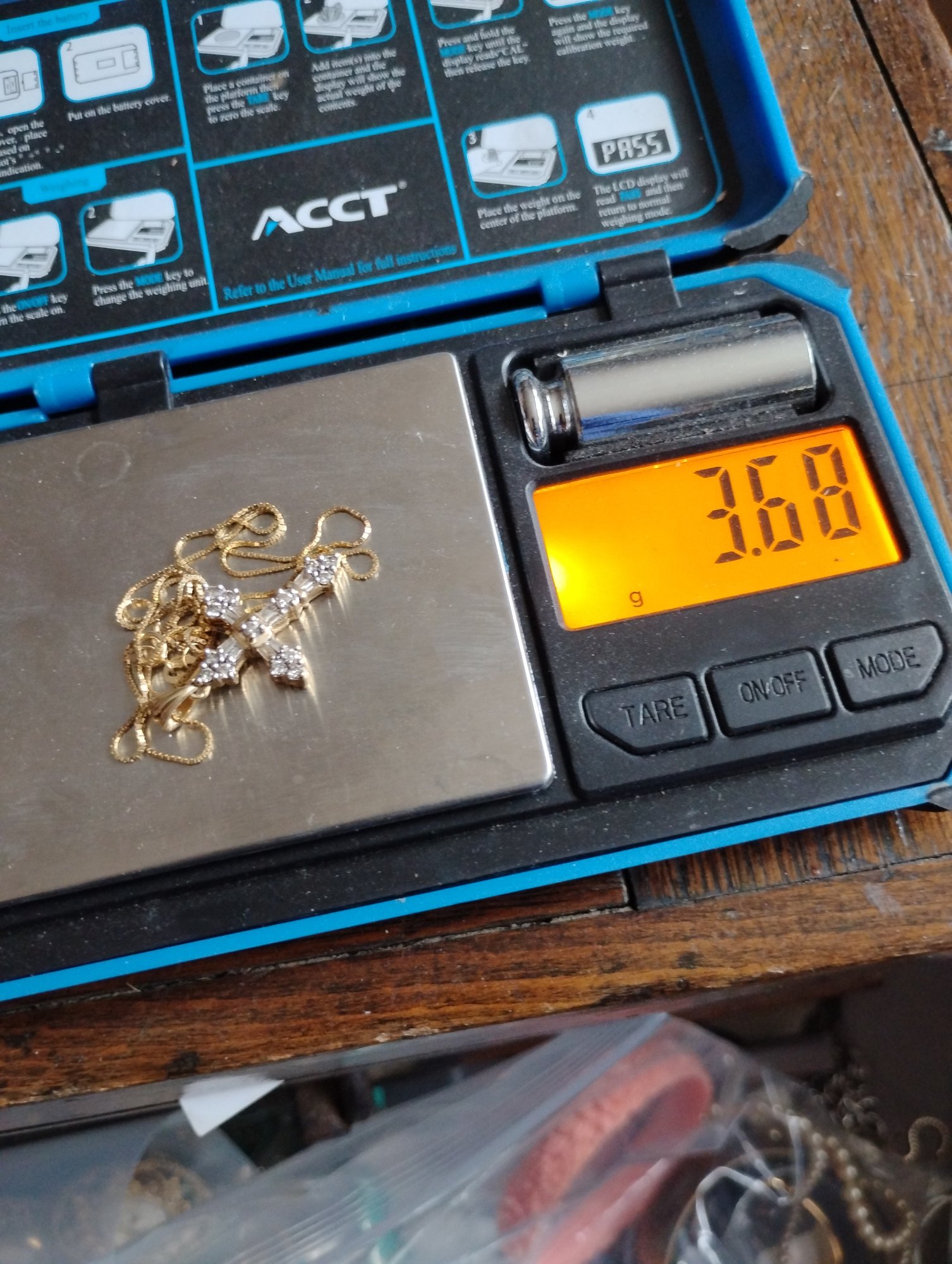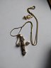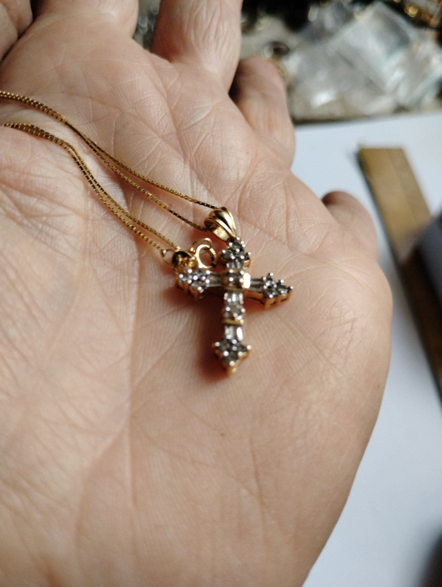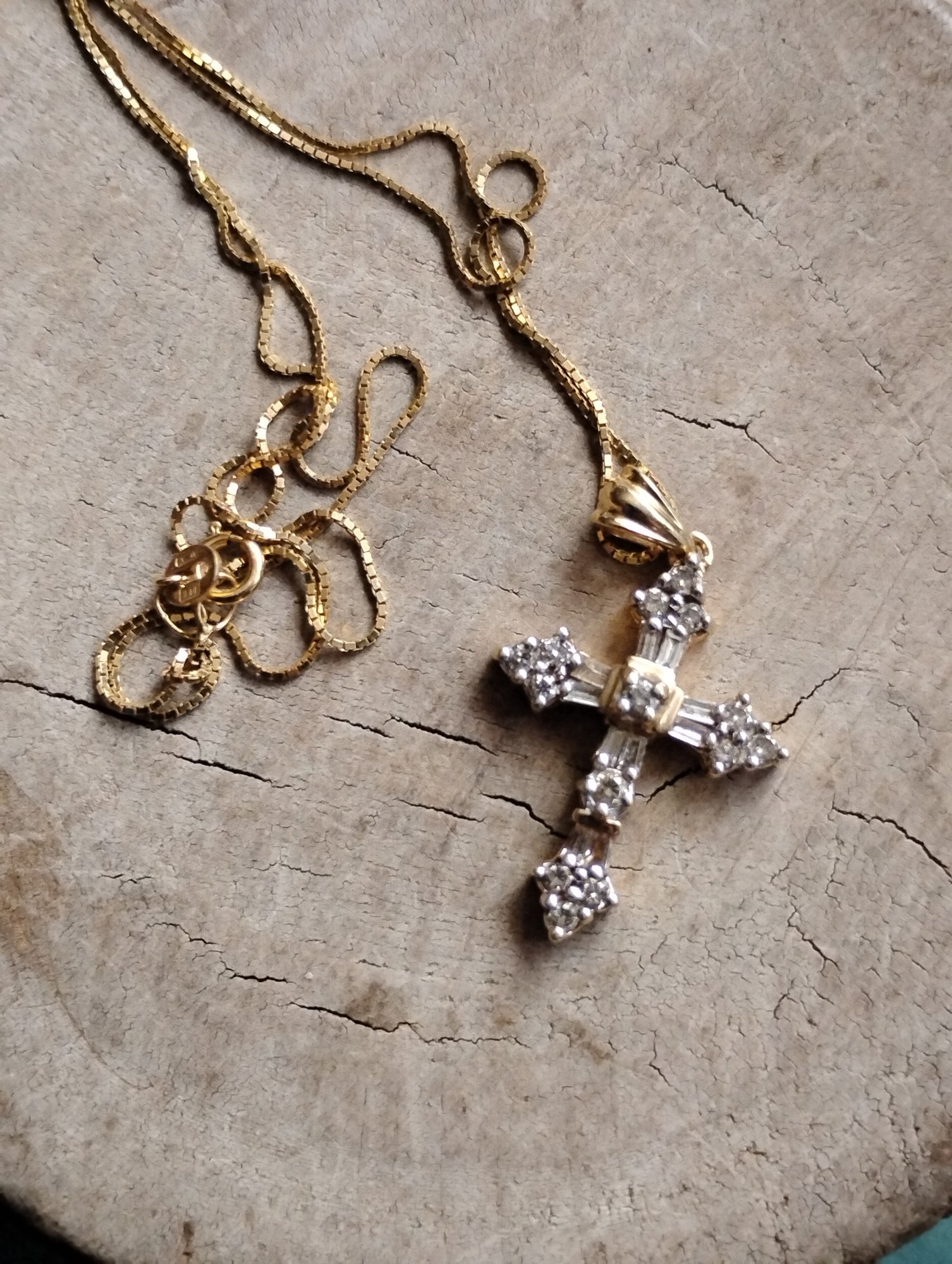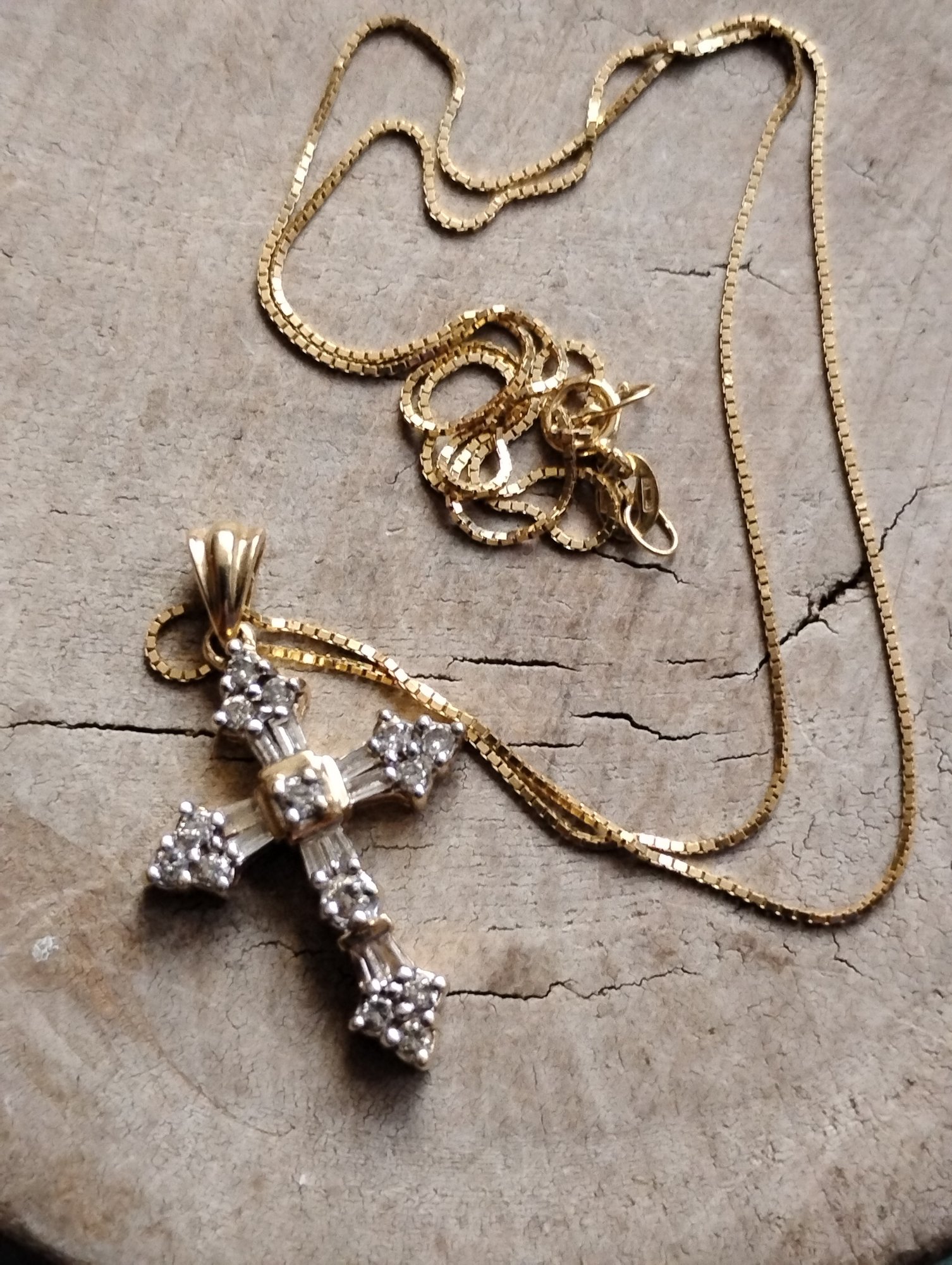 This is a 14k yellow gold box chain with a diamond cross pendant. Both the cross and chain are marked 14. The pendant has the makers initials ADL.