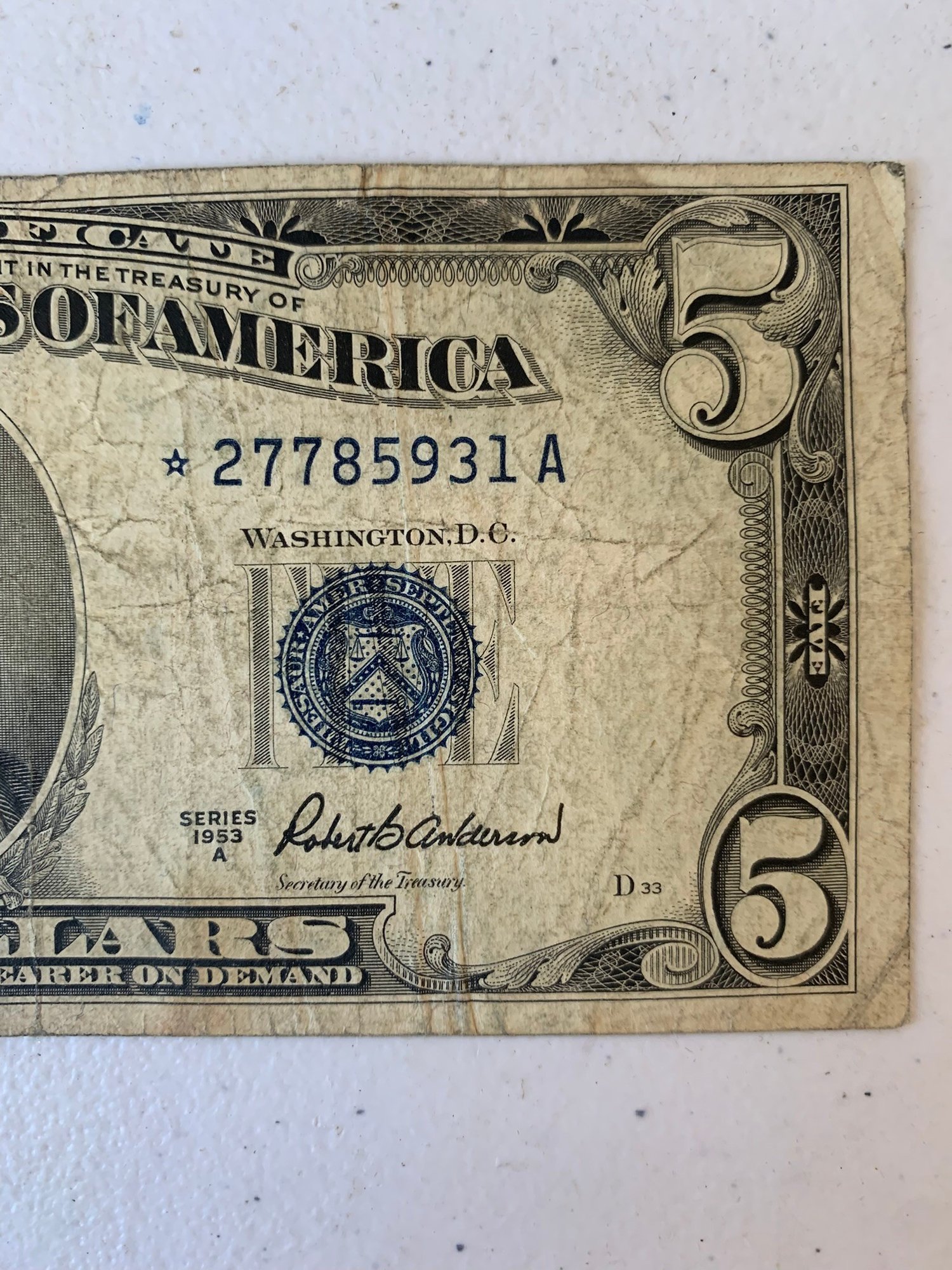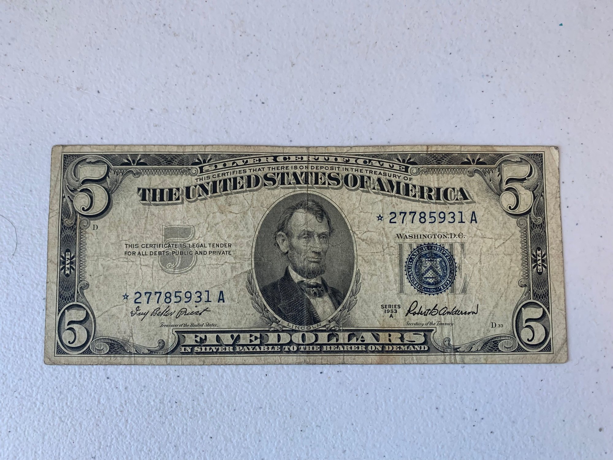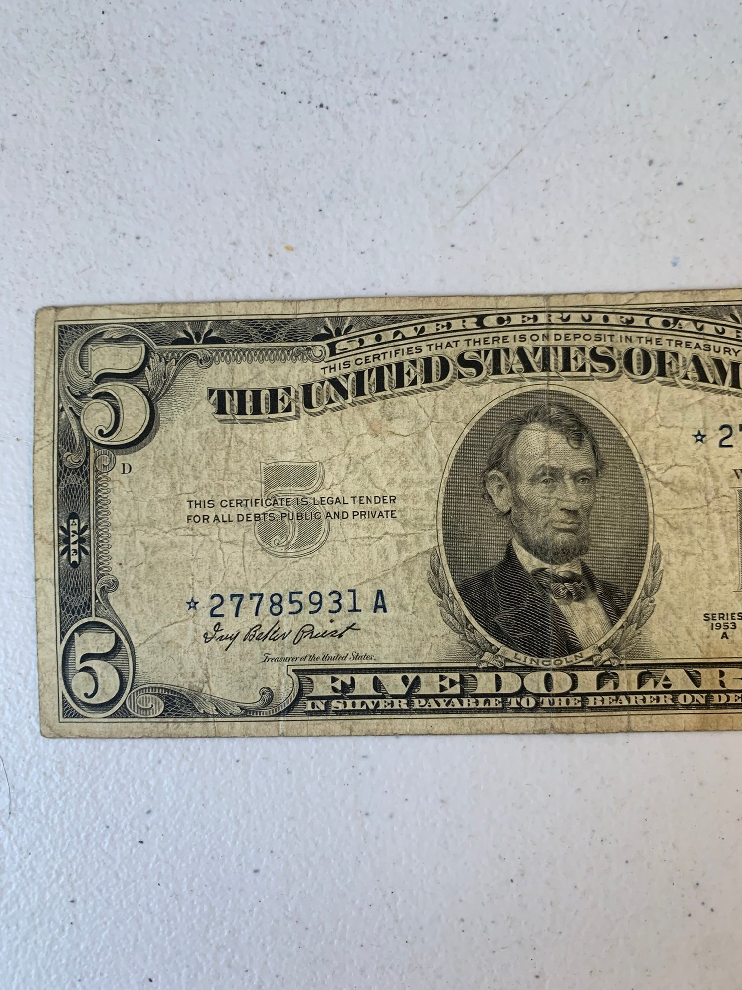 1953 A $5 DOLLAR SILVER CERTIFICATE STAR NOTE, 27785931A
