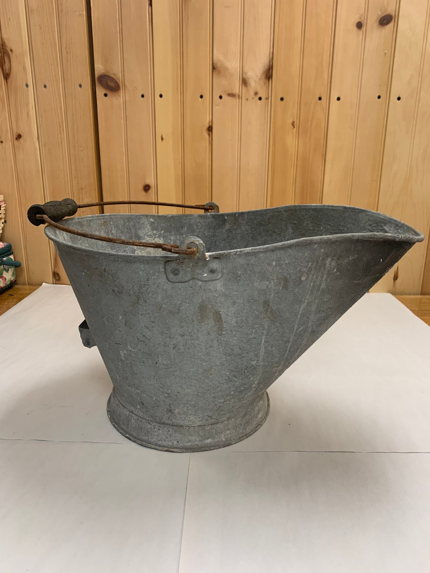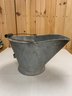 GALVANIZED ASH BUCKET WITH WOOD HANDLE HANDLE HAS CRACK AS SHOWN